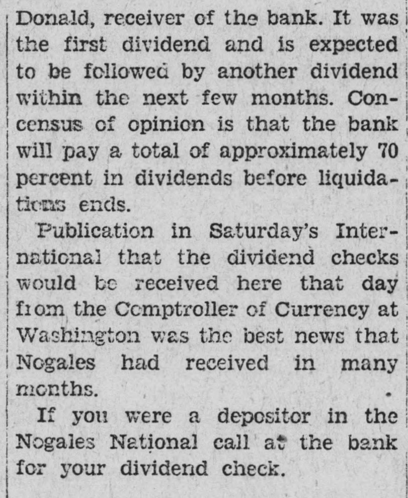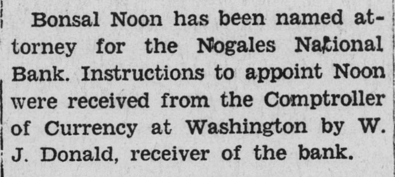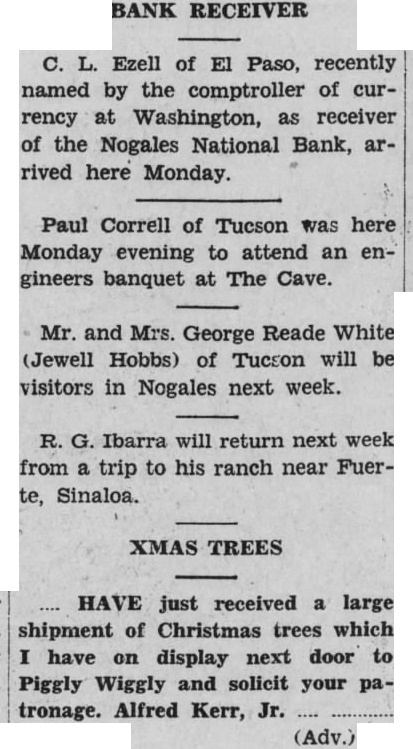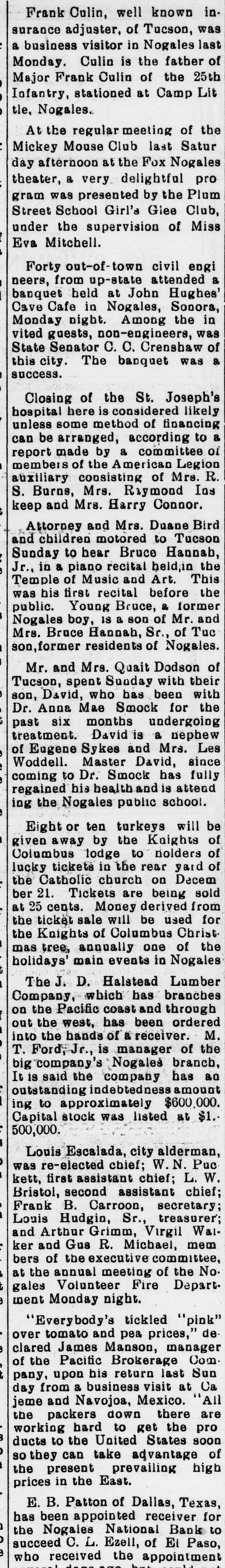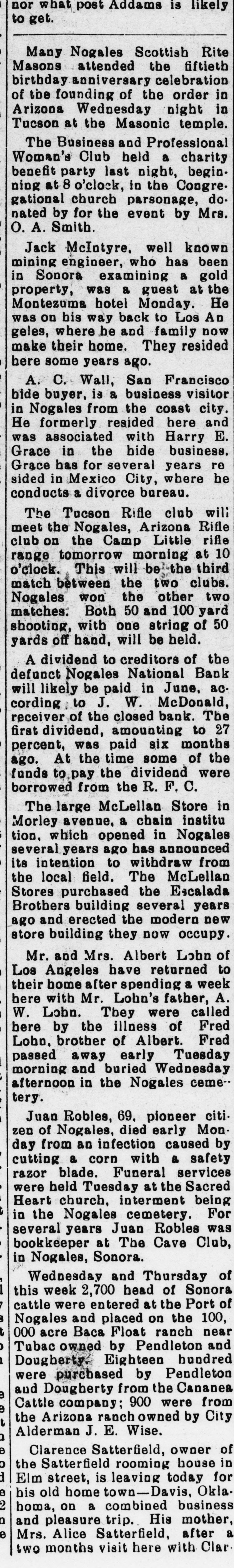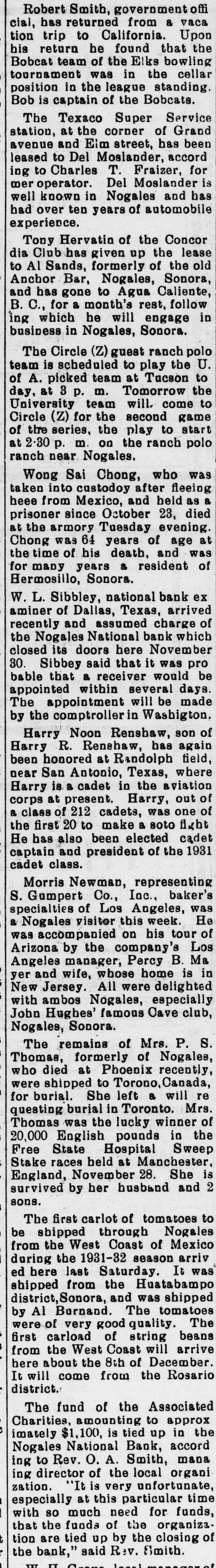 Robert Smith, government ciai, has returned from a vaca tion trip to California. Upon be the team of the his Bobcat return found Elks that bowling cellar tournament was in the in the league standing of position Bob is captain the Bobcats. The Texaco Super Service at the corner of Grand Eim street, been Del station, avenue leased to and Moslander, has accord for ing to Charles T. Fraizer, mer operator. Del Moslander well known in Nogales and has had over ten years of automobile experience. Tony Hervatin of the Concor dia Club has given up the lease to Al Sands, formerly of the old Anchor Bar, Nogales, Sonora, and has gone to Agua Caliente, a he engage in ing B.C., which for month's will rest, follow business in Nogales, Sonora. The Circle (Z) guest ranch polo team is scheduled to play the U. of A. picked team at Tucson to day, at 3 p. m. Tomorrow the University team will. come to Circle (Z) for the second game the at m. on the of 2.30 the series, p. play ranch to start polo ranch near Nogales. Wong Sai Chong, who was taken into custodoy after fleeing heee from Mexico, and held as since October 23, died was 64 years at Chong prisoner the armory Tuesday of evening. age his was for a of the many time of years death, resident and Hermosillo, Sonora. W. L. Sibbley, national bank ex of Texas, arrived and of National recently the aminer Nogales Dallas, assumed bank charge which doors here said was pro 30. closed Sibbey its that it November a within The appointed bable appointment that receiver several will would be days. made be by the comptroller in Washigton. Harry Noon Renshaw, son of Harry R. Renehaw, has again been honored at Randolph field, is a cadet in near Harry San Antonio, Texas, the aviation out where at present. Harry, of 212 was one of to make a soto corps the class first of 20 cadets, fight been cadet and captain He has also president elected of the 1931 cadet class. Morris Newman, representing S. Gumpert Co., Inc., baker's specialties of Los Angeles, was a visitor this week. He was on of the Arizona Nogales accompanied by company's his tour B. Los Ma Angeles manager, Percy yer and wife, whose home is in New Jersey. All were delighted with ambos Nogales, especially John Hughes' famous Cave club, Nogales, Sonora. The remains of Mrs. P. S. Thomas, formerly of Nogales, who died at Phoenix recently, were shipped to Torono,Canada, She a re burial in for questing burial. left Toronto. will Mrs. was the of 20,000 Thomas English pounds lucky winner in the Free State Hospital Sweep Stake races held at Manchester, England, November 28. She survived by her husband and 2 sons. The first carlot of tomatoes to be shipped through Nogales from the West Coast of Mexico during the 1931-32 season arriv ed here last Saturday. It was from the was shipped district, Sonora, and Huatabampo shipped by Al Burnand. The tomatoes were of very good quality. The first carload of string beans from the West Coast will arrive here about the 8th of Dacember. It will come from the Rosario district. The fund of the Associated Charities, amounting to approx is tied up National imately Nogales $1,100, Bank, accord in the ing to Rev. O. A. Smith, mana ing director of the local organi zation. 'It is very unfortunate, especially at this particular time with so much need for funds, that the funds of the organization are tied up by the closing of the bank," said Rev. Smith.