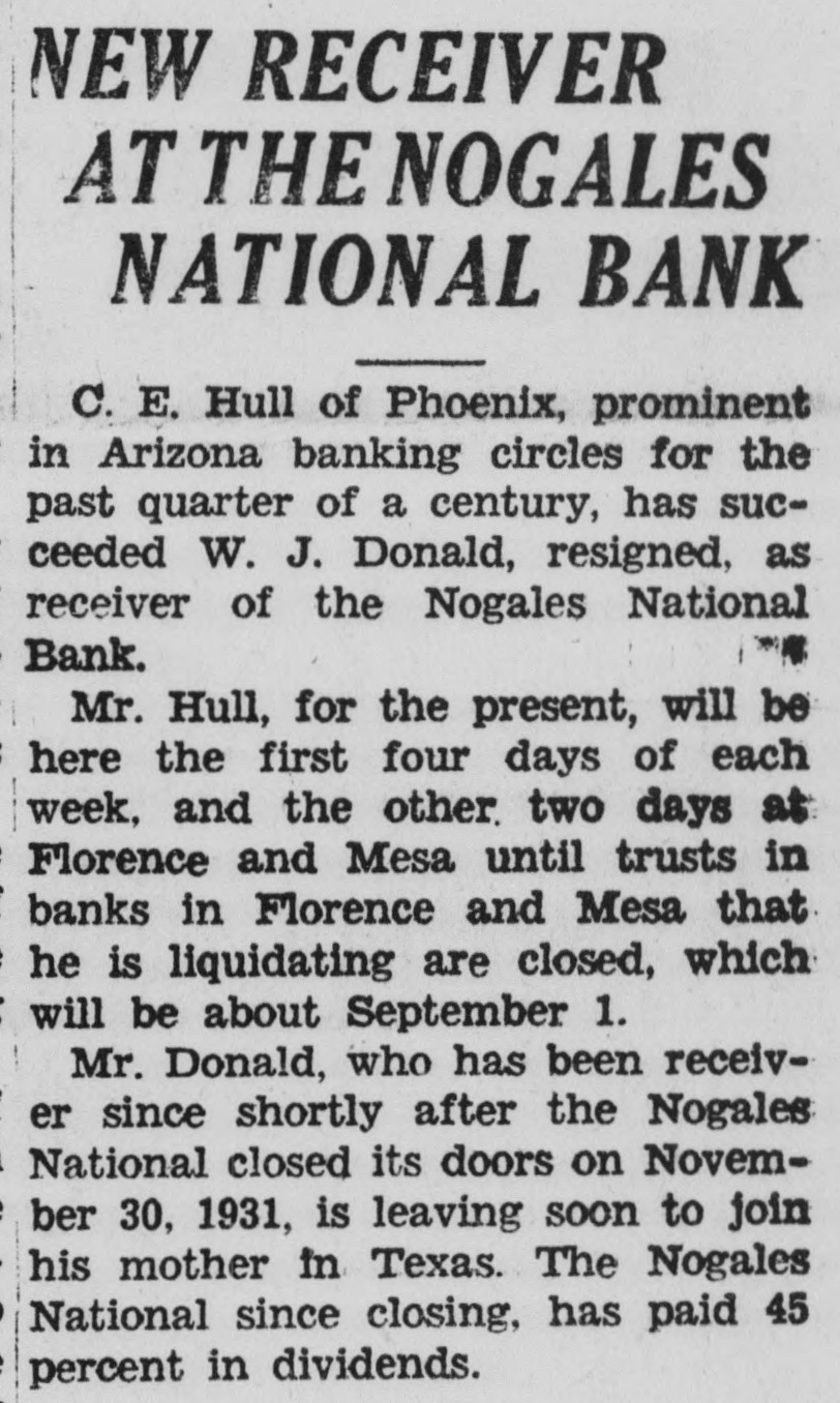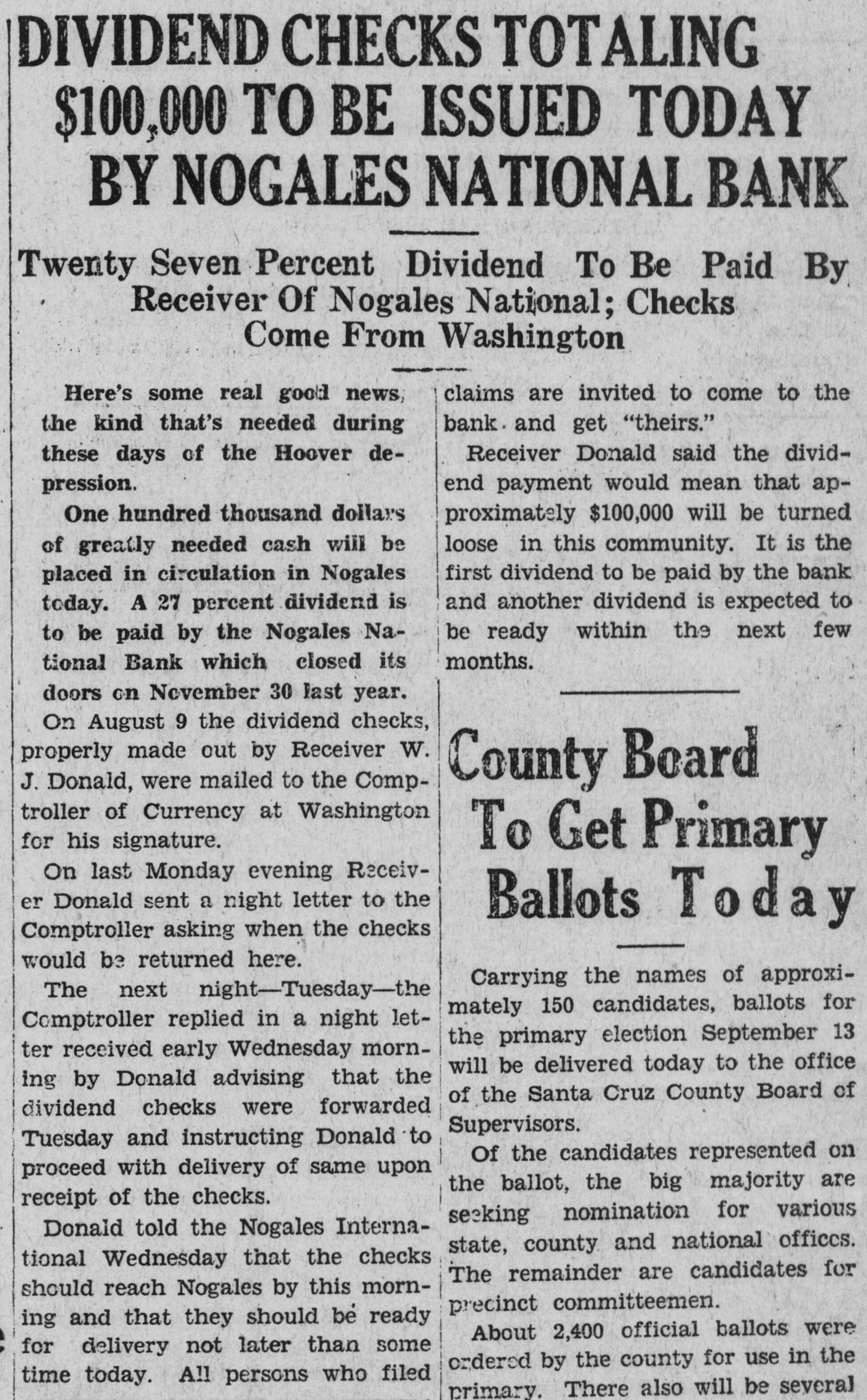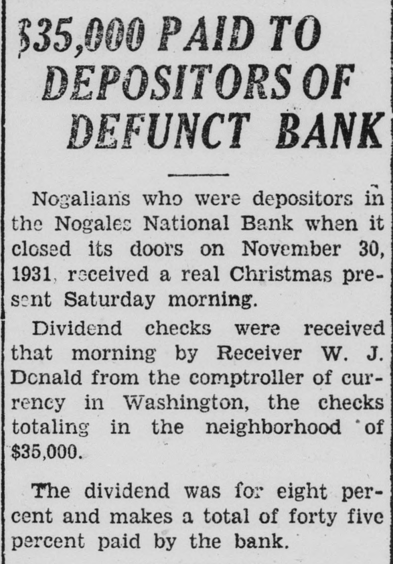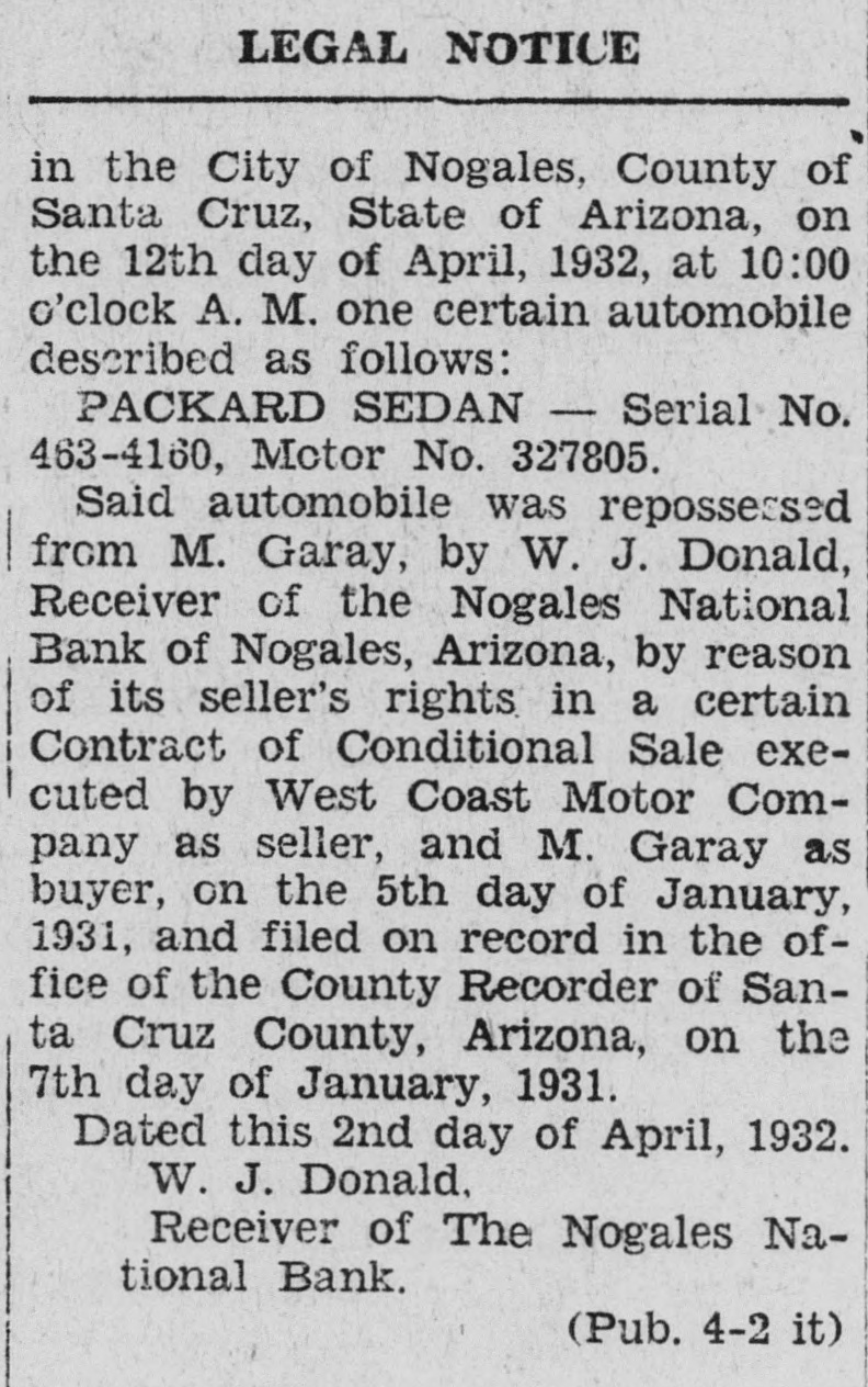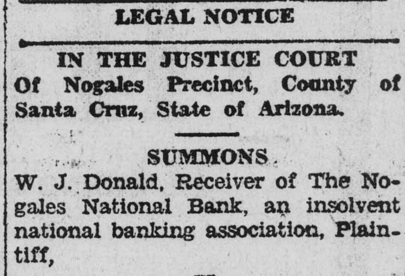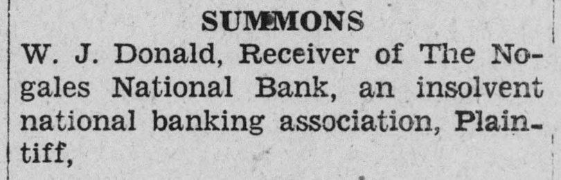 Robert Smith, government ciai, has returned from a vaca tion trip to California. Upon be the team of the his Bobcat return found Elks that bowling cellar tournament was in the in the league standing of position Bob is captain the Bobcats. The Texaco Super Service at the corner of Grand Eim street, been Del station, avenue leased to and Moslander, has accord for ing to Charles T. Fraizer, mer operator. Del Moslander well known in Nogales and has had over ten years of automobile experience. Tony Hervatin of the Concor dia Club has given up the lease to Al Sands, formerly of the old Anchor Bar, Nogales, Sonora, and has gone to Agua Caliente, a he engage in ing B.C., which for month's will rest, follow business in Nogales, Sonora. The Circle (Z) guest ranch polo team is scheduled to play the U. of A. picked team at Tucson to day, at 3 p. m. Tomorrow the University team will. come to Circle (Z) for the second game the at m. on the of 2.30 the series, p. play ranch to start polo ranch near Nogales. Wong Sai Chong, who was taken into custodoy after fleeing heee from Mexico, and held as since October 23, died was 64 years at Chong prisoner the armory Tuesday of evening. age his was for a of the many time of years death, resident and Hermosillo, Sonora. W. L. Sibbley, national bank ex of Texas, arrived and of National recently the aminer Nogales Dallas, assumed bank charge which doors here said was pro 30. closed Sibbey its that it November a within The appointed bable appointment that receiver several will would be days. made be by the comptroller in Washigton. Harry Noon Renshaw, son of Harry R. Renehaw, has again been honored at Randolph field, is a cadet in near Harry San Antonio, Texas, the aviation out where at present. Harry, of 212 was one of to make a soto corps the class first of 20 cadets, fight been cadet and captain He has also president elected of the 1931 cadet class. Morris Newman, representing S. Gumpert Co., Inc., baker's specialties of Los Angeles, was a visitor this week. He was on of the Arizona Nogales accompanied by company's his tour B. Los Ma Angeles manager, Percy yer and wife, whose home is in New Jersey. All were delighted with ambos Nogales, especially John Hughes' famous Cave club, Nogales, Sonora. The remains of Mrs. P. S. Thomas, formerly of Nogales, who died at Phoenix recently, were shipped to Torono,Canada, She a re burial in for questing burial. left Toronto. will Mrs. was the of 20,000 Thomas English pounds lucky winner in the Free State Hospital Sweep Stake races held at Manchester, England, November 28. She survived by her husband and 2 sons. The first carlot of tomatoes to be shipped through Nogales from the West Coast of Mexico during the 1931-32 season arriv ed here last Saturday. It was from the was shipped district, Sonora, and Huatabampo shipped by Al Burnand. The tomatoes were of very good quality. The first carload of string beans from the West Coast will arrive here about the 8th of Dacember. It will come from the Rosario district. The fund of the Associated Charities, amounting to approx is tied up National imately Nogales $1,100, Bank, accord in the ing to Rev. O. A. Smith, mana ing director of the local organi zation. 'It is very unfortunate, especially at this particular time with so much need for funds, that the funds of the organization are tied up by the closing of the bank," said Rev. Smith.
