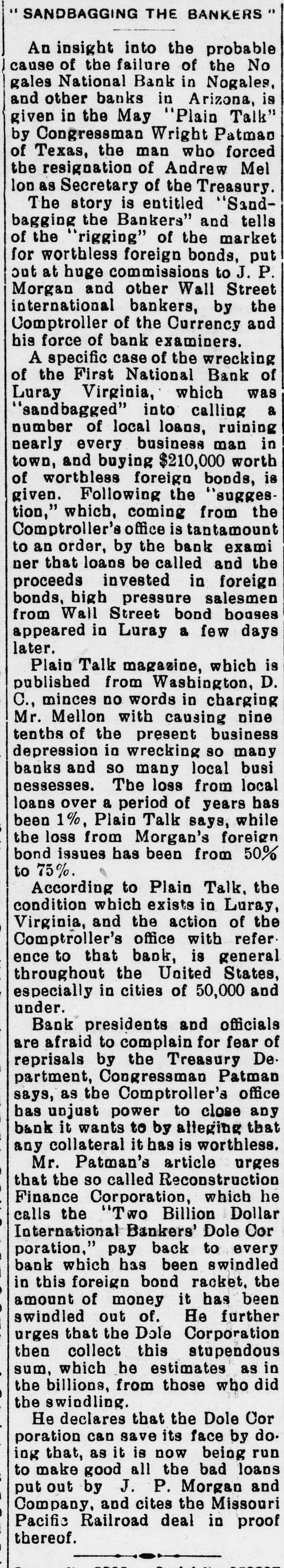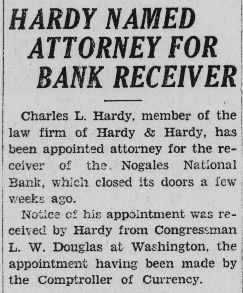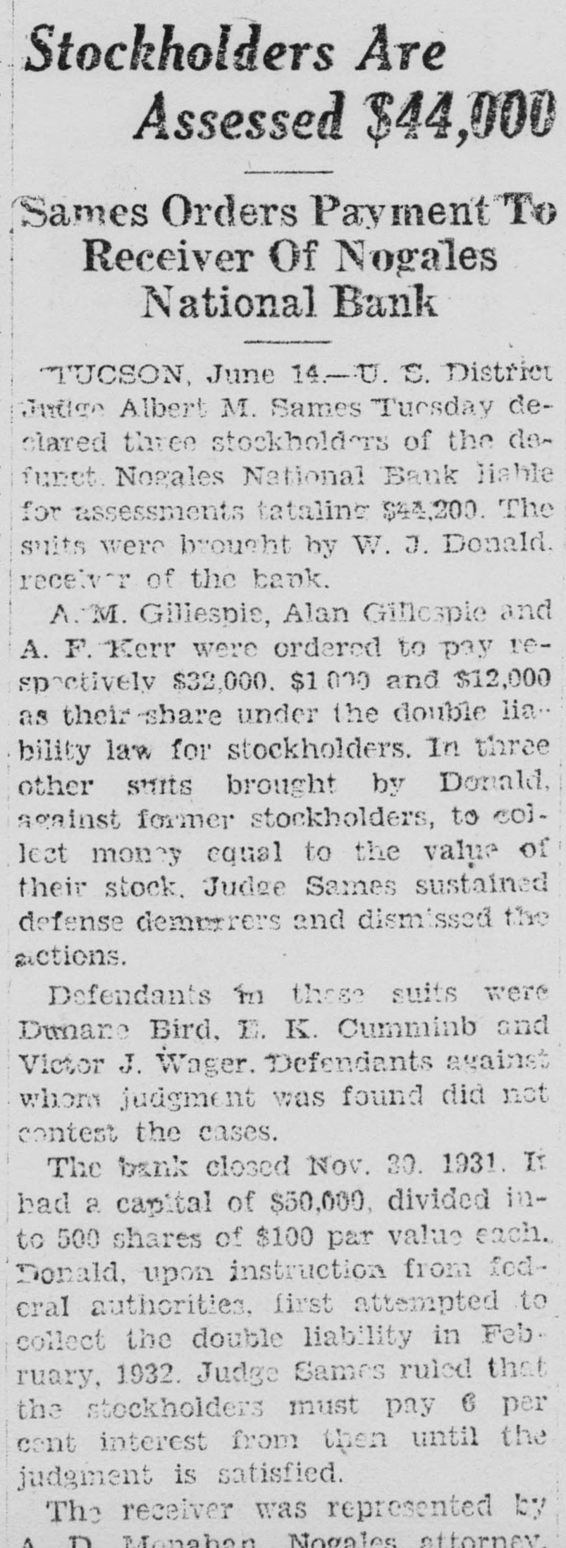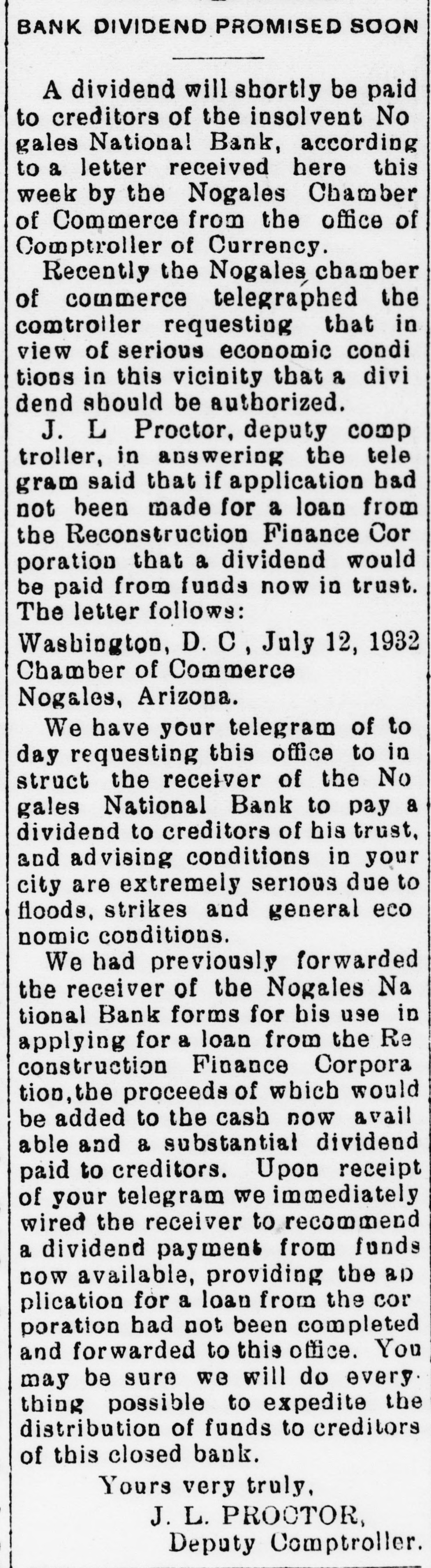 Robert Smith, government ciai, has returned from a vaca tion trip to California. Upon be the team of the his Bobcat return found Elks that bowling cellar tournament was in the in the league standing of position Bob is captain the Bobcats. The Texaco Super Service at the corner of Grand Eim street, been Del station, avenue leased to and Moslander, has accord for ing to Charles T. Fraizer, mer operator. Del Moslander well known in Nogales and has had over ten years of automobile experience. Tony Hervatin of the Concor dia Club has given up the lease to Al Sands, formerly of the old Anchor Bar, Nogales, Sonora, and has gone to Agua Caliente, a he engage in ing B.C., which for month's will rest, follow business in Nogales, Sonora. The Circle (Z) guest ranch polo team is scheduled to play the U. of A. picked team at Tucson to day, at 3 p. m. Tomorrow the University team will. come to Circle (Z) for the second game the at m. on the of 2.30 the series, p. play ranch to start polo ranch near Nogales. Wong Sai Chong, who was taken into custodoy after fleeing heee from Mexico, and held as since October 23, died was 64 years at Chong prisoner the armory Tuesday of evening. age his was for a of the many time of years death, resident and Hermosillo, Sonora. W. L. Sibbley, national bank ex of Texas, arrived and of National recently the aminer Nogales Dallas, assumed bank charge which doors here said was pro 30. closed Sibbey its that it November a within The appointed bable appointment that receiver several will would be days. made be by the comptroller in Washigton. Harry Noon Renshaw, son of Harry R. Renehaw, has again been honored at Randolph field, is a cadet in near Harry San Antonio, Texas, the aviation out where at present. Harry, of 212 was one of to make a soto corps the class first of 20 cadets, fight been cadet and captain He has also president elected of the 1931 cadet class. Morris Newman, representing S. Gumpert Co., Inc., baker's specialties of Los Angeles, was a visitor this week. He was on of the Arizona Nogales accompanied by company's his tour B. Los Ma Angeles manager, Percy yer and wife, whose home is in New Jersey. All were delighted with ambos Nogales, especially John Hughes' famous Cave club, Nogales, Sonora. The remains of Mrs. P. S. Thomas, formerly of Nogales, who died at Phoenix recently, were shipped to Torono,Canada, She a re burial in for questing burial. left Toronto. will Mrs. was the of 20,000 Thomas English pounds lucky winner in the Free State Hospital Sweep Stake races held at Manchester, England, November 28. She survived by her husband and 2 sons. The first carlot of tomatoes to be shipped through Nogales from the West Coast of Mexico during the 1931-32 season arriv ed here last Saturday. It was from the was shipped district, Sonora, and Huatabampo shipped by Al Burnand. The tomatoes were of very good quality. The first carload of string beans from the West Coast will arrive here about the 8th of Dacember. It will come from the Rosario district. The fund of the Associated Charities, amounting to approx is tied up National imately Nogales $1,100, Bank, accord in the ing to Rev. O. A. Smith, mana ing director of the local organi zation. 'It is very unfortunate, especially at this particular time with so much need for funds, that the funds of the organization are tied up by the closing of the bank," said Rev. Smith.