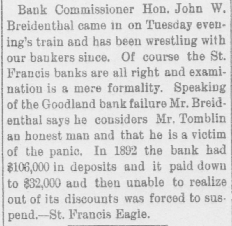 Bank Commissioner Hon. John W. Breidenthal came in on Tuesday evening's train and has been wrestling with our bankers since. Of course the St. Francis banks are all right and examination is a mere formality. Speaking of the Goodland bank failure Mr. Breidenthal says he considers Mr. Tomblin an honest man and that he is a victim of the panic. In 1892 the bank had $106,000 in deposits and it paid down to $32,000 and then unable to realize out of its discounts was forced to suspend.-St. Francis Eagle.
