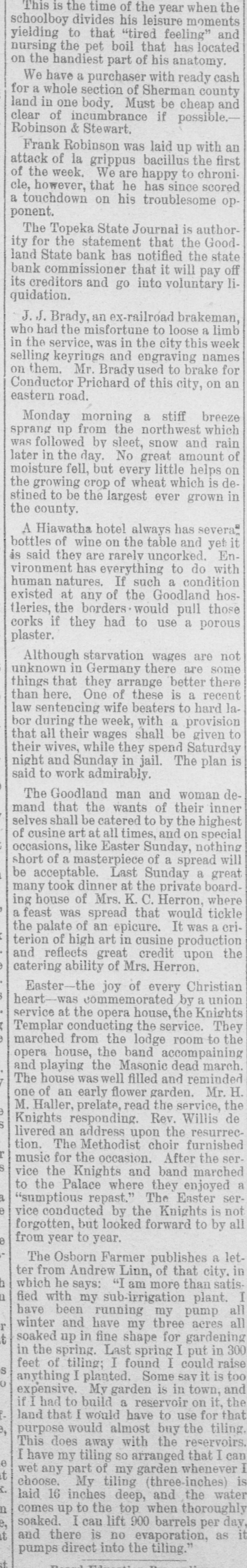 This is the time of the year when the schoolboy divides his leisure moments yielding to that "tired feeling" and nursing the pet boil that has located on the handiest part of his anatomy. We have a purchaser with ready cash for a whole section of Sherman county land in one body. Must be cheap and clear of incumbrance if possible.Robinson & Stewart. Frank Robinson was laid up with an attack of la grippus bacillus the first of the week. We are happy to chronicle, however, that he has since scored a touchdown on his troublesome opponent. The Topeka State Journal is authority for the statement that the Goodland State bank has notified the state bank commissioner that it will pay off its creditors and go into voluntary liquidation. J. J. Brady, an ex-railroad brakeman, who had the misfortune to loose a limb in the service, was in the city this week selling keyrings and engraving names on them. Mr. Brady used to brake for Conductor Prichard of this city, on an eastern road. Monday morning a stiff breeze sprang up from the northwest which was followed by sleet, snow and rain later in the day. No great amount of moisture fell, but every little helps on the growing crop of wheat which is destined to be the largest ever grown in the county. A Hiawatha hotel always has severa* bottles of wine on the table and yet it is said they are rarely uncorked. Environment has everything to do with human natures. If such a condition existed at any of the Goodland hostleries, the borders would pull those corks if they had to use a porous plaster. Although starvation wages are not unknown in Germany there are some things that they arrange better there than here. One of these is a recent law sentencing wife beaters to hard labor during the week, with a provision that all their wages shall be given to their wives, while they spend Saturday night and Sunday in jail. The plan is said to work admirably. The Goodland man and woman demand that the wants of their inner selves shall be catered to by the highest of cusine art at all times, and on special occasions, like Easter Sunday, nothing short of a masterpiece of a spread will be acceptable. Last Sunday a great many took dinner at the private boarding house of Mrs. K. C. Herron, where a feast was spread that would tickle the palate of an epicure. It was a criterion of high art in cusine production and reflects great credit upon the catering ability of Mrs. Herron. Easter-the joy of every Christian heart-was commemorated by a union service at the opera house, the Knights Templar conducting the service. They marched from the lodge room to the opera house, the band accompaining and playing the Masonic dead march. The house was well filled and reminded one of an early flower garden. Mr. H. M. Haller, prelate, read the service, the Knights responding. Rev. Willis de livered an address upon the resurrec-
