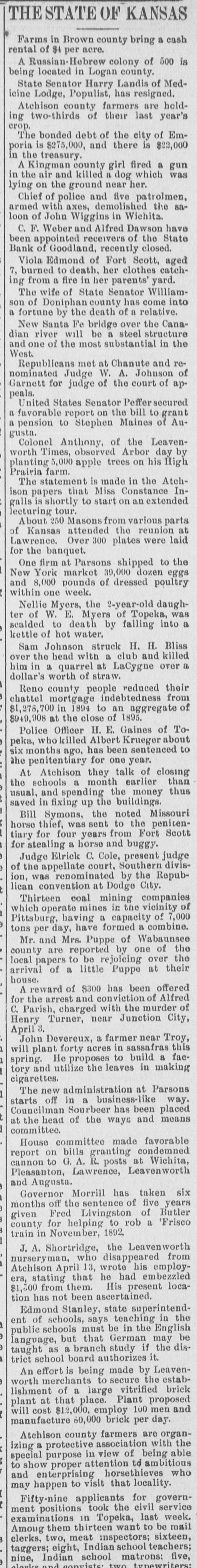 THE STATE OF KANSAS Farms in Brown county bring a cash rental of $4 per acre. A. Russian-Hebrew colony of 500 is being located in Logan county. State Senator Harry Landis of Medicine Lodge, Populist, has resigned. Atchison county farmers are holding two-thirds of their last year's crop. The bonded debt of the city of Emporia is $275,000, and there is $22,000 in the treasury. und B person [11].8 County V in the air and killed a dog which was lying on the ground near her. Chief of police and five patrolmen, armed with axes, demolished the saloon of John Wiggins in Wichita. C. F. Weber and Alfred Dawson have been appointed receivers of the State Bank of Goodland, recently closed. Viola Edmond of Fort Scott, aged 7, burned to death, her clothes catching from a fire in her parents' yard. The wife of State Senator Williamson of Doniphan county has come into a fortune by the death of a relative. New Santa Fe bridge over the Canadian river will be a steel structure and one of the most substantial in the West. Republicans met at Chanute and renominated Judge W. A. Johnson of Garnett for judge of the court of appeals. United States Senator Peffer secured quant 01 1119 the uo report B a pension to Stephen Maines of Augusta. Colonel Anthony, of the Leavenworth Times, observed Arbor day by planting 5,000 apple trees on his High Prairia farm. The statement is made in the Atchison papers that Miss Constance Inextended uu uo state 07 should s! a lecturing tour. About 250 Masons from various parts of Kansas attended the reunion at Lawrence. Over 300 plates were laid for the banquet. One firm at Parsons shipped to the New York market 39,000 dozen eggs and 8,000 pounds of dressed poultry within one week. Nellie Myers, the 2-year-old daughter of W. E. Myers of Topeka, was scalded to death by falling into a kettle of hot water. Sam Johnson struck H. H. Bliss over the head with a club and killed " JOAO 78 quarrel B up min dollar's worth of straw. Reno county people reduced their chattel mortgage indebtedness from JO UB 04 1894 up $1,278'70 1895. JO close the 78 806'6+6$ Police Officer H. E. Gaines of Topeka, who killed Albert Krueger about six months ago, has been sentenced to the penitentiary for one year. At Atchison they talk of closing the schools a month earlier than usual, and spending the money thus saved in fixing up the buildings. Bill Symons, the noted Missouri horse thief, was sent to the penitentiary for four years from Fort Scott for stealing a horse and buggy. Judge Elrick C. Cole, present judge of the appellate court, Southern division, was renominated by the Republican convention at Dodge City. Thirteen coal mining companies which operate mines in the vicinity of Pittsburg, having a capacity of 7,000 tons per day, have formed a combine. Mr. and Mrs. Puppe of Wabaunsee county are reported by one of the local papers to be rejoicing over the arrival of a little Puppe at their house. A reward of $300 has been offered for the arrest and conviction of Alfred C. Parish, charged with the murder of Henry Turner, near Junction City, '8 April John Devereux, a farmer near Troy, will plant forty acres in sassafras this spring. He proposes to build a factory and utilize the leaves in making cigarettes. The new administration at Parsons starts off in a business-like way. Councilman Sourbeer has been placed at the head of the ways and means committee. House committee made favorable report on bills granting condemned cannon to G. A. R. posts at Wichita, Pleasanton, Lawrence, Leavenworth pus Governor Morrill has taken six months off the sentence of five years given Fred Livingston of Butler county for helping to rob a 'Frisco train in November, 1892.