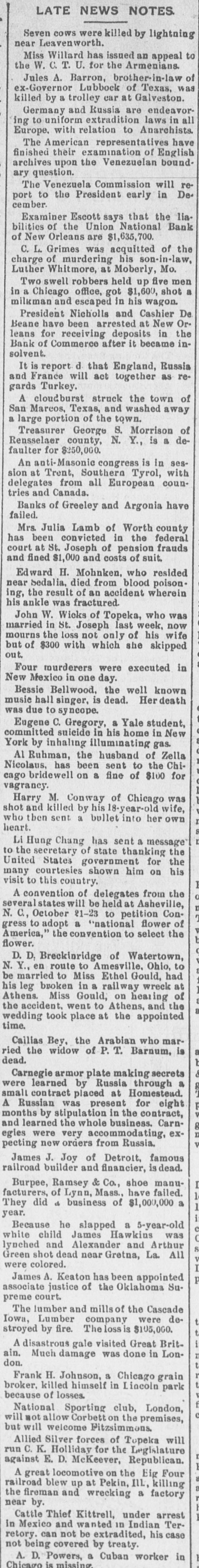 LATE NEWS NOTES. Seven cows were killed by lightning near Leavenworth. Miss Willard has issued an appeal to the W. C. T. U. for the Armenians. Jules A. Barron, brother-in-law of ex-Governor Lubbock of Texas, was killed by a trolley car at Galveston. Germany and Russia are endeavoring to uniform extradition laws in all Europe. with relation to Anarchists. The American representatives have finished their examination of English archives upon the Venezuelan boundary question. The Venezuela Commission will report to the President early in De. cember. Examiner Escott says that the liabilities of the Union National Bank of New Orleans are $1,635,700. C. L. Grimes was acquitted of the charge of murdering his son-in-law, Luther Whitmore, at Moberly, Mo. Two swell robbers held up five men in a Chicago office, got $1,600, shot a milkman and escaped in his wagon. President Nicholls and Cashier De Beane have been arrested at New Or. leans for receiving deposits in the Bank of Commerce after it became insolvent. It is report d that England, Russia and France will act together as regards Turkey. A cloudburst struck the town of San Marcos, Texas, and washed away a large portion of the town. Treasurer George S. Morrison of Rensselaer county, N. Y., is a defaulter for $250,000. An anti-Masonic congress is in session at Trent, Southern Tyrol, with delegates from all European countries and Canada. Banks of Greeley and Argonia have failed. Mrs. Julia Lamb of Worth county has been convicted in the federal court at St. Joseph of pension frauds and fined $1,000 and costs of suit. Edward H. Mohnken, who resided near Sedalia, died from blood poisoning, the result of an accident wherein his ankle was fractured. John W. Wicks of Topeka, who was married in St. Joseph last week, now mourns the loss not only of his wife but of $300 with which she skipped out. Four murderers were executed in New Mexico in one day. Bessie Bellwood, the well known music hall singer, is dead. Her death was due to syncope. Eugene C. Gregory, a Yale student, committed suicide in his home in New York by inhaling illuminating gas. Al Ruhman, the husband of Zella Nicolaus, has been sent to the Chicago bridewell on a fine of $100 for vagrancy. Harry M. Conway of Chicago was shot and killed by his 18-year-old wife, who then sent a bullet into her own heart. Li Hung Chang has sent a message to the secretary of state thanking the United States government for the many courtesies shown him on his visit to this country. I A convention of delegates from the 0 several states will be held at Asheville, N. C., October 21-23 to petition Congress to adopt a "national flower of America," the convention to select the flower. D. D. Breckinridge of Watertown, N. Y., en route to Amesville, Ohio, to be married to Miss Ethel Gould, had his leg broken in a rail way wreck at Athens. Miss Gould, on hearing of the accident, went to Athens, and the B wedding took place at the appointed time. Callias Bey. the Arabian who married the widow of P. T. Barnum, is dead. & Carnegie armor plate making secrets were learned by Russia through a small contract placed at Homestead. A Russian was present for eight months by stipulation in the contract, and learned the whole business. Carnegies were very accommodating, expecting new orders from Russia. James J. Joy of Detroit, famous railroad builder and financier, is dead. Burpee, Ramsey & Co., shoe manufacturers, of Lynn, Mass., have failed. They did d business of $1,000,000 a year. Because he slapped a 5-year-old white child James Hawkins was lynched and Alexander and Arthur S Green shot dead near Gretna, La. All were colored. James A. Keaton has been appointed P associate justice of the Oklahoma Supreme court. The lumber and mills of the Cascade Iowa, Lumber company were det stroyed by fire. The loss is $105,000. A disastrous gale visited Great Britain. Much damage was done in London. Frank H. Johnson, a Chicago grain broker, killed himself in Lincoln park because of losses. National Sporting club, London, will not allow Corbett on the premises, but will welcome Fitzsimmons. Allied Silver forces of Topeka will run C. K. Holliday for the Legislature against E. D. McKeever, Republican. A great locomotive on the Eig Four railroad blew up at Pekin, ILL, killing the fireman and wrecking a factory near by. Cattle Thief Kittrell, under arrest in Mexico and wanted in Indian Terretory. can not be extradited, his case not being covered by treaty. A. D. Powers, a Cuban worker in Chicago is missing.