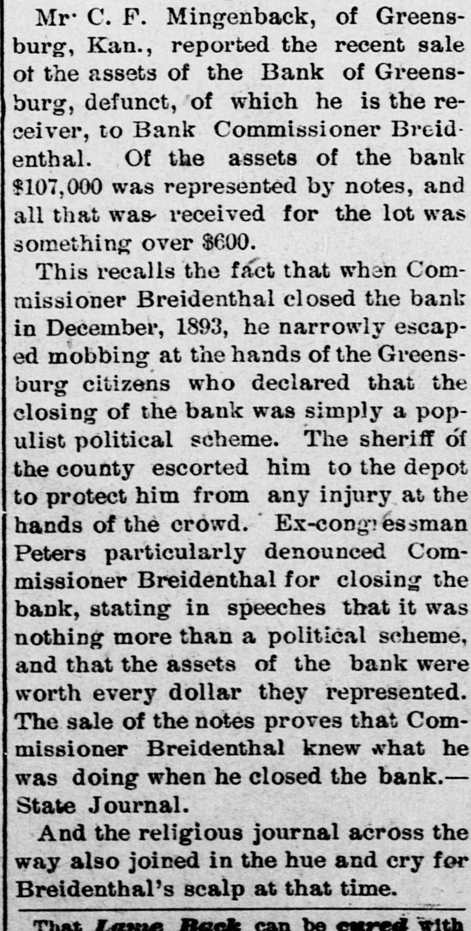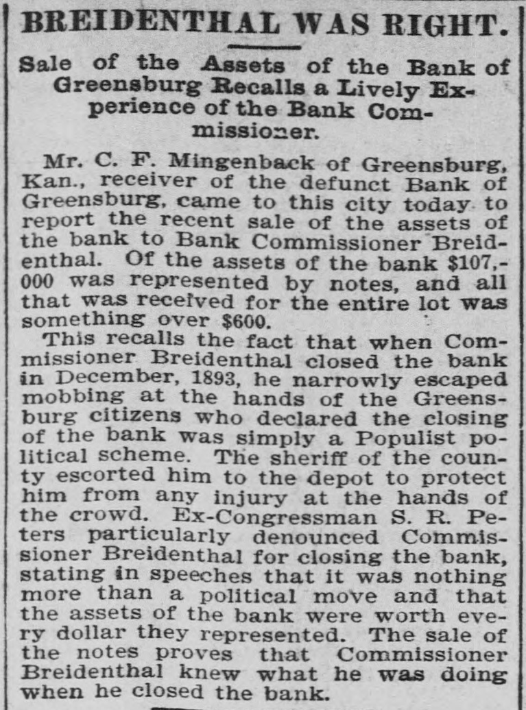 BREIDENTHAL WAS RIGHT. Sale of the Assets of the Bank of Greensburg Recalls a Lively Experience of the Bank Commissioner. Mr. C. F. Mingenback of Greensburg, Kan., receiver of the defunct Bank of Greensburg, came to this city today. to report the recent sale of the assets of the bank to Bank Commissioner Breidenthal. Of the assets of the bank $107,000 was represented by notes, and all that was received for the entire lot was something over $600. This recalls the fact that when Commissioner Breidenthal closed the bank in December, 1893, he narrowly escaped mobbing at the hands of the Greensburg citizens who declared the closing of the bank was simply a Populist political scheme. The sheriff of the county escorted him to the depot to protect him from any injury at the hands of the crowd. Ex-Congressman S. R. Peters particularly denounced Commissioner Breidenthal for closing the bank, stating in speeches that it was nothing more than a political move and that the assets of the bank were worth every dollar they represented. The sale of the notes proves that Commissioner Breidenthal knew what he was doing when he closed the bank.
