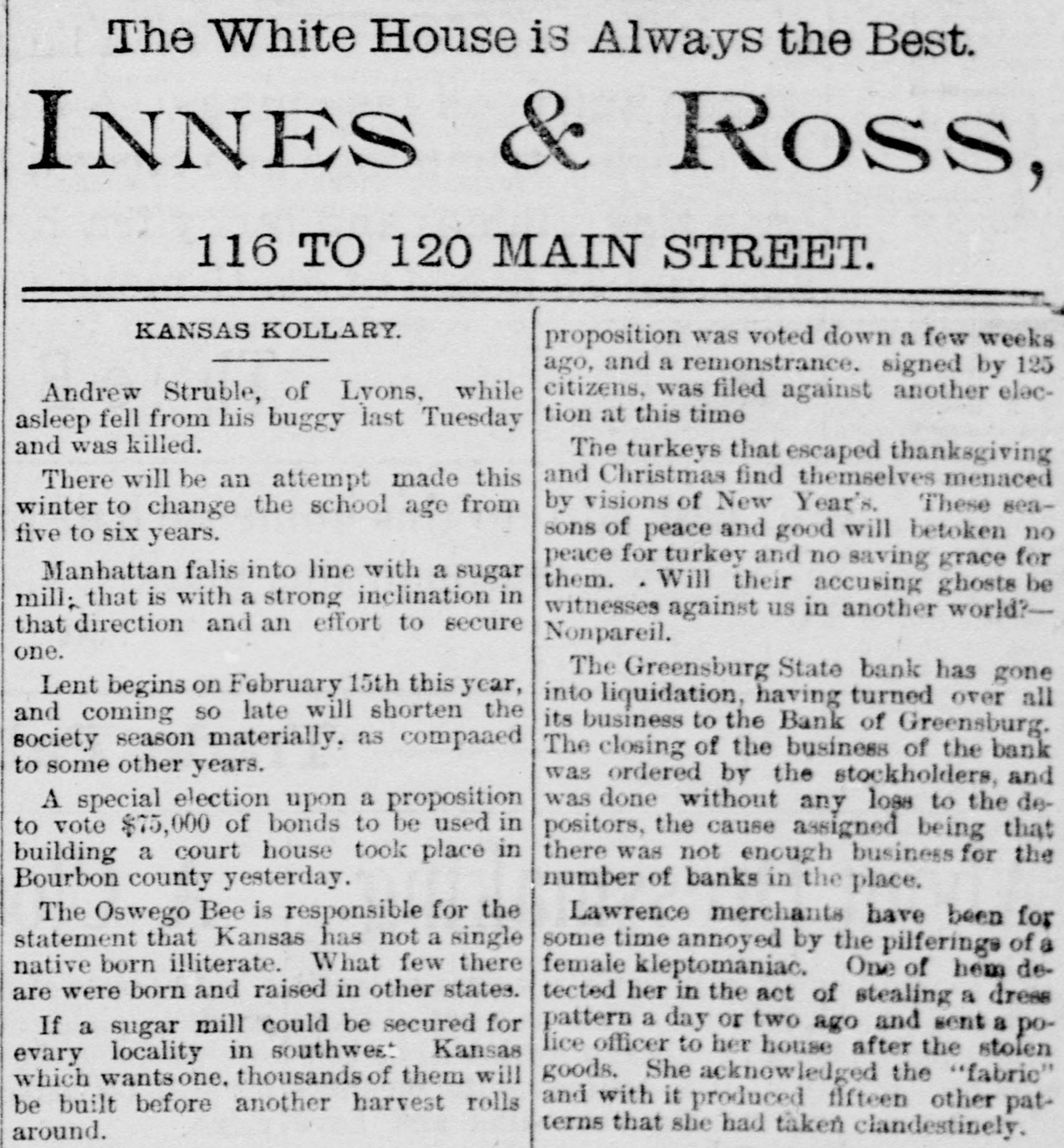 The White House is Always the Best. INNES & Ross, 116 TO 120 MAIN STREET. KANSAS KOLLARY. proposition was voted down a few weeks ago, and a remonstrance. signed by 125 citizens, was filed against another elecAndrew Struble, of Lyons, while tion at this time asleep fell from his buggy last Tuesday and was killed. The turkeys that escaped thanksgiving and Christmas find themselves menaced There will be an attempt made this by visions of New Year's. These seawinter to change the school age from sons of peace and good will betoken no five to six years. peace for turkey and no saving grace for Manhattan falis into line with a sugar them. Will their accusing ghosts be mill; that is with a strong inclination in witnesses against us in another world?that direction and an effort to secure Nonpareil. one. The Greensburg State bank has gone Lent begins on February 15th this year, into liquidation, having turned over all and coming so late will shorten the its business to the Bank of Greensburg. society season materially. as compaaed The closing of the business of the bank to some other years. was ordered by the stockholders, and A special election upon a proposition was done without any loss to the deto vote $75,000 of bonds to be used in positors, the cause assigned being that there was not enough business for the building a court house took place in Bourbon county yesterday. number of banks in the place. The Oswego Bee is responsible for the Lawrence merchants have been for statement that Kansas has not a single some time annoyed by the pilferings of a native born illiterate. What few there female kleptomaniac. One of hem deare were born and raised in other states. tected her in the act of stealing a dress pattern a day or two ago and sent a poIf a sugar mill could be secured for lice officer to her house after the stolen evary locality in southwest Kansas goods. She acknowledged the "fabric" which wantsone. thousands of them will be built before another harvest rolls and with it produced fifteen other pataround. terns that she had taken clandestinely.