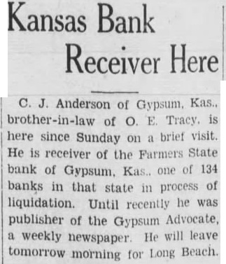 Kansas Bank Receiver Here Anderson of Gypsum. Kas., of Tracy. here since Sunday on brief visit. He is receiver of the Farmers State bank of Gypsum. Kas.. one of 134 banks in that state in process of liquidation. Until recently he was publisher of the Gypsum Advocate, weekly newspaper He will leave tomorrow Long Beach. morning for