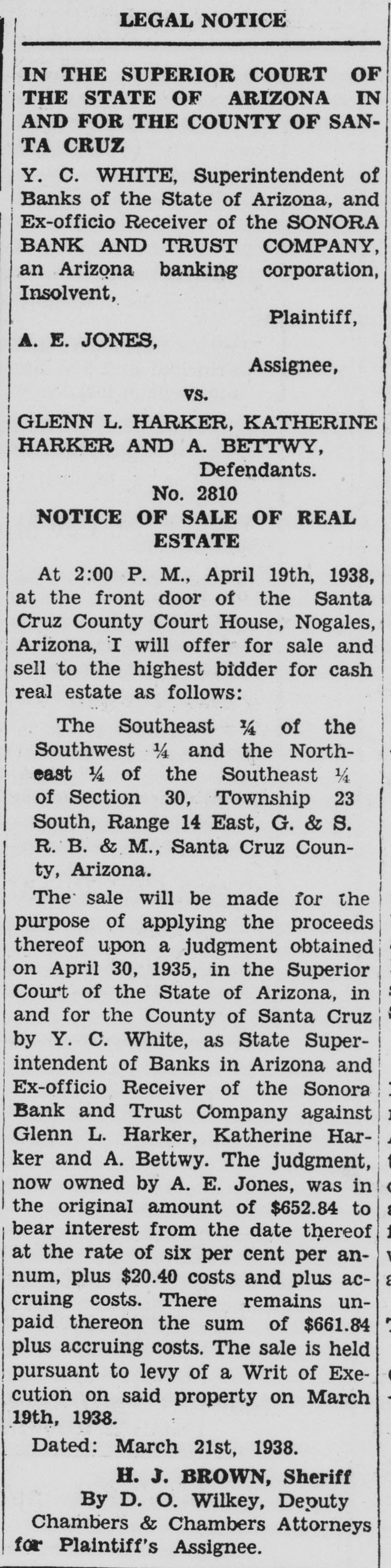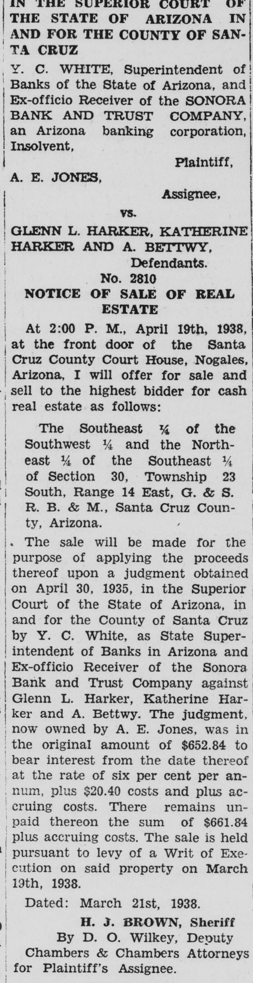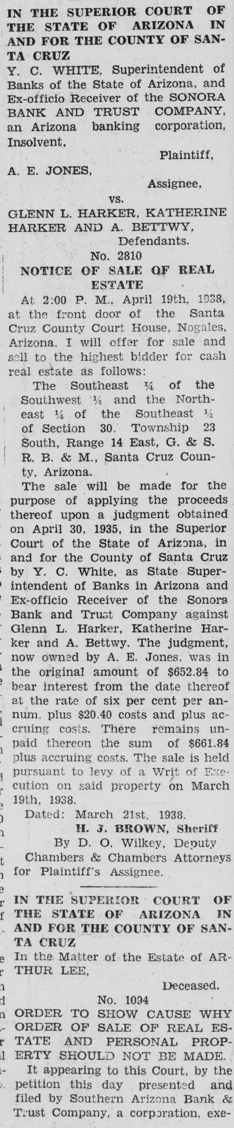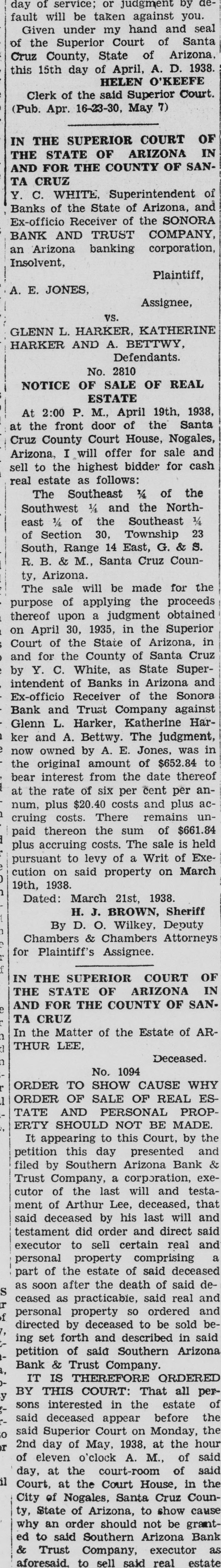 day of service; or judgment by default will be taken against you. Given under my hand and seal of the Superior Court of Santa Cruz County, State of Arizona, this 15th day of April, A. D. 1938. HELEN O'KEEFE Clerk of the said Superior Court. (Pub. Apr. 16-23-30, May 7) IN THE SUPERIOR COURT OF THE STATE OF ARIZONA IN AND FOR THE COUNTY OF SANTA CRUZ Y. C. WHITE. Superintendent of Banks of the State of Arizona, and Ex-officio Receiver of the SONORA BANK AND TRUST COMPANY, an Arizona banking corporation, Insolvent, Plaintiff, A. E. JONES. Assignee, vs. GLENN L. HARKER, KATHERINE HARKER AND A. BETTWY, Defendants. No. 2810 NOTICE OF SALE OF REAL ESTATE At 2:00 P. M., April 19th, 1938, at the front door of the Santa Cruz County Court House, Nogales, Arizona, I will offer for sale and sell to the highest bidder for cash real estate as follows: The Southeast 1/4 of the Southwest 1/4 and the Northeast 1/4 of the Southeast 1/4 of Section 30, Township 23 South, Range 14 East, G. & S. R. B. & M., Santa Cruz County, Arizona. The sale will be made for the purpose of applying the proceeds thereof upon a judgment obtained on April 30, 1935, in the Superior Court of the State of Arizona, in and for the County of Santa Cruz by Y. C. White, as State Superintendent of Banks in Arizona and Ex-officio Receiver of the Sonora Bank and Trust Company against Glenn L. Harker, Katherine Har$ ker and A. Bettwy. The judgment, e now owned by A. E. Jones, was in the original amount of $652.84 to bear interest from the date thereof I at the rate of six per cent per annum, plus $20.40 costs and plus acP cruing costs. There remains unpaid thereon the sum of $661.84 I plus accruing costs. The sale is held pursuant to levy of a Writ of Execution on said property on March b 19th, 1938. p Dated: March 21st, 1938. H. J. BROWN, Sheriff 1 By D. O. Wilkey, Deputy h Chambers & Chambers Attorneys for Plaintiff's Assignee. f IN THE SUPERIOR COURT OF THE STATE OF ARIZONA IN AND FOR THE COUNTY OF SANe TA CRUZ In the Matter of the Estate of ARh THUR LEE, a Deceased. h No. 1094 ORDER TO SHOW CAUSE WHY r ORDER OF SALE OF REAL ESl TATE AND PERSONAL PROPERTY SHOULD NOT BE MADE. It appearing to this Court, by the petition this day presented and filed by Southern Arizona Bank & Trust Company, a corporation, executor of the last will and testament of Arthur Lee, deceased, that said deceased by his last will and testament did order and direct said executor to sell certain real and a personal property comprising part of the estate of said deceased as soon after the death of said deS ceased as practicable, said real and I f personal property so ordered and directed by deceased to be sold be7, ing set forth and described in said petition of said Southern Arizona a, Bank & Trust Company. ORDERED - BY IT THIS IS THEREFORE all pery COURT: That P- sons in of -said deceased interested appear the before estate the o Court on the r hour said 2nd of day Superior of May, 1938, Monday, at the eleven o'clock A. M., of said day, at the court-room of said il Court, at the Court House, in the Santa to cause City ty, State of Nogales, of Arizona, Cruz show Counwhy an order should not be granted & to Trust said Company, Southern Arizona executor Bank as aforesaid. to sell said real estate