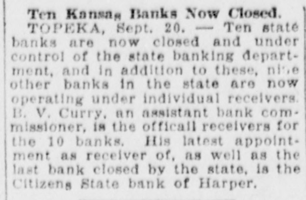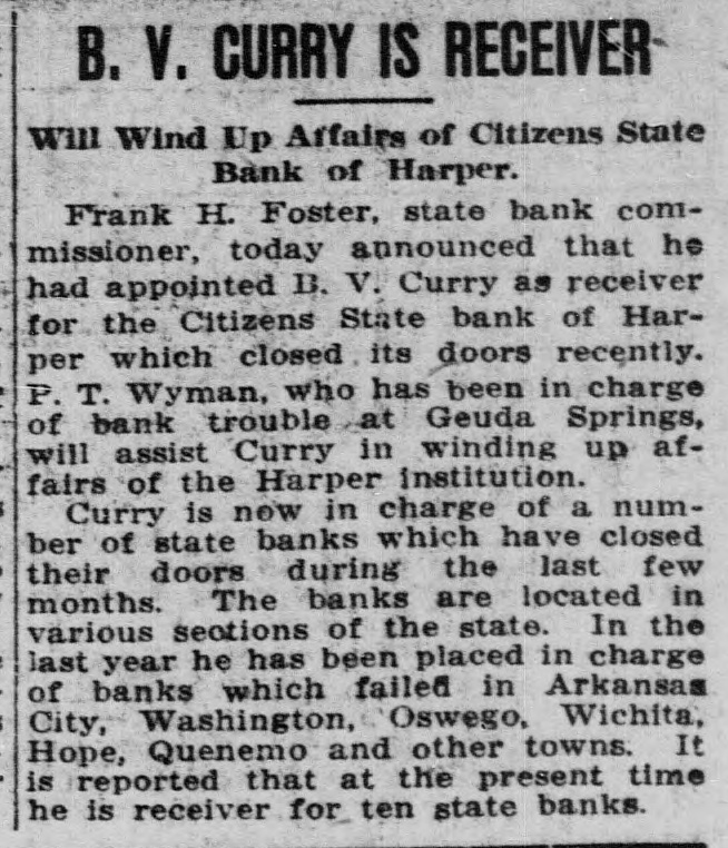 B. V. CURRY IS RECEIVER Will Wind Up Affairs of Citizens State Bank of Harper. Frank H. Foster, state bank commissioner, today announced that he had appointed B. V. Curry as receiver for the Citizens State bank of Harper which closed its doors recently. P. T. Wyman, who has been in charge of bank trouble at Geuda Springs, will assist Curry in winding up affairs of the Harper institution. Curry is now in charge of a number of state banks which have closed their doors during the last few months. The banks are located in various sections of the state. In the last year he has been placed in charge of banks which failed in Arkansas City, Washington, Oswego, Wichita, Hope, Quenemo and other towns. It is reported that at the present time he is receiver for ten state banks.