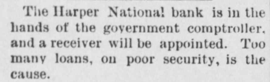 The Harper National bank is in the hands of the government comptroller. and a receiver will be appointed. Too many loans, on poor security, is the cause.