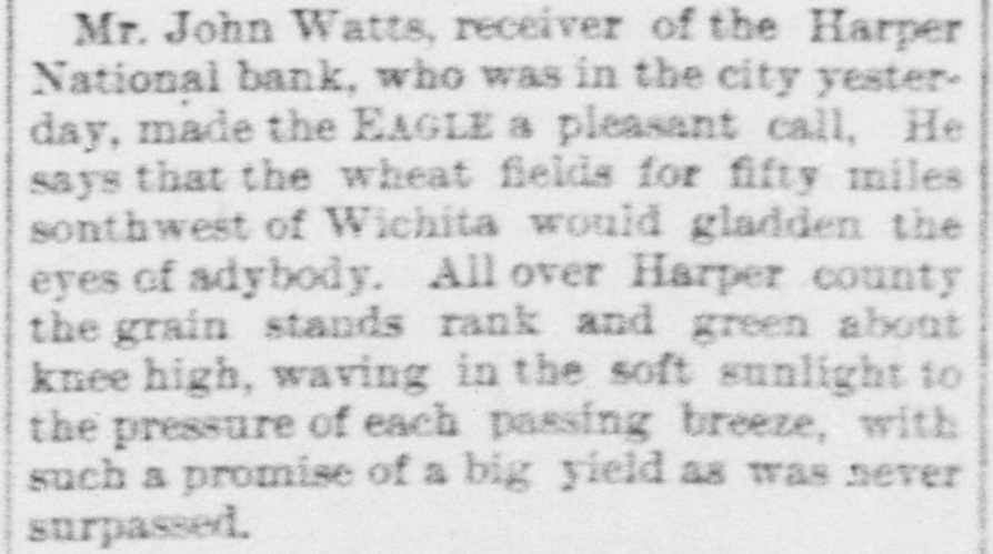 Mr. John Watts, receiver of the Harper National bank, who was in the city yesterday, made the EAGLE a pleasant call, He says that the wheat fields for fifty miles sonthwest of Wichita would gladden the eyes of adybody. All over Harper county the grain stands rank and green about knee high, waving in the soft sunlight to the pressure of each passing breeze, with such a promise of a big yield as was never surpassed.