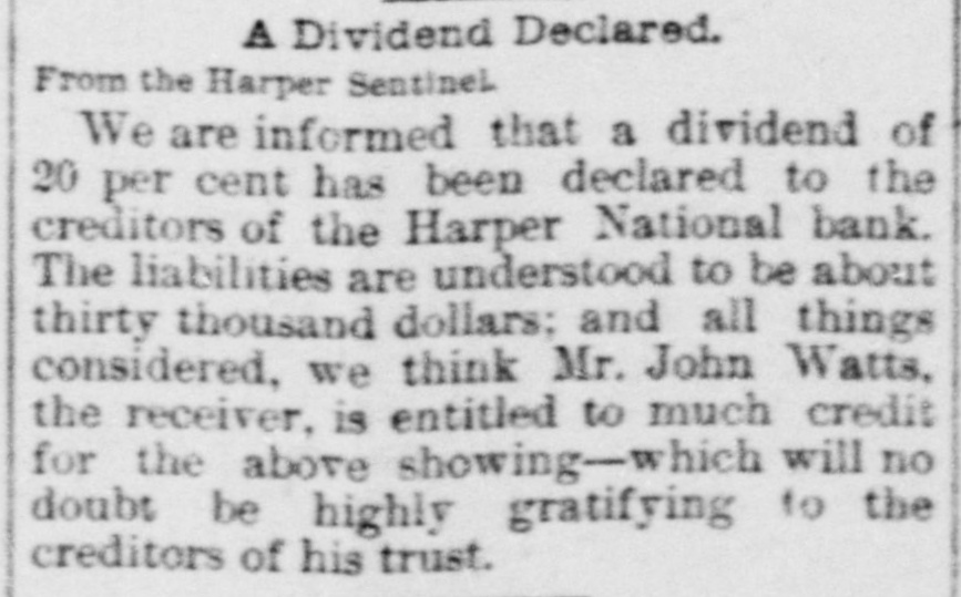 A Dividend Declared. From the Harper Sentinel We are informed that a dividend of 20 per cent has been declared to the creditors of the Harper National bank. The liabilities are understood to be about thirty thousand dollars: and all things considered, we think Mr. John Watts, the receiver, is entitled to much credit for the above showing-which will no doubt be highly gratifying to the creditors of his trust.