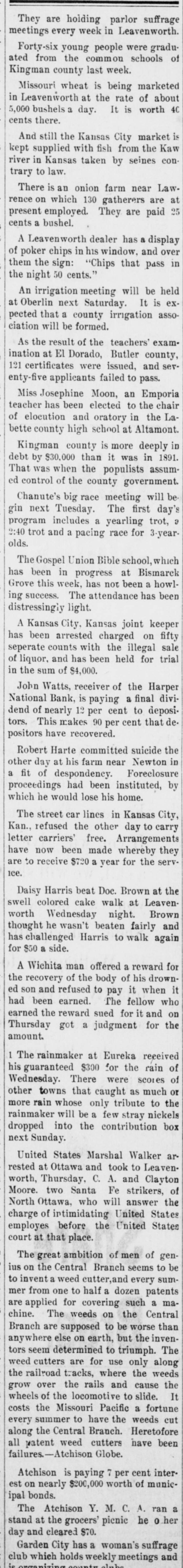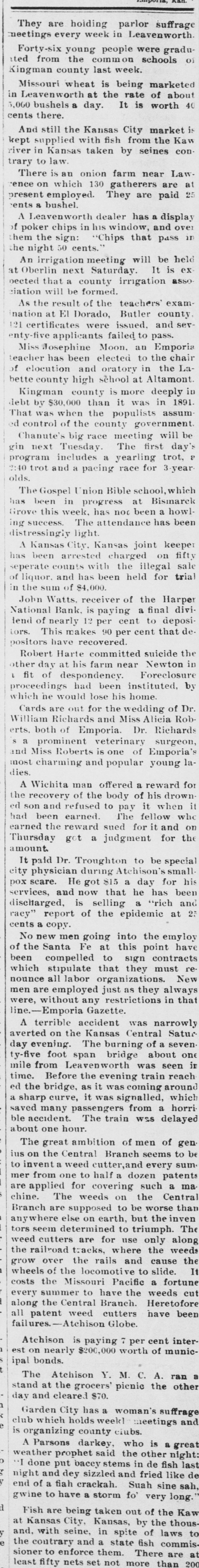 They are hoiding parlor suffrage meetings every week in Leavenworth. Forty-six young people were graduated from the common schools 01 Kingman county last week. Missouri wheat is being marketed in Leavenworth at the rate of about 5,060 bushels a day. It is worth 40 cents there. And still the Kansas City market is kept supplied with fish from the Kaw river in Kansas taken by seines contrary to law. There is an onion farm near Lawrence on which 130 gatherers are at present employed. They are paid 25 cents a bushel. A Leavenworth dealer has a display of poker chips in his window, and over them the sign: "Chips that pass in the night 50 cents." An irrigation meeting will be held at Oberlin next Saturday. It is expected that a county irrigation association will be formed. As the result of the teachers' examination at El Dorado, Butler county, 121 certificates were issued, and seventy-five applicants failed to pass. Miss Josephine Moon, an Emporia teacher has been elected to the chair of elocution and oratory in the Labette county high school at Altamont. Kingman county is more deeply in debt by $30,000 than it was in 1891. That was when the populists assumed control of the county government. Chanute's big race meeting will begin next Tuesday. The first day's program includes a yearling trot, 2:40 trot and a pacing race for 3-year-olds. The Gospel Union Bible school, which has been in progress at Bismarck Grove this week, has not been a howling success. The attendance has been distressingly light. A Kansas City, Kansas joint keeper has been arrested charged on fifty seperate counts with the illegal sale of liquor, and has been held for trial in the sum of $4,000. John Watts, receiver of the Harper National Bank, is paying a final dividend of nearly 12 per cent to depositors. This makes 90 per cent that depositors have recovered. Robert Harte committed suicide the other day at his farm near Newton in a fit of despondency. Foreclosure proceedings had been instituted, by which he would lose his home. Cards are out for the wedding of Dr. William Richards and Miss Alicia Roberts, both of Emporia. Dr. Richards s a prominent veterinary surgeon, and Miss Roberts is one of Emporia's most charming and popular young ladies. A Wichita man offered a reward for the recovery of the body of his drowned son and refused to pay it when it had been earned. The fellow whe earned the reward sued for it and on Thursday got a judgment for the amount. It paid Dr. Troughton to be special city physician during Atchison's smallpox scare. He got $15 a day for his services, and now that he has been discharged, is selling a "rich and racy" report of the epidemic at 25 cents a copy. No new men going into the emyloy of the Santa Fe at this point have been compelled to sign contracts which stipulate that they must renounce all labor organizations. New men are employed just as they always were, without any restrictions in that line.—Emporia Gazette. A terrible accident was narrowly averted on the Kansas Central Saturday evening. The burning of a seventy-five foot span bridge about one mile from Leavenworth was seen ir time. Before the evening train reached the bridge, as it was coming around a sharp curve, it was signalled, which saved many passengers from a horrible accident. The train was delayed about one hour. The great ambition of men of genius on the Central Branch seems to be to invent a weed cutter, and every summer from one to half a dozen patents are applied for covering such a machine. The weeds on the Central Branch are supposed to be worse than anywhere else on earth, but the inventors seem determined to triumph. The weed cutters are for use only along the railroad tracks, where the weeds grow over the rails and cause the wheels of the locomotive to slide. It costs the Missouri Pacific a fortune every summer to have the weeds cut along the Central Branch. Heretofore all patent weed cutters have been failures.—Atchison Globe. Atchison is paying 7 per cent interest on nearly $200,000 worth of municipal bonds. The Atchison Y. M. C. A. ran a stand at the grocers' picnic the other day and cleared $70. Garden City has a woman's suffrage club which holds weekl meetings and is organizing county clubs. A Parsons darkey, who is a great weather prophet said the other night: "I done put baccy stems in de fish last night and dey sizzled and fried like de end of a fiah crackah. Suah sine sah, gwine to have a storm fo' very long." Fish are being taken out of the Kaw at Kansas City, Kansas, by the thousand, with seine, in spite of laws to the contrary and a state fish commissioner to enforce them. There are at least fifty nets set not more than 200