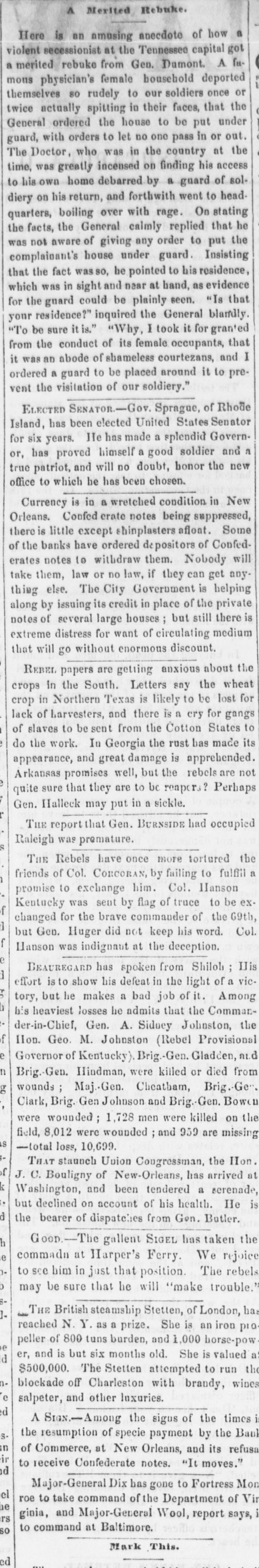 A Merited Rebuke. Here is an amusing anecdote of how a violent secessionist at the Tennessee capital got a rebuke from Gen. merited Dumont. A fumous physician's female household deported themselves 80 rudely to our soldiers once or twice actually spitting in their faces, that the General ordered the house to be put under guard, with orders to let no one pass in or out. The who was in the Doctor, the finding country his at time, was greatly incensed on access to his own home debarred by a guard of soldiery on his return, and forthwith went to headquarters, boiling over with rage. On stating the facts, the General calmly replied that he was not aware of giving any order to put the complainant's house under guard. Insisting that the fact was so, he pointed to his residence, which was in sight and near at hand, as evidence for the could be plainly seen. "Is that residence?" inquired your guard the General blandly. "To be sure "Why, I took it for granted from the conduct of its female occupants, that it abode of shameless courtezans, and I ordered a to be prewas an guard placed around it to vent the visitation of our soldiery." ELECTED SENATOR-GOV. Sprague, of Rhode Island, has been elected United States Senator for six years. He has made a splendid Governhas himself a good soldier and a true and will no new or, patriot, proved doubt, honor the office to which he has been chosen. Currency is in a wretched condition in New Orleans. Confed crate notes being suppressed, thereis little except shinplasters afloat. Some of the banks have ordered depositors of Confederates notes to withdraw them. Nobody will take them, law or no law, if they can get anyelse. The City Government helping its credit in along thing by issuing place of the is private notes of several large houses; but still there is extreme distress for want of circulating medium that will go without enormous discount. REBEL papers are getting anxious about the in the South. Letters say crops likely be the lost wheat for crop in Northern Texas is to lack of Larvesters, and there is a cry for gangs of slaves to be sent from the Cotton States to do the work. In Georgia the rust has made its and damage is apprehended. appearance, great well, are not sure that they are to quite Arkansas promises but be the reapors? rebels Perhaps Gen. Halleck may put in a sickle. THE report th Gen. BURNSIDE had occupied Raleigh was premature. S THE Rebels have once more tortured the h friends of Col. CORCORAN, by failing to fulfill a promise to exchange him. Col. Hanson Kentucky was sent by flag of truce to be exf changed for the brave commander of the 69th, 1 but Gen. Huger did not keep his word. Col. Hanson was indignaut at the deception. e BEAUREGARD has spoken from Shiloh Iiis il effort is to show his defeat in the light of a victory, but he makes a bad job of it. Among his heaviest losses he admits that the Commander-in-Chief, Gen. A. Sidney Johnston, the f IIon. Geo. M. Johnston (Rebel Provisional e Governor of Kentucky}. Brig.-Gen. Gladden, and n Brig.-Gen. Hindman, were killed or died from g wounds; Maj.-Gen. Cheatham, Brig. Ge Clark, Brig. Gen Johnson and Brig.-Gen. Bowen were wounded; 1,728 men were killed on the field, 8,012 were wounded ; and 959 are missing is -total loss, 10,699. THAT staunch Union Congressman, the IIon of J. C. Bouligny of New-Orleans, has arrived at k Washington, and been tendered a serenade, but declined on account of his health. He is d the bearer of dispatches from Gen. Butler. h Good.--The gallent SIGEL has taken the e commadn at Harper's Ferry. We rejoice to see bim in just that position. The rebels 0 may be sure that he will "make trouble. S]. THE British steamship Stetten, of London, ha reached N. Y. as a prize. She is an iron pro peller of 800 tuns burden, and 1,000 horse-pow e d er, and is but six months old. She is valued a $500,000. The Stetten attempted to run the n. blockade off Charleston with brandy, wines e salpeter, and other luxuries. d A SIGN.-Among the sigus of the times S. the resumption of specie payment by the Baul in of Commerce, at New Orleans, and its refusa ir to receive Confederate notes. "It moves." d Major-General Dix has gone to Fortress Mon el roe to take command of the Department of Vir be rs ginia, and Major-General Wool, report says, to command at Baltimore. so Mark This. ed