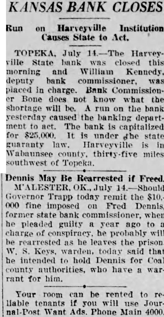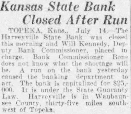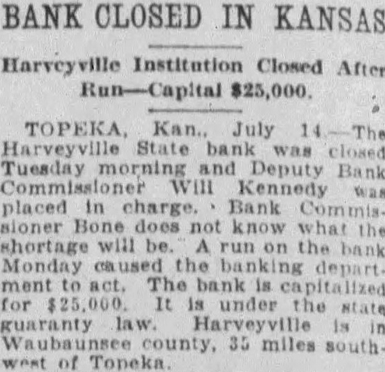 Run on Harveyville Institution Causes State to Act. ville State bank was closed this morning and William Kennedy. deputy bank commissioner. was placed in charge. Bank Commissioner Bone does not know what the shortage will be. A run on the bank yesterday caused the banking department to act. The bank is capitalized for $25,000. It is under the state guaranty law. Harveyville is in Wabaunsee county. thirty-five miles southwest of Topeka.