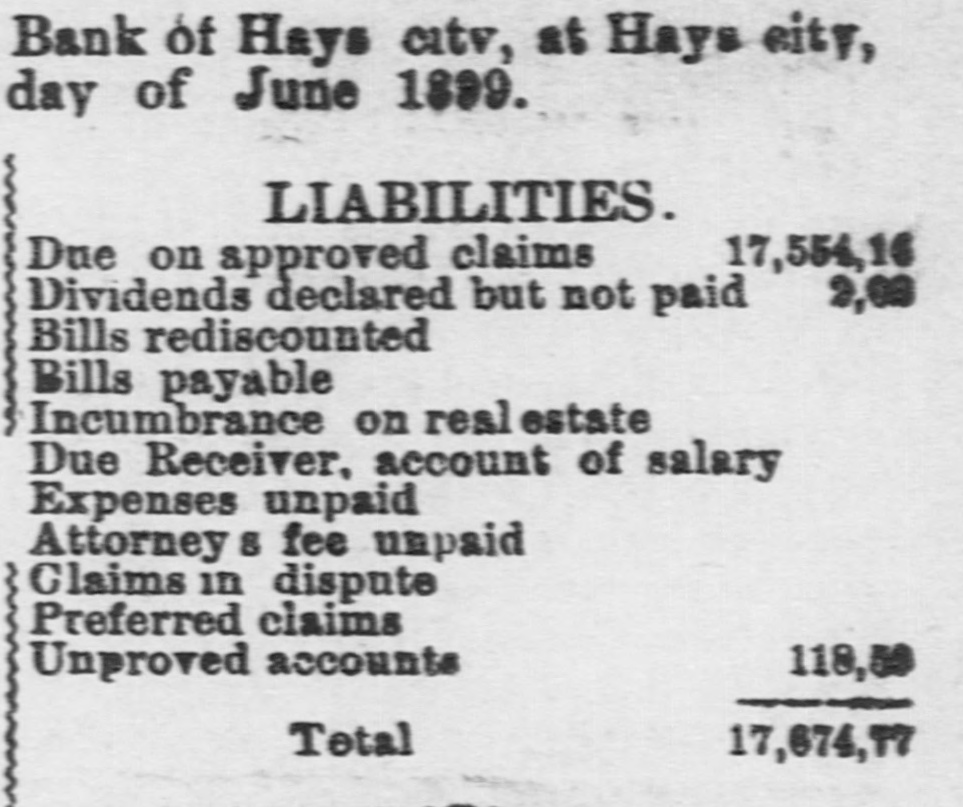 Bank of Hays city, at Hays city, day of June 1889. LIABILITIES. 17,554.16 Due on approved claims 2,00 Dividends declared but not paid Bills rediscounted Bills payable Incumbrance on real estate Due Receiver, account of salary Expenses unpaid Attorney 8 fee unpaid Claims in dispute Preferred claims 118,59 Unproved accounts Total 17,674,77