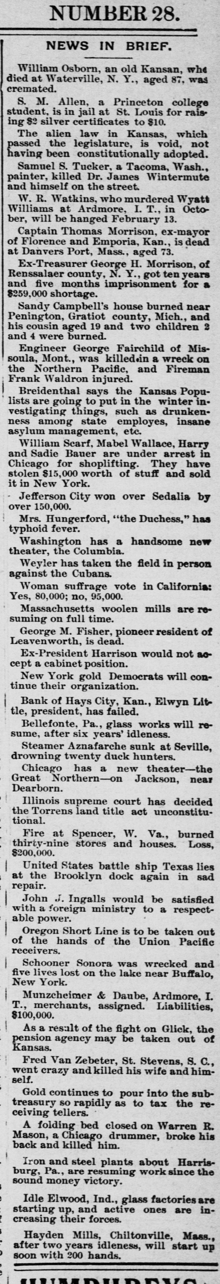 THE BOOM. "Never before did business show such a change in a single week. The gain is surprising. Price of wheat is now the highest since June, 1892." Such are the words in flaming headlines, preceeding a report of R. G. Dunn & Co. Then follows the statement that foreign need of American wheat has sent the price up to 88 cents. Just how the election could effect foreign demand is not stated. It then says: "Many textile works have been started or increased in force on orders booked weeks ago, but there has not been much increase in demand." That is what we thought; until farmers can get decent prices (the farmers are not in it on the wheat boom) they cannot buy the "textiles," and hence the boom will be ever so short. By the same authority, purchases of wool, which has averaged over 9,000,000 pounds a week, had fallen to 6,243,700 pounds. We fail to see a boom in that. The market for cotton goods is not yet active and cotton is quoted 1/8 cent lower. The boom doesn't stick out there. The bare fact is that those who look for prosperity to follow the assurance of permanent gold standard are forcing a boom that cannot last. Over-production will be the cry, because people can't buy manufactured goods when they cannot realize anything on their own products. We should be glad to believe in better times to come, but reason and experience compel us to warn our readers against overreaching in an" ticipation of the promised good times. Without hunting for unpleasant news, our eye is constantly catching items like the following Nov. 5, A. J. Joyce & Son, carriages, Washington, D. C., assigned to Fred S Smith. Liabilities $33,000. Nov. 6, Gustave Hananer, clothing, Dayton, O., assigned to A. W. Goldsmith. Liabilities $100,000. Nov. 7, Coal miners Jackson, O., strike against reduction of wages. Nov. 7, Wood & Parker Lithograph Co., New York, assigned to Benoni Lockwood. Liabilities $30,000. Nov. 7, The Golden Scepter mining company, Quigley, Montana, assigned. Liabilities $285,000. Nov.7 7, The John Hoburg Co., lumber, Green Bay, Wis., assigned. Liabilities $25,000. Nov. 7, Wm. H. Trewargy, lumber, Boston, Mass., assigned. Liabilities $300,000. Nov. 9. Munzesheimer & Co., merchants, Ardmore, I. T., assigned to W. A. Ledbetter. Liabilites $100,000. Nov. 10, Iowa Savings Bank, Sioux City, closed its doors. Nov. IO, Stephen A. Richards, appointed receiver, for A. B. Smith, dry goods, Saratoga, N.Y. Liabilities, $45,000. Nov. IO, W. W. White & Co., cotton, Texas, assigned. Liabilities $200,000. Nov. II, Evening Post Pub., Co., Ft. Wayne, Ind., assigned. Nov. II, The bank of Hays City, Kansas, failed. Nov. I2, Clapp & Co., brokers, New York, assigned. Liabilities $150,000. Nov. 12, McEwen Manufacturing Co., Ridgway, Pa., assigned.