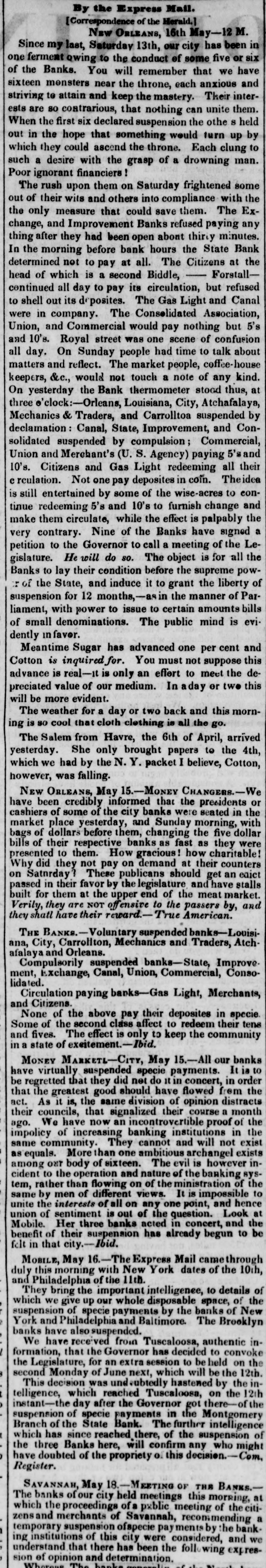 By the Express Mail. Correspondence of the Herald] New ORLEANS, May 13, 1837-12M. The die is cast. Six of our banks suspended last evening- Atchayalaya, the Orleans, the Carrol- the the the Mechanics' and Traders', and The rest will follow today or on can save them under hearen. Louisiana. ton, Nothing City, Forstall, Monday. the the of the French banks, admitted last evening and while he did so, his lip at the tyrannical course of the necessity, leader anger quivered government. with The of French protested bills from and Paris, will place these return Havre daily four losses expected Creole will far in the back ground. Their The pet banks will bank hours are closed. monsters be immense. before certainly They would declare have tothe first batch, but for their joined day, with predict position that with the the government. I venture to whole of the government deposites throughout the country will be unavailable in coin in less than two months. Thegovernment, by suffering the state banks to has been caught in a trap. will treacherous, and will glory in suspend, prove The and it. pet banks They what have the funds in their hands, Some think that the care they? government Kinderhooker the whole knew how would go, and determined that to should be lost, to gain his surplus things and poist-that then propose is make all the state banks unpopular, fund a specie currency, to precede his great safety measure. There is no telling the depth of this man's mancuvering, or his ignorance. He is either a alone consummate knave or a very ignoramus. Time will show which. I am inclined to the first alternative. We bear things philosophically here. As yet no of public opposition are shown to the There will probably be none, as measure. manifestations exchanged the them small for holders of notes have long since Our specie, under apprehensions of this movement. population here is not made up of the refuse of England, Ireland and Germany, as in New York-and hence our quiet. We daily and hourly look for the news of your bankers having stopped. What can save them? The United States' Bank will be compelled to follow suit, if information be correct. Their agents here, the Merchants' my Bank, are only waiting for orders from Philadelphia. well versed in these matters, has just told has made an estimate of government A gentleman me he the the loaned out in the various states by pet the former fictitious values of and loss to the goverment of banks moneys that the on will be things, certain Add this to the public made the suspension, and the government unavailable twelve millions. by for its funds expendiwill be compelled to borrow money tures November next. Is there any in the that the privy council has report before ordered truth the it? Bank of England to suspend if necessity require Prices of produce in statu quo. Just heard-as the mail is in-that all the Mobile banks have suspended. So we go. NEW ORLEANS, May 14.-Suspension of Specie The long anticipated climax of our caPayments. lamities broke upon our city yesterday morning. Me- The Presidents of the Bank of Louisiana, City Bank, chanics' and Traders'; Carrollton, Atchafalaya, and Bank of Orleans, held a meeting on Friday evening came to the determination, and accordingly gave and noticethrough some of the journals of the city, that they should temporarily suspend the payment of spefor their notes. On the opening of the Banks yescie morning, a tremenduous run was made upon Smaller notes were some of them, but all notes over terday day, all of by them. cashed during $10 were the refused. pervaded all classes of our comPersons were seen running to with their hands munity. A general dismay full and of from silver.- the sent large billsaccompanied with home their silver: those were to Others, to Banks, bring and again, returning with the tellers. obliged boxes return finding no favor believe that the motives to this measure, were any of we suppose that they had one for the interests of that selfish-did the Could basks empty, we community thing which but for actuated spark whom purely so much solicitude- any just that their course can ground feeling they manifest for believing there have which a ten- for to dissipate, in the least, t at pressure dency last two months has been preying upon the vel: the vitals of our commercial community and destroying be between man and man-could we to realize all this, we would be among But we think different. brought confidence uphold them. They have and the now first to been playing an iniquitous game, forsooth, with the plea that are restore that confidence, the so of former system of favorit.sm in voring which come all along out, their to about. they destruction has been endeawe have seen no reason for a of There h is been no run upon the instrumental As yet payments. bringing suspension of what might have been made in country traders have portion of the money they get This they have done now, produce times. banks away specie a but large The in specie. up always the for best carried their and would de in the most prosperous times. We rejoice in one thing, however, and that is the banks will hereafter be compelled to " show their hands. The next legislature will doubtless pass such laws as will compel the directors to let the peoplekkow in what manner the affairs of the different to institutions are conducted, and net allow them continue their dark underhanded schemes. We rejoice, also, that things cannot become worse. Picayune. We understand that the Gas Light bank and Merchants, Dr and they alone, continued 10 pay specie yesterday until the closing of their doors at the reguhour. All right in these institutions so far, and we lar trust this state of things will continue. SCENE IN A BANK.- An Irishman entered one bill- of banks yesterday, and throwing down a $5 our Will you be kind enough, Misther, just to give me the spacie for that same bit of a bill? No, sir. "What! can't you be aftherpaying such a small sum as " that, We 