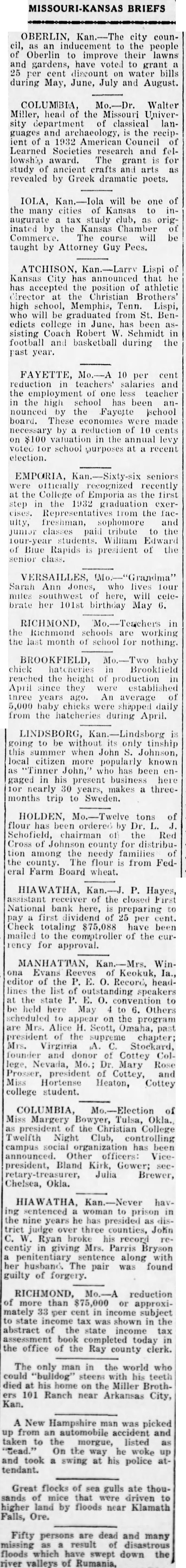 BRIEFS OBERLIN, city counas an inducement to the people of Oberlin improve their lawns and gardens, have voted to grant 25 cent discount water bills during May, June, July and August. Mo.-Dr. Walter Miller, head of the Missouri University department of classical languages and the recipient of 1932 American Council Learned Societies research and lowship award. The grant is for study ancient crafts and arts as revealed by Greek dramatic poets. IOLA, will be one of the many cities of Kansas to inaugurate tax study club, as originated by the Kansas Chamber Commerce. The course be taught by Attorney Guy Pees. ATCHISON, Lispi of Kansas City has announced that he has the position of athletic at the Christian Brothers' high school, Memphis, Tenn. Lispi, will be graduated from St. Benedicts college June, has been assisting Coach Robert W. Schmidt football and basketball during the past year. FAYETTE, Mo.-A 10 per cent reduction teachers' salaries and the of one less teacher in the high school has announced the Fayette school board. These economies were made necessary by reduction of 10 cents on valuation in the annual levy voted school purposes at recent election. EMPORIA, seniors officially recognized recently at the College of Emporia the first step the 1932 graduation the faculty, freshman, sophomore and junior classes paid tribute to the students. William Edward of Blue Rapids president of the senior class. VERSAILLES, Sarah Ann Jones, who lives four miles southwest here, will celebrate her 101st birthday May RICHMOND, in the Richmond schools are working the last month of school for nothing. BROOKFIELD, baby chick reached the height of production in April since they established three years ago. An average of 5,000 baby chicks were shipped daily from the hatcheries during April. LINDSBORG, going to be without its only tinship this summer when John S. Johnson, local citizen more popularly known as "Tinner John," who has been engaged in his present business here for nearly 30 makes threemonths trip to Sweden. HOLDEN, tons of flour has ordered by Dr. Schofield, chairman the Red Cross of Johnson county for distribution among the needy families the county. The flour from Federal Farm Board wheat. HIAWATHA, P. Hayes, assistant receiver of the closed First National bank here, is preparing to first dividend of 25 per cent. Check totaling $75,088 have been mailed to the comptroller of the currency for approval. MANHATTAN, WinEvans Reeves of Keokuk, editor of the Record, headlines the list of outstanding speakers at the state E. convention to held here May 6. Others scheduled appear on the program are Mrs. Alice Scott, Omaha, past president of the supreme chapter; Mrs. Virginia Stockard, founder and donor of Cottey College, Nevada, Mo.; Dr. Mary Rose Prosser, president of Cottey, and Miss Hortense Heaton, Cottey college student. COLUMBIA, of Miss Margery Bowyer, Tulsa, Okla., president of the Christian College Twelfth Night Club, controlling campus social organization has been announced. Other officers: Vicepresident, Bland Kirk, Gower; secJulia Brewer, Chelsea, Okla. HIAWATHA, havsentenced woman to prison in the nine years he has presided trict judge over three counties, John Ryan broke his record centiy in giving Mrs. Parris Bryson penitentiary sentence along with her husband. The was found pair guilty of forgery. RICHMOND, reduction of more than $75,000 or approximately 33 per cent in income subject to state income tax shown in the abstract of the state income tax assessment book completed today the office of the Ray county clerk. The only man in the world who could steens with his teeth died his home on the Miller Broth101 Ranch near Arkansas City, Kan. A New Hampshire man was picked from an automobile accident and taken the morgue, listed On the he woke way and took swing at his police tendant. Great flocks of sea gulls ate thousands of mice that were driven higher land by floods near Klamath Falls, Ore. Fifty persons are dead and many missing result of disastrous floods which have swept down valleys of Rumania,