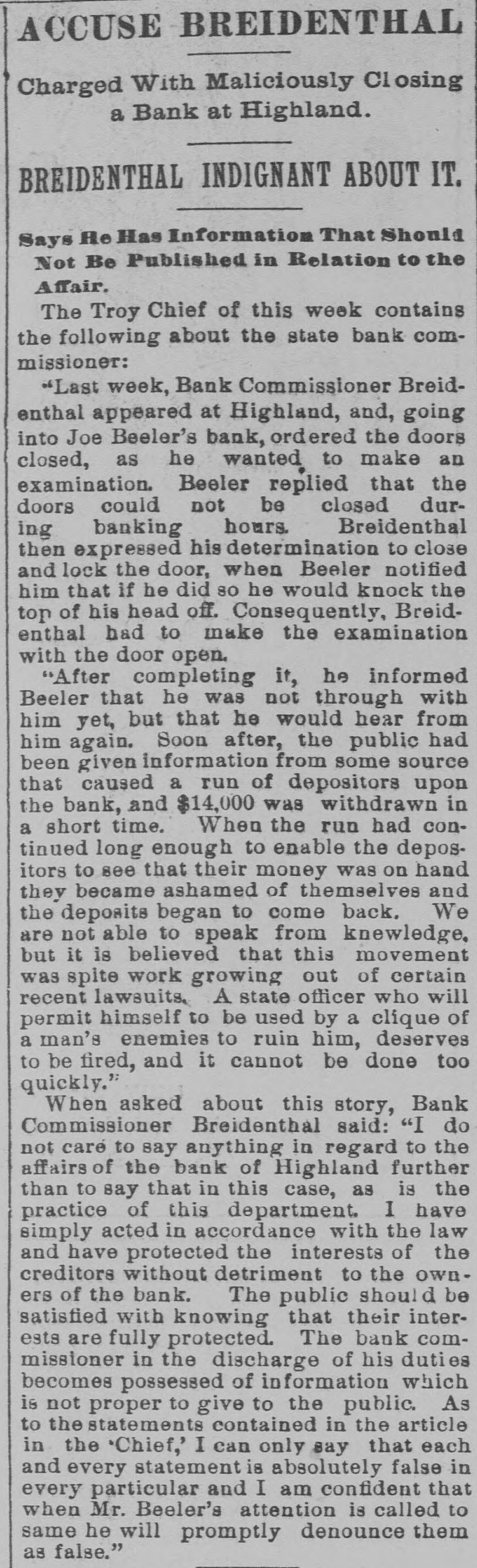 # ACCUSE BREIDENTHAL Charged With Maliciously Closing a Bank at Highland. # BREIDENTHAL INDIGNANT ABOUT IT. Says He Has Information That Should Not Be Published in Relation to the Affair. The Troy Chief of this week contains the following about the state bank commissioner: "Last week, Bank Commissioner Breidenthal appeared at Highland, and, going into Joe Beeler's bank, ordered the doors closed, as he wanted to make an examination. Beeler replied that the doors could not be closed during banking hours. Breidenthal then expressed his determination to close and lock the door, when Beeler notified him that if he did so he would knock the top of his head off. Consequently, Breidenthal had to make the examination with the door open. "After completing it, he informed Beeler that he was not through with him yet, but that he would hear from him again. Soon after, the public had been given information from some source that caused a run of depositors upon the bank, and $14,000 was withdrawn in a short time. When the run had continued long enough to enable the depositors to see that their money was on hand they became ashamed of themselves and the deposits began to come back. We are not able to speak from knewledge, but it is believed that this movement was spite work growing out of certain recent lawsuits. A state officer who will permit himself to be used by a clique of a man's enemies to ruin him, deserves to be fired, and it cannot be done too quickly." When asked about this story, Bank Commissioner Breidenthal said: "I do not care to say anything in regard to the affairs of the bank of Highland further than to say that in this case, as is the practice of this department. I have simply acted in accordance with the law and have protected the interests of the creditors without detriment to the owners of the bank. The public should be satisfied with knowing that their interests are fully protected. The bank commissioner in the discharge of his duties becomes possessed of information which is not proper to give to the public. As to the statements contained in the article in the 'Chief,' I can only say that each and every statement is absolutely false in every particular and I am confident that when Mr. Beeler's attention is called to same he will promptly denounce them as false."