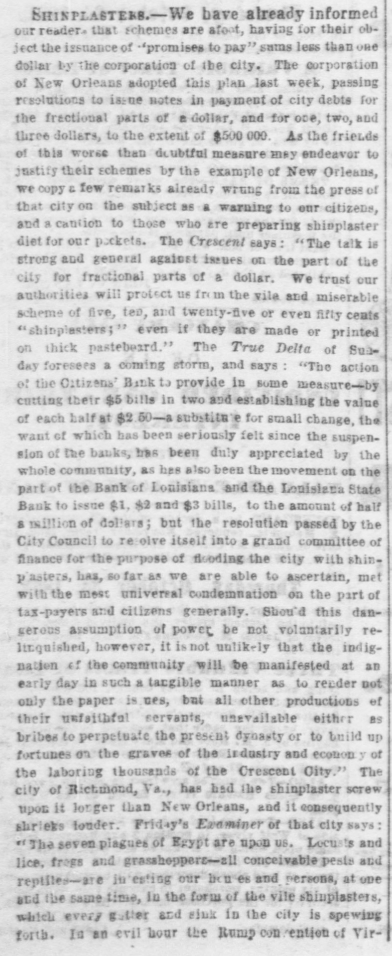 Proclamation by the Governor. The wise and patriotic determination of the planters of the Confederate States to sell no cotton until the blockade of our ports is raised, has deprived our Government of the resources it could otherwise command from the disposition of our great staple. To supply the means for carrying on the war waged against us by the Unifed States, the Confederate Government, like other Governments under like circumstances, has been forced to resort to its credit, which credit rests upon the wealth of the people of the Confederate States. The Government has judiciously determined to issue one hundred millions of Treasury Notes, secured by a direct tax upon the property of the people, and the redemption of the notes is as certain as the property they represent. All the banks of the Confederate States, except those of New Orleans and Mobile, receive these Treasury Notes in payment of debts due to them, and pay them out to their creditors, thus establishing a currency of real value, which meets all the wants of the public. In order that these banks might be enabled to conduct their business so as to make the Treasury Notes 8 common currency, they have been obliged to suspend specie payments, because, unless the creditors of the banks receive the Treasury Notes, these notes could not be taken by them in payment. and would thus fail to answer the parposes of currency. The Banks of Louisiana, however, are forbidden to suspend specie payment, and our Legislature, unlike that of the other States, is without constitutional right to legalize a suspension. As Treasury Notes must be below par, and hence cannot circuculate like bank notes while the Banks continue to pay specie, one of two results must follow: our Banks will be obliged to redeem all their notes and pay all their depositors in coin, and theu be utterly una le to increase their loans, or they will have to suspend. If the Banks refuse to receive Treasury Notes and continue to pay out coin, the entire planting interest of the State, dependent upon the ability of the commission merchants to obtain facilities from the Banks in order to furnish the planters with their usual supplies, will be deprived of the means absolutely necessary to meet the current expenses of the year, while the Treasury Notes would be subject to constant depreelation, and the credit of the Confederate Government seriously impaired thereby. To prevent consequences that will prove so disastrous to the whole people, I recommend to the several Banks of New Orleans immΓ©diately to suspend specie pay. men't In recommending this course to the Banks, T am well aware that they incur the risk of a forfeiture of their charters, from which neither the Legislature nor the Executive can relieve them. But the Legislature can refer the whole subject to the people of the State, at such time as, in their wisdom, they may think proper; and the people, in Convention assembled, will decide whether the forfeiture of their charters by the Banks shall be exacted or relinquished, The Banks are now in a condition to pay all their liabilities as rapidly as they ean be presented at their counters, and, not withstanding the suspension of specie payments hereby recommended, they can maintain a position SO strong, that when the period for resumption arrives, they will not be embarrassed or even inconvenienced by paying every dollar in coin. As the spirit of the Constitution and the laws of this State, regulating the Banking System. regards the bill-holder as the creditor first to be protected, an additional restriction is proposed which looks directly to his interest in order, therefore, secure the prompt redemption of the circulation of the banks, and to preserve their present impregnable state when the resumption of specie payments shall be deemed advisable, the banks will observe the following regulations: 1st. The circulation of the chartered banks-that is, the Canal, Citizens', Bank of Louisiana and the Louisiana State Bauk-shall not exceed the amount of coin actually held by them respectively; and the circulation of the free banks shalt be restricted to the amount of bonds at present deposited with the Auditor of the State, and in accordance wilh existing laws. 2d. The suspension of specie payments will not interfere with the weekly and monthly returns to the Board of Currency, nor with the fundamental rules governing the Banks, not in opposition to the recommendation herein made. 3d. The Banks will receive on deposit and in payment of debts due them, the notes of the Confederate States of America, and pay them out at their counters. 4th. The usual week'y statements must be made through the Board of Currency, and all balances paid in Confederates notes, or in coin. THOS, O. MOORE, sel6 2p3t Governor.