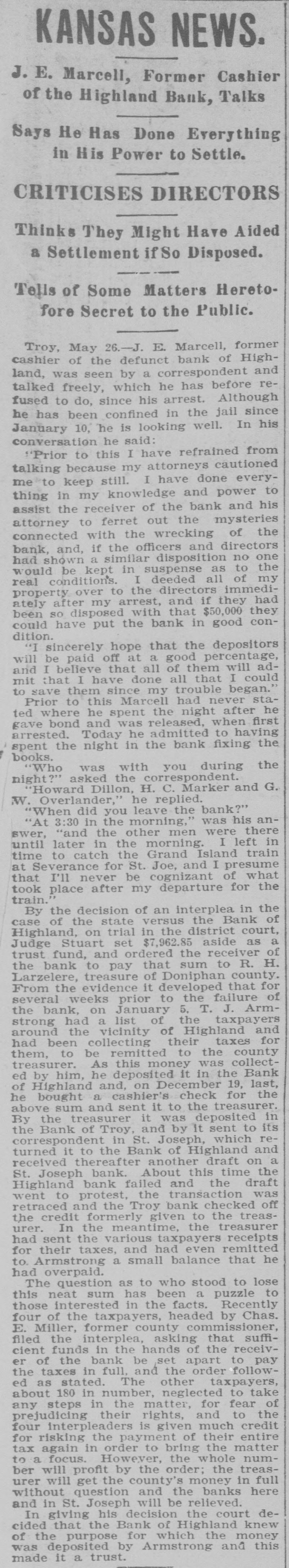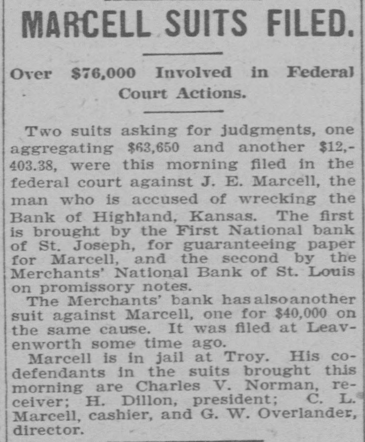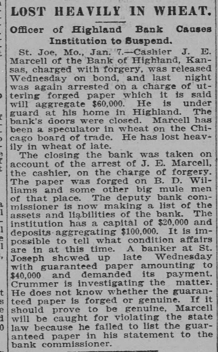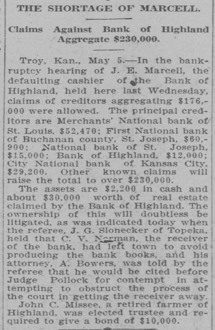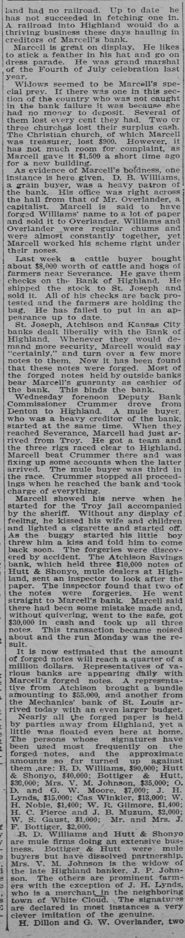 land had no railroad. Up to date he has not succeeded in fetching one in. A railroad into Highland would do a thriving business these days hauling in creditors of Marcell's bank. Marcell is great on display. He likes to stick a feather in his hat and go on dress parade. He was grand marshal of the Fourth of July celebration last year. Widows seemed to be Marcell's special prey. If there was one in this section of the country who was not caught in the bank failure it was because she had no money to deposit. Several of them lost every cent they had. Two or three churches lost their surplus cash. The Christian church, of which Marcell was treasurer, lost $900. However. it has not much room for complaint, as Marcell gave it $1,500 a short time ago for a new building. As evidence of Marcell's boldness, one instance is here given. D. B. Williams, a grain buyer, was a heavy patron of the bank. His office was right across the hall from that of Mr. Overlander, a capitalist. Marcell is said to have forged Williams' name to a lot of paper and sold it to Overlander. Williams and Overlander were regular chums and were almost constantly together, yet Marcell worked his scheme right under their noses. Last week a cattle buyer bought about $8,000 worth of cattle and hogs of farmers near Severance. He gave them checks on the Bank of Highland. He shipped the stock to St. Joseph and sold it. All of his checks are back protested and the farmers are holding the bag. He has failed to put in an appearance up to date. St. Joseph, Atchison and Kansas City banks dealt liberally with the Bank of Highland. Whenever they would demand more security, Marcell would say "certainly," and turn over a few more notes to them. Now it has been found that these notes were forged. Most of the forged notes held by outside banks bear Marcell's guaranty as cashier of the bank. This binds the bank. Wednesday forenoon Deputy Bank Commissioner Crummer drove from Denton to Highland. A mule buyer, who was a heavy creditor of the bank started at the same time. When they reached Severance, Marcell had just arrived from Troy. He got a team and the three rigs raced clear to Highland. Marcell beat Crummer there and was fixing up some accounts when the latter arrived. The mule buyer was third in the race. Crummer stopped all proceedings when he reached the bank and took charge of everything. Marcell showed his nerve when he started for the Troy jail accompanied by the sheriff. Without any display et feeling, he kissed his wife and children and lighted a cigarette and started off As the buggy started his little boy threw him a kiss and told him to come back soon. The forgeries were discovered by accident. The Atchison Savings bank, which held three $10,000 notes of Hutt & Shonyo, mule dealers at Highland, sent an inspector to look after the paper. The inspector found that two o the notes were forgeries. He went straight to Marcell's bank. Marcell said there had been some mistake made and without quivering, went to the safe, go $30,000 in cash and took up all three notes. This transaction became noised about and the run Monday was the result. It is now estimated that the amount of forged notes will reach a quarter of a million dollars. Representatives of va rious banks are appearing daily with Marcell's forged notes. A representa tive from Atchison brought a bundle amounting to $55,000, and another from the Mechanics' bank of St. Louis ar rived today with an even larger budget Nearly all the forged paper is held by parties away from Highland, yet a little was floated even here at home The persons whose signatures have been used most frequently on the forged notes, and the approximate amounts SO far turned up agains them ,are: B. D. Williams, $90,000; Hut & Shonyo, $40,000; Bottiger & Hutt $30,000; Mrs. V. M. Johnson, $35,000; o D. and G. W. Moore, $7,000; J. H Lynds, $15,000; Cas Winkler, $13,000; W H. Noble, $1,400; W. R. Gilmore, $1,400 H. C. Pierce and J. B. Muzum, $2,000 W. S. Gaust, $1,000; Mr. and Mrs. J F. Bottiger, $2,000. B. D. Williams and Hutt & Shony are mule firms doing an extensive bus iness. Bottiger & Hutt were mule buyers but have dissolved partnership Mrs. V. M. Johnson is the widow o the late Highland banker, J. P. John