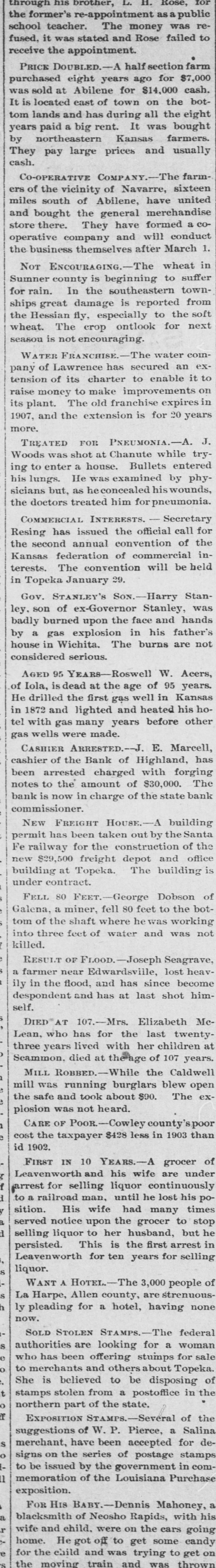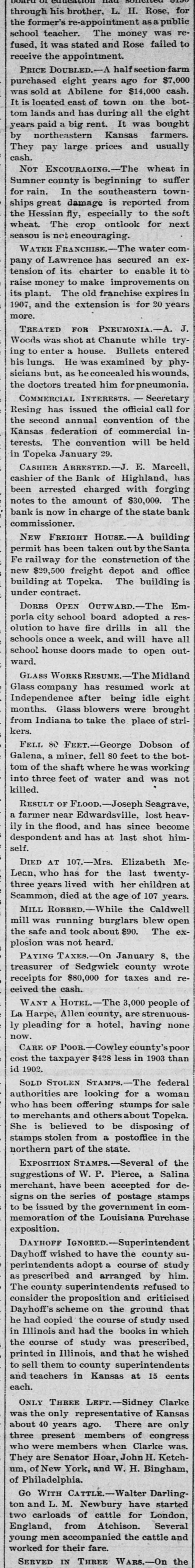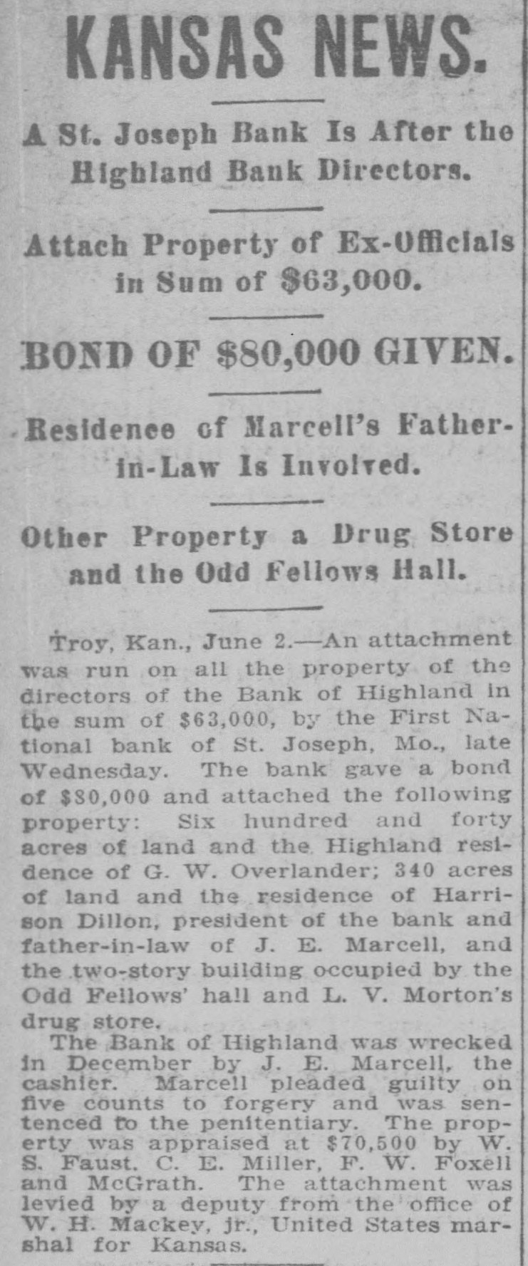land had no railroad. Up to date he has not succeeded in fetching one in. A railroad into Highland would do a thriving business these days hauling in creditors of Marcell's bank. Marcell is great on display. He likes to stick a feather in his hat and go on dress parade. He was grand marshal of the Fourth of July celebration last year. Widows seemed to be Marcell's special prey. If there was one in this section of the country who was not caught in the bank failure it was because she had no money to deposit. Several of them lost every cent they had. Two or three churches lost their surplus cash. The Christian church, of which Marcell was treasurer, lost $900. However. it has not much room for complaint, as Marcell gave it $1,500 a short time ago for a new building. As evidence of Marcell's boldness, one instance is here given. D. B. Williams, a grain buyer, was a heavy patron of the bank. His office was right across the hall from that of Mr. Overlander, a capitalist. Marcell is said to have forged Williams' name to a lot of paper and sold it to Overlander. Williams and Overlander were regular chums and were almost constantly together, yet Marcell worked his scheme right under their noses. Last week a cattle buyer bought about $8,000 worth of cattle and hogs of farmers near Severance. He gave them checks on the Bank of Highland. He shipped the stock to St. Joseph and sold it. All of his checks are back protested and the farmers are holding the bag. He has failed to put in an appearance up to date. St. Joseph, Atchison and Kansas City banks dealt liberally with the Bank of Highland. Whenever they would demand more security, Marcell would say "certainly," and turn over a few more notes to them. Now it has been found that these notes were forged. Most of the forged notes held by outside banks bear Marcell's guaranty as cashier of the bank. This binds the bank. Wednesday forenoon Deputy Bank Commissioner Crummer drove from Denton to Highland. A mule buyer, who was a heavy creditor of the bank started at the same time. When they reached Severance, Marcell had just arrived from Troy. He got a team and the three rigs raced clear to Highland. Marcell beat Crummer there and was fixing up some accounts when the latter arrived. The mule buyer was third in the race. Crummer stopped all proceedings when he reached the bank and took charge of everything. Marcell showed his nerve when he started for the Troy jail accompanied by the sheriff. Without any display et feeling, he kissed his wife and children and lighted a cigarette and started off As the buggy started his little boy threw him a kiss and told him to come back soon. The forgeries were discovered by accident. The Atchison Savings bank, which held three $10,000 notes of Hutt & Shonyo, mule dealers at Highland, sent an inspector to look after the paper. The inspector found that two o the notes were forgeries. He went straight to Marcell's bank. Marcell said there had been some mistake made and without quivering, went to the safe, go $30,000 in cash and took up all three notes. This transaction became noised about and the run Monday was the result. It is now estimated that the amount of forged notes will reach a quarter of a million dollars. Representatives of va rious banks are appearing daily with Marcell's forged notes. A representa tive from Atchison brought a bundle amounting to $55,000, and another from the Mechanics' bank of St. Louis ar rived today with an even larger budget Nearly all the forged paper is held by parties away from Highland, yet a little was floated even here at home The persons whose signatures have been used most frequently on the forged notes, and the approximate amounts SO far turned up agains them ,are: B. D. Williams, $90,000; Hut & Shonyo, $40,000; Bottiger & Hutt $30,000; Mrs. V. M. Johnson, $35,000; o D. and G. W. Moore, $7,000; J. H Lynds, $15,000; Cas Winkler, $13,000; W H. Noble, $1,400; W. R. Gilmore, $1,400 H. C. Pierce and J. B. Muzum, $2,000 W. S. Gaust, $1,000; Mr. and Mrs. J F. Bottiger, $2,000. B. D. Williams and Hutt & Shony are mule firms doing an extensive bus iness. Bottiger & Hutt were mule buyers but have dissolved partnership Mrs. V. M. Johnson is the widow o the late Highland banker, J. P. John
