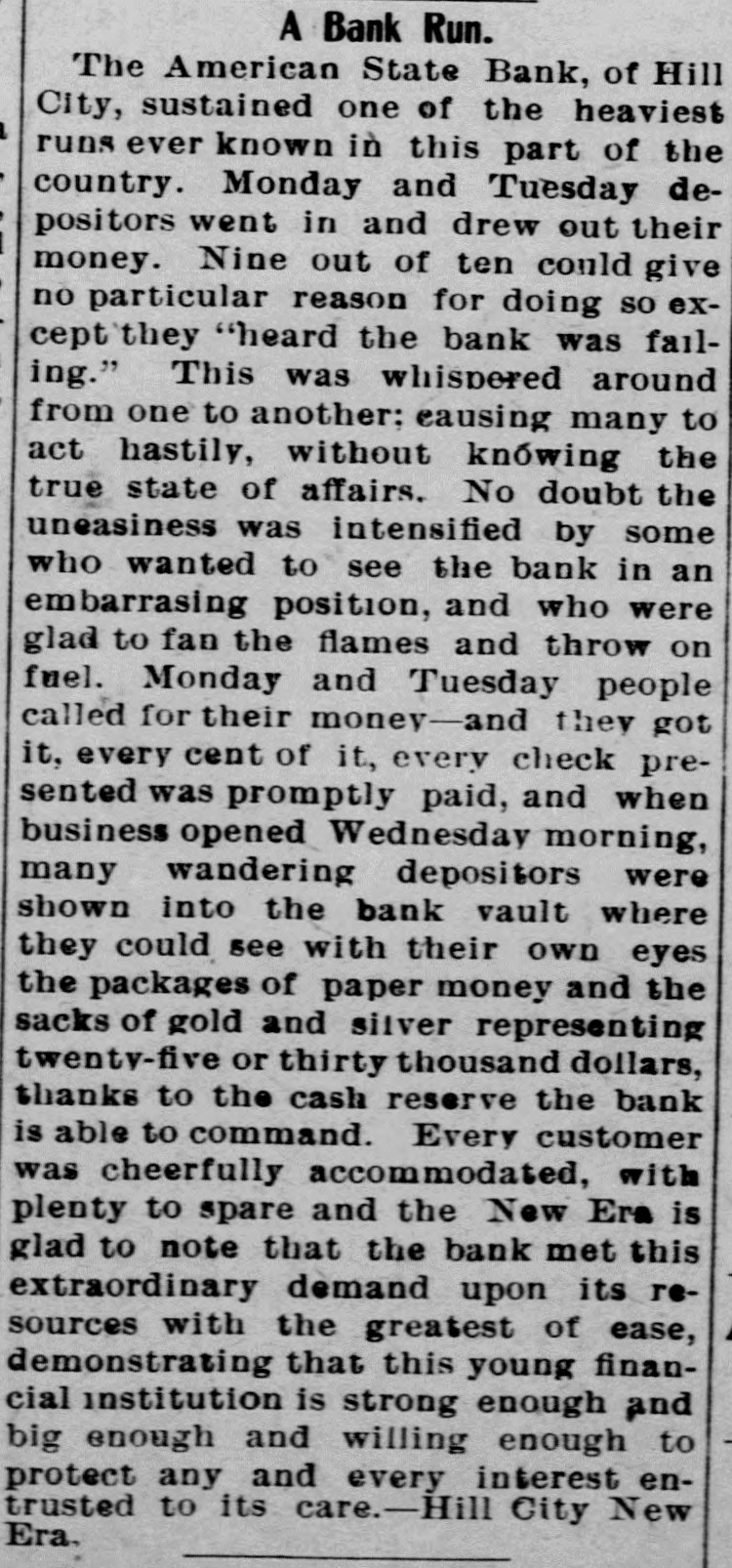A Bank Run. The American State Bank, of Hill City, sustained one of the heaviest runs ever known in this part of the country. Monday and Tuesday depositors went in and drew out their money. Nine out of ten could give no particular reason for doing so except`they "heard the bank was failing." This was whispered around from one to another: causing many to act hastily, without knówing the true state of affairs. No doubt the uneasiness was intensified by some who wanted to see the bank in an embarrasing position, and who were glad to fan the flames and throw on fuel. Monday and Tuesday people called for their money-and they got it, every cent of it, every check presented was promptly paid, and when business opened Wednesday morning, many wandering depositors were shown into the bank vault where they could see with their own eyes the packages of paper money and the sacks of gold and silver representing twentv-five or thirty thousand dollars, thanks to the cash reserve the bank is able to command. Every customer was cheerfully accommodated, with plenty to spare and the New Era is glad to note that the bank met this extraordinary demand upon its resources with the greatest of lease, demonstrating that this young financial institution is strong enough and big enough and willing enough to protect any and every interest entrusted to its care.-Hill City New Era.