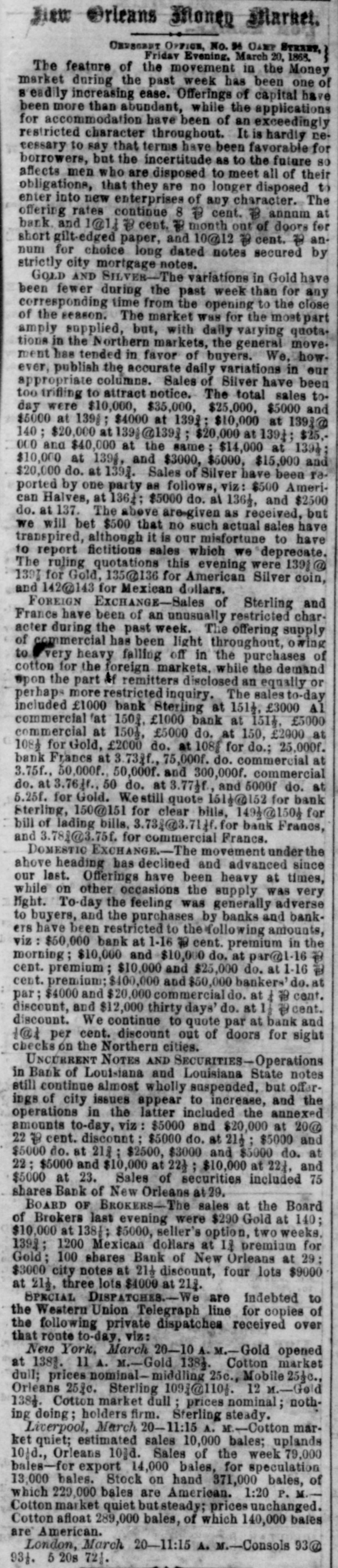 AUCTION SALES MONDAY. CHAS corner T. St. NASH Charlesand sells. Perdido, at 11 o'clock A. M., at salesroom MONTGOMERY BROS. & CO. furniture, sell at 11 A. M., at Phil. Liner's stables, Gravier street, horses. mules, etc. or See advertisements on second page. Market. Orleans Money CHESCRET OFFICE. No. 94 CAMP STREET, Saturday Evening, July 25, 1868. There has been no movement in the Money market to-day that calls for special remark. Gold opened at New York this morning at 143}, against 1431. the closing rate yesterday. At 10:30 A. M. and 12 M. it was still quoted at the opening figure, and M. it closed at the same. Rates have been firm in this market throughout, and with a limited demand and supply operations have been restricted to the appended amounts, viz $2000, $6000 and $10 000 Gold at 1421; $1000 and $6000 do. at 143, and $1000 American Silver halves at $1364. We now quote Gold 1422@143. Ameri. @147. can Silver 136@136}, and Mexican Dollars 1461 FOREIGN EXCHANGE-Sterling and Francs have been inactive but firm since our last. Offerings of commercial bills indicated no increase whatever, and the remittance demand has been of a barely moderate character. We subjoin particulars of the actual sales, as follows, VIZ £3000 bankers' Sterling at 1581, and 000f. bankers' Francs at 3.571 We still quote bank Sterling 158@1584. clear bills 157@157}, bill of lading bills 156@156} 3.60. bank Francs 3.57$, and commercial do. 3.622@ DOMESTIC EXCHANGE-There has been no alteration of any kind noticeable in the movement un. der the above heading since our last. The mar ket is but very scantily supplied with commercial sight and short sight, and the inquiry on the part of remitters his indicated, if anything further abatement. Quotations disclose but little if any variation, however, and the annexed purchases by banks and bankers were effected at previous figures, viz: $17 .000 commercial sight on Washington at par, $16,000 Al commercial do. on New York at % cent. premium, and $12 000 do. at % cent. premium. We still quote 1 R cent. premium at bank, and @ R cent. premium out of doors for sight checks on Northern cities. UNCURRENT NOTES AND SECURITIES City notes are weaker to-day, but as no one could give a jus. tinable reason for the recent advance, 80 nobody is willing to give a satisfactory pretext for the present reaction. Louisiana State notes are unchanged, while operations in Bank of Louisiana notes are wholly suspended and the movement in all classes of Stocks and Bonds continues of a very limited character. The following are the only actual transactions reported under the above heading since our last, VIZ: $2000 and $30,000 City notes at 37 @ cent. discount. $7000 old Louisiana State bonds at 65. $2000, $2500 and $3000 Louisiana State notes at67, $5000 do. at 671, $5000 do, at 68 $3000 do. at 681c. and 15 and 20 Levee State bonds at 53jc. P dollar. SPECIAL Dispatches.-We are indebted to the Western Union Telegraph line for copies of the following private dispatches received from that route to-day, viz: New York, July 25-10 A. .-Gold opened at 1431. 10:30 A. Cotton market dull prices nominally unchanged. Sterling 110]@110£ Gold 1434. 12 M -Gold 1431. Cotton market dullprices tending down, though not quotably lower. Sterling steady Liverpool, July 25-3 P. 104d., Orleans to-day 8000 bales. SIR MORTON PETO AND HIS Associates.-The London Daily News, in its city article of the even ing of the 6th, gives the following account of the final settlement of the affairs of Sir Morton Peto and his associates: " In the bankruptcy court to day, no opposition being made, Sir S. M. Peto, Bart., and Messrs. Betts & Crampton, the great railway contractors, passed their examinations. and received their or ders of discharge. It appears that, as a result of the investigations made by the accountants on each side, it has been discovered that there is no such debt as £210 000 due from the railway com pany to the bankrupts, as claimed by the latter, and that, on the contrary, a large sum is due from the firm to the company. On the other hand the railway company content themselves with proving for £365 000 against the estates of the three bank rupts, and for £119 000 against that of Peto and Betts, instead of the preposterous sum of £6 600, 000 originally claimed. Owing to the mode in which the affairs of the two firms of Peto, Betts & Crampton, and Peto & Betts were conducted, a large sum-as much as £800,000 which ought to form part of the estate of the three bankrupts, will be applied exclusively towards the discharge of the liabilities of Peto & Betts, the result being that the joint estate of the three bankrupts will be impoverished, and that nothing will be available for the creditors thereon after payment of the costs of the proce "ings." FINANCIAL PROSPECTS IN THE UNITED STATES We take the following from Henry Clews & Co.'s New York circular for the month ending the 15th inst. It was prepared for transmission to Europe by the steamer of that date, and can hardly be expected to have 8 reassuring effect, SO far as regards United States securities held abroad, and gold: now being rapidly returned for conversion into 'There appears to be a very general impres. sion that gold is likely to work up to higher premium. Indications are not wanting that our foreign trade is approaching a crisis, the charac ter and importance of which are but partially ap. preciated. Owing to the deficiency of our home production, we have, for the last five years, im ported foreign products largely in excess of the ordinary means of payment, viz: Produce and the precious metals; and the resulting deficiency has been set off by the remittance of United States securities to the extent of 000 000, or say, one third of our whole gold interest debt. Beyond the reinvestment of a portion of the in terest on these obligations, Europe may be said to have now almost suspended purchases of our bonds; nor is it likely considering the immense sum of