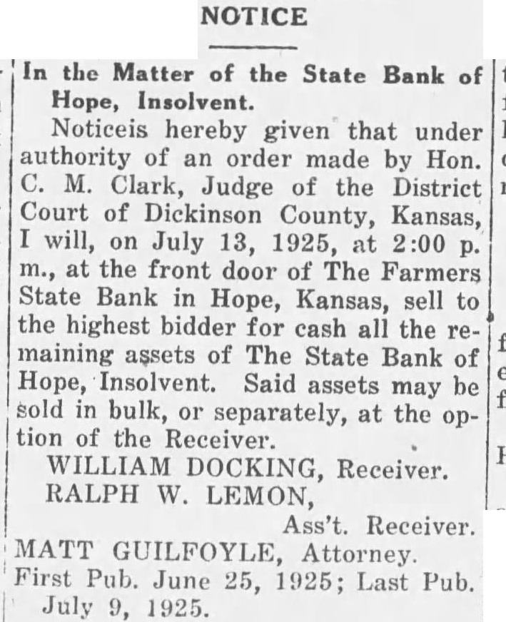 NOTICE In the Matter of the State Bank of Hope, Insolvent. Noticeis hereby given that under authority of an order made by Hon. M. Clark, Judge of the District Court of Dickinson County, Kansas, will, on July 13, 1925, at at the front door of The Farmers State Bank in Hope, Kansas, sell to the highest bidder for cash all the maining assets of The State Bank of Hope, Insolvent. Said assets may be sold in bulk, or separately, at the option of the Receiver. WILLIAM DOCKING, Receiver. RALPH W. LEMON, Ass't. Receiver. MATT GUILFOYLE, Attorney First Pub. June 25, 1925; Last Pub. July 1925.