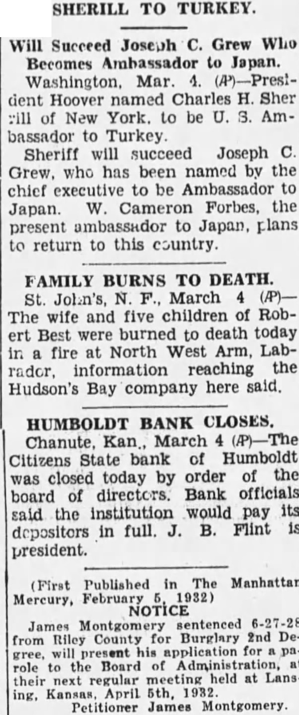 SHERILL TO TURKEY. Will Succeed Joseph C. Grew Who Becomes Ambassador to Japan. Mar. dent Hoover named Charles Sher will of New York. to be Ambassador Sheriff will succeed Joseph Grew. who has been named by the chief executive to be Ambassador to Japan. W. Cameron Forbes, the present to Japan, plans return to this country. FAMILY BURNS TO DEATH. St. John's, March The wife and five children of Robert Best burned to death today in fire at North West Arm, Labrador, information reaching the Hudson's Bay company here said. HUMBOLDT BANK CLOSES. Chanute, Kan., March Citizens State bank Humboldt was closed today by order the board of directors. Bank officials said the institution would pay its full. B. Flint depositors in president. Published in The Manhattan (First Mercury, James Montgomery sentenced from Riley Burglary Board LansPetitioner James