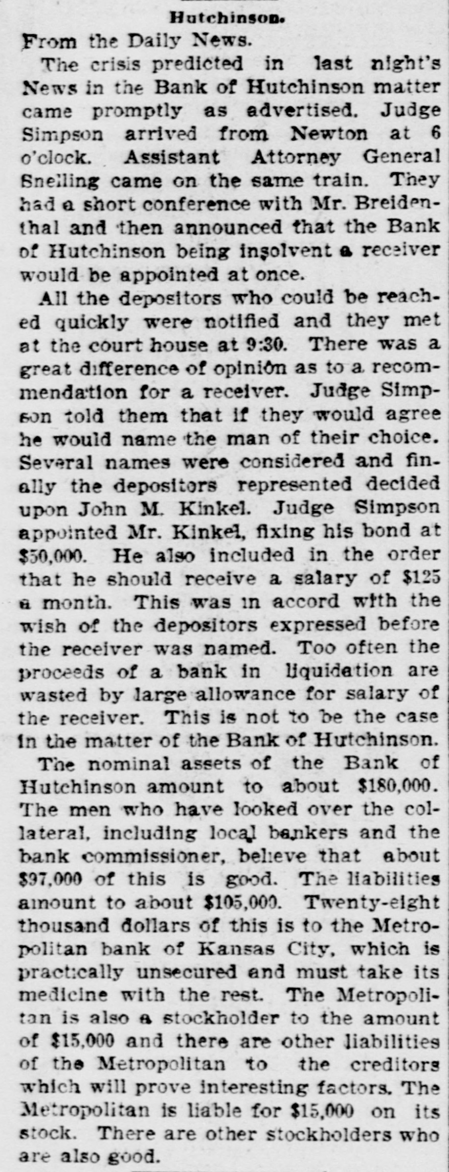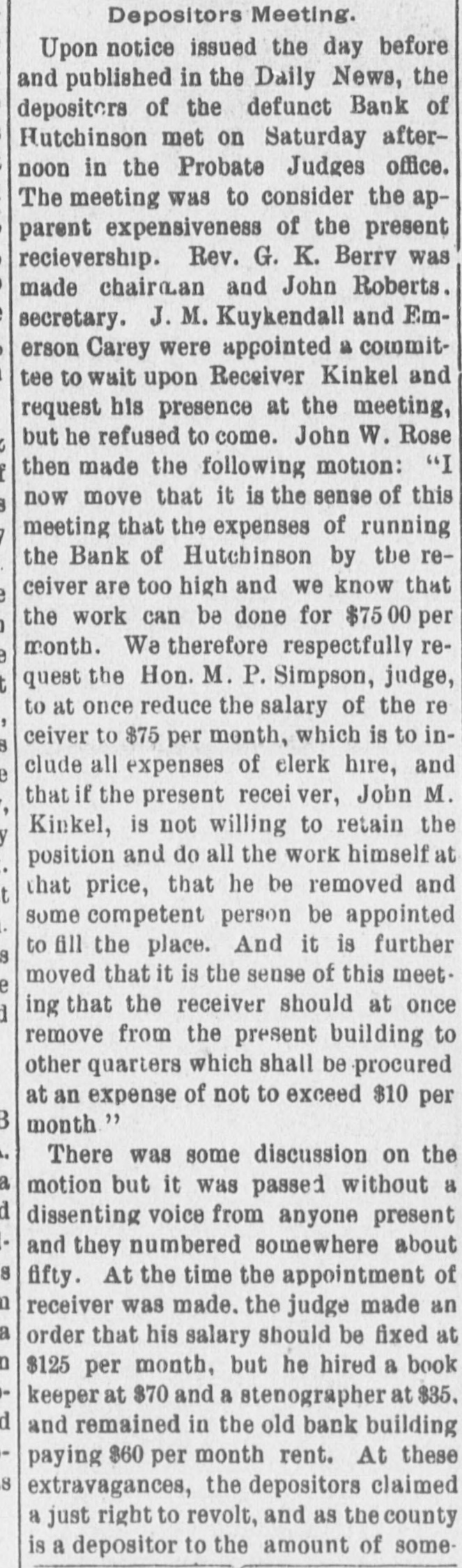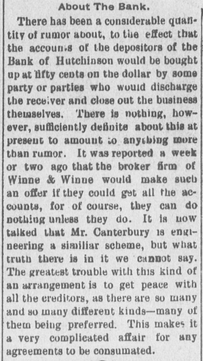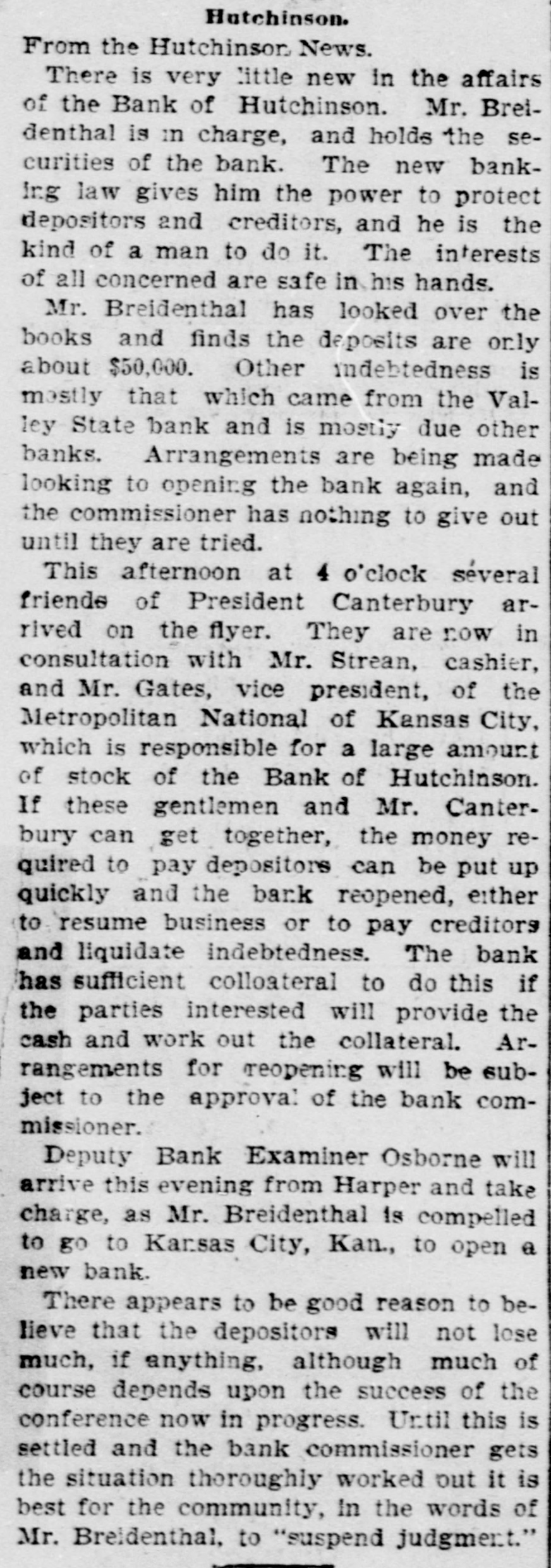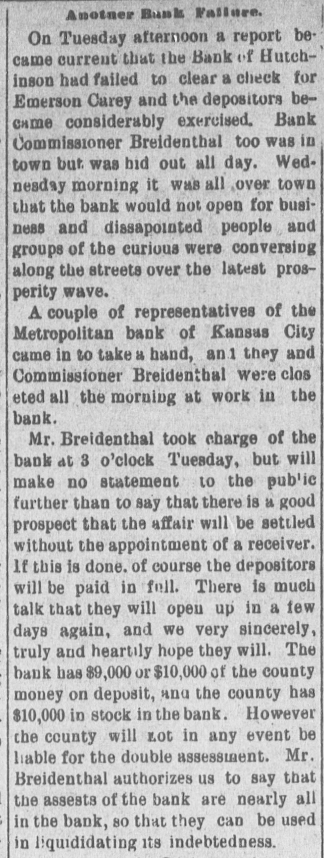The New Bank. EDITOR HUTCHINSON GAZETTE: I notice by your paper that the Bank of Hutchinson has opened for business. This is pleasant news to the depositors of the defunct Valley State Bank. If the gentlemen who have organized the Bank of Hutchinson had not come here and invested their money in this enterprise, the affairs of the Valley State Bank would have to pass through a tedious receivership and after the expenses of the receivership were paid if the depositors got anything they might be thankful. When the Hutchinson National went under people thought that the assets, with a levy of 75 per. cent on the solvent stockholders would more than pay out. But the receivership is now "dragging its weary length along" through its third year; some of the funds of the bank were wasted in a foolish lawsuit and now if the depositors receive thirty-five cents on the dollar they will be getting all they expect. We ought to give the new bank all the encouragement we can. By the opening upof the new bank thousands of dollars have been saved to the reople of the county. And though the management of the bank have gone into it from no philanthropic motives, but because they regarded it as a paying investment, yet because they have done so the people and the county have been greatlv benefitted. Let us visit the new bank, get acquainted with the officers and give them at least a word of encouragement. The following is what the State bank commissioner, John W. Breidenthal, says of the new bank, as taken from the Hutchinson News: "I can say to you," said Mr. Breidentnal to a News reporter, "that the Bank of Hutchinson will be one of the strongest in the State. I have looked into that matter carefully and am sure the officers of the bank are worthy of the entire confidence of the people. The bank opens without a remnant of the old boom the bursting of which demoratized values, and will be ready and able to give your city and country the very best of service. It will be a great help to the business community and I am sure will be a successful business institution." ONE OF THE DEPOSITORS OF THE VALLEY STATE BANK.