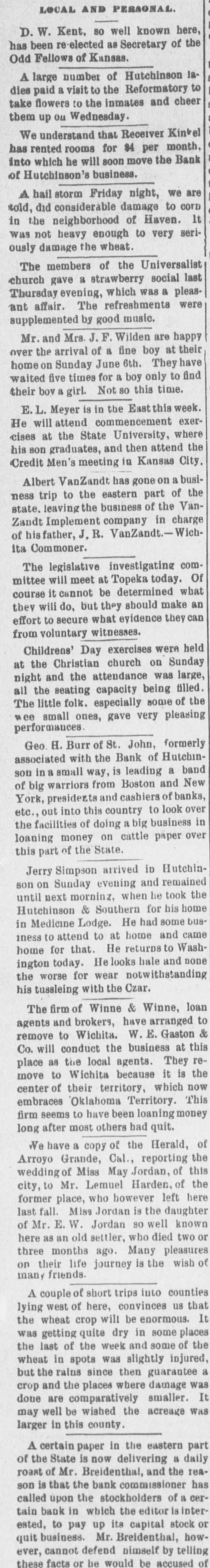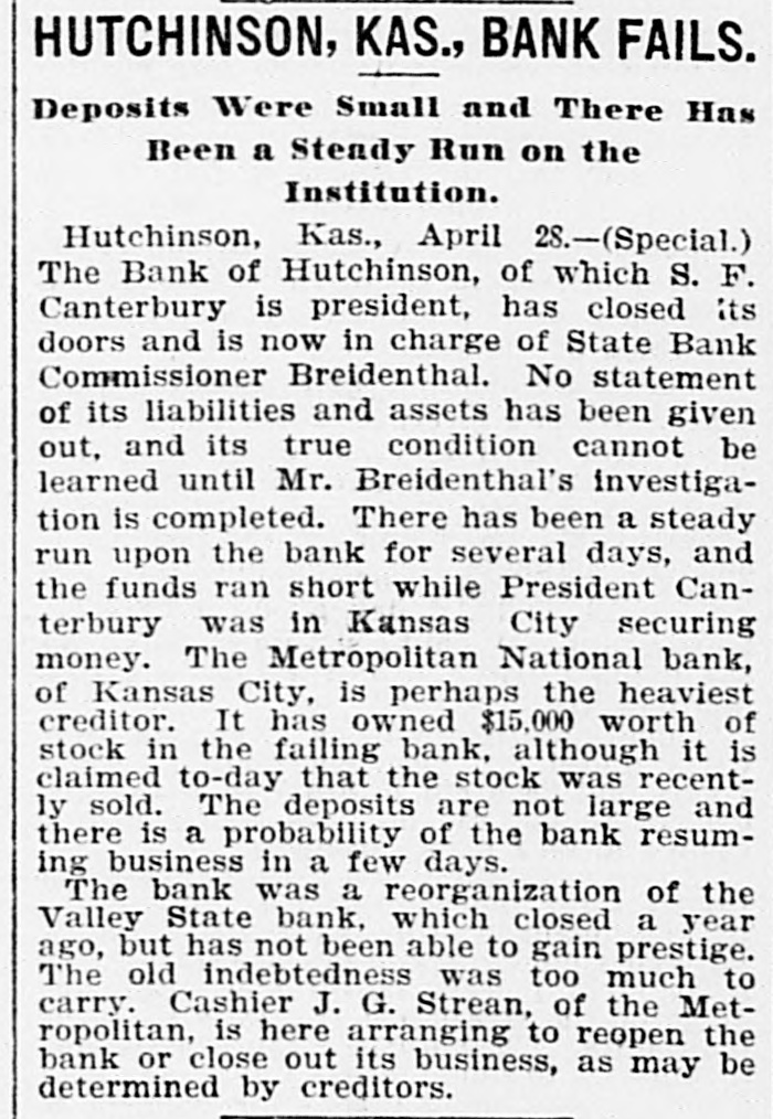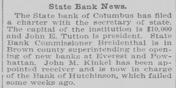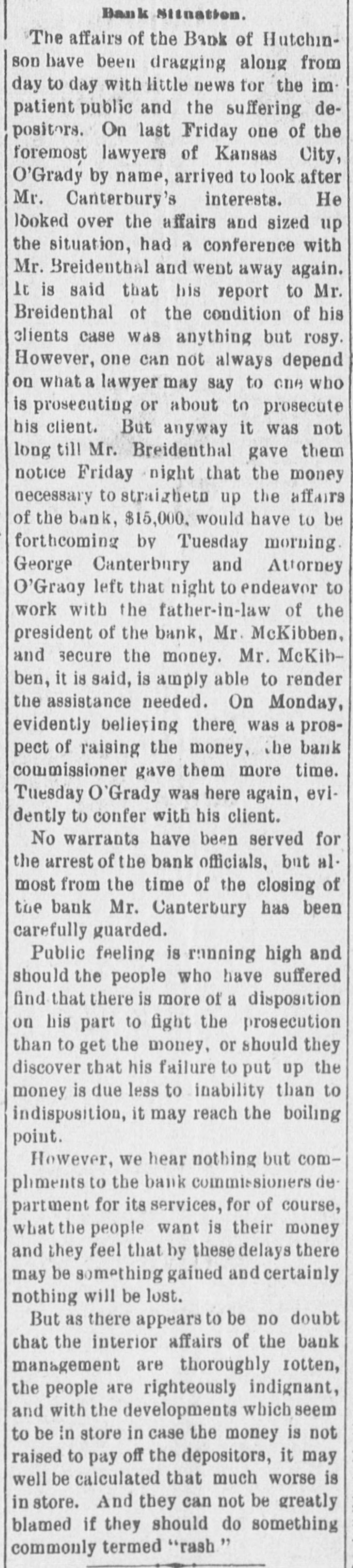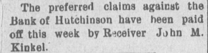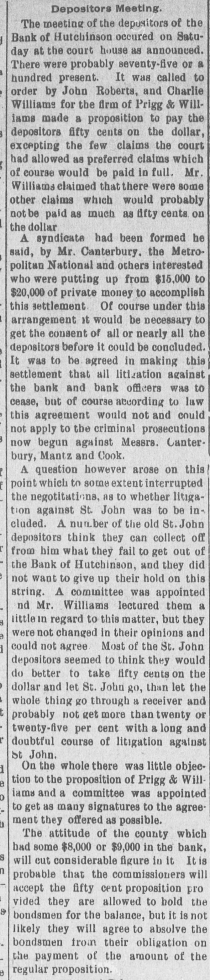 The New Bank. EDITOR HUTCHINSON GAZETTE: I notice by your paper that the Bank of Hutchinson has opened for business. This is pleasant news to the depositors of the defunct Valley State Bank. If the gentlemen who have organized the Bank of Hutchinson had not come here and invested their money in this enterprise, the affairs of the Valley State Bank would have to pass through a tedious receivership and after the expenses of the receivership were paid if the depositors got anything they might be thankful. When the Hutchinson National went under people thought that the assets, with a levy of 75 per. cent on the solvent stockholders would more than pay out. But the receivership is now "dragging its weary length along" through its third year; some of the funds of the bank were wasted in a foolish lawsuit and now if the depositors receive thirty-five cents on the dollar they will be getting all they expect. We ought to give the new bank all the encouragement we can. By the opening upof the new bank thousands of dollars have been saved to the reople of the county. And though the management of the bank have gone into it from no philanthropic motives, but because they regarded it as a paying investment, yet because they have done so the people and the county have been greatlv benefitted. Let us visit the new bank, get acquainted with the officers and give them at least a word of encouragement. The following is what the State bank commissioner, John W. Breidenthal, says of the new bank, as taken from the Hutchinson News: "I can say to you," said Mr. Breidentnal to a News reporter, "that the Bank of Hutchinson will be one of the strongest in the State. I have looked into that matter carefully and am sure the officers of the bank are worthy of the entire confidence of the people. The bank opens without a remnant of the old boom the bursting of which demoratized values, and will be ready and able to give your city and country the very best of service. It will be a great help to the business community and I am sure will be a successful business institution." ONE OF THE DEPOSITORS OF THE VALLEY STATE BANK.