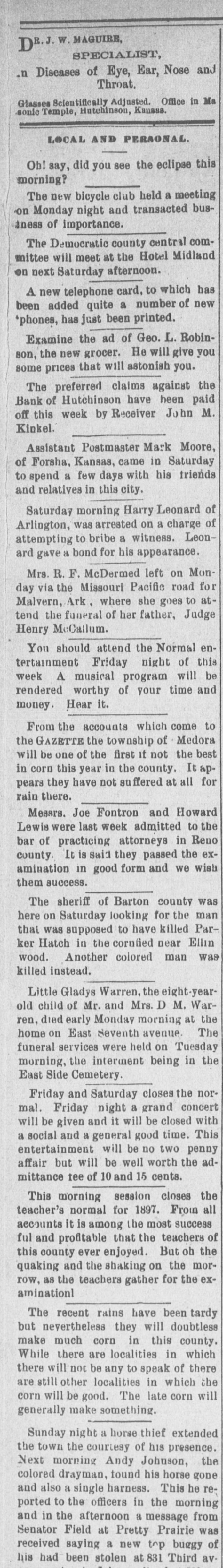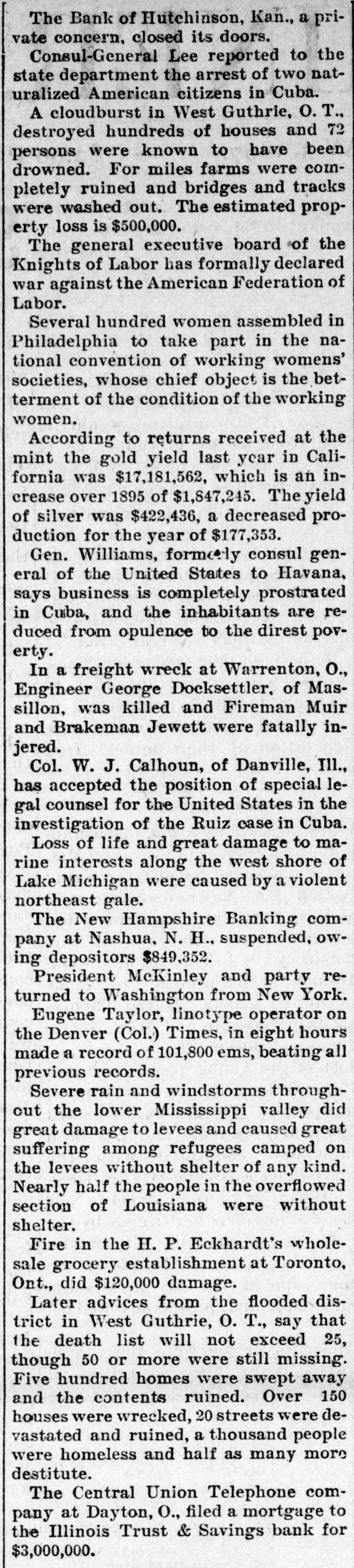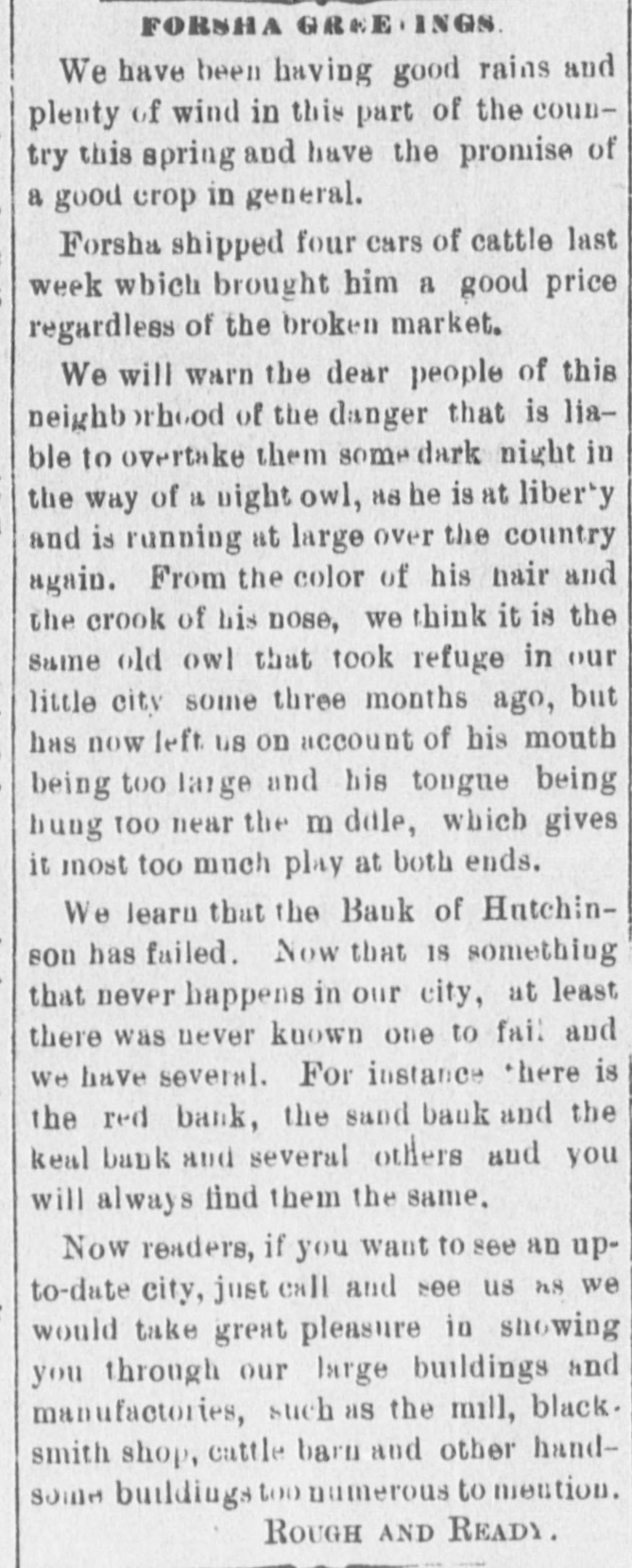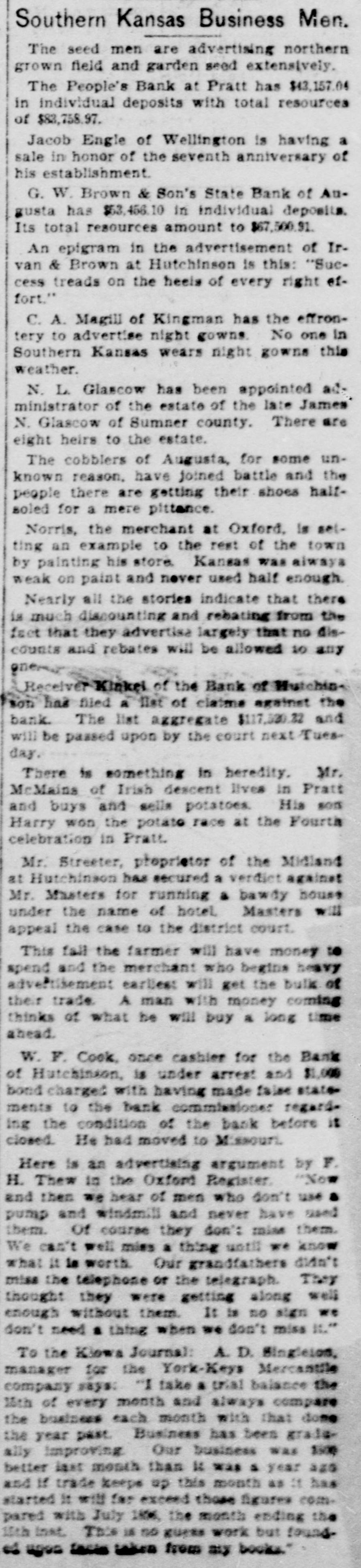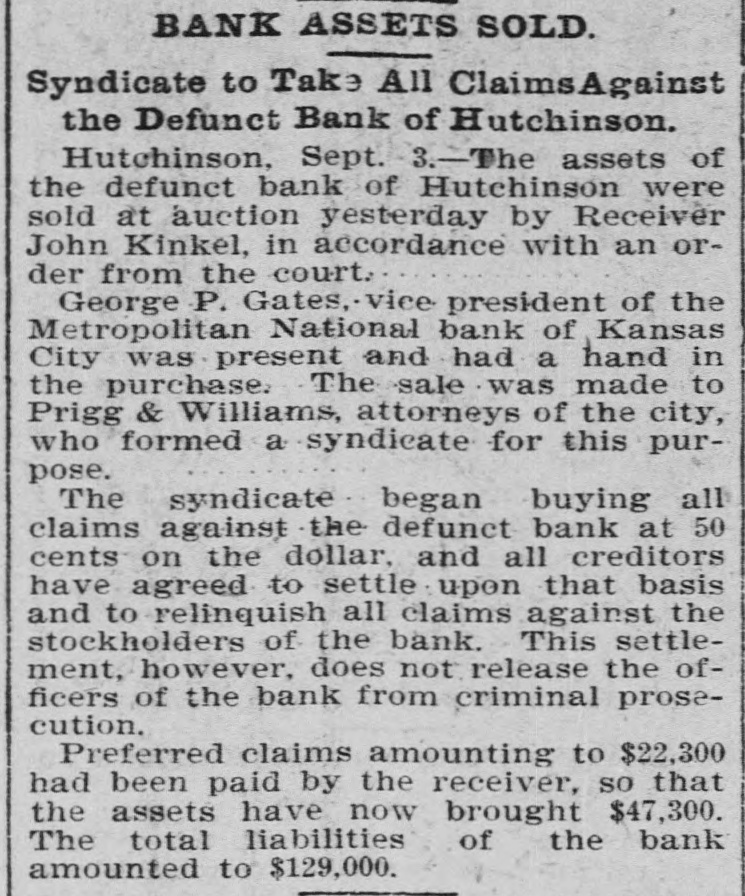 The New Bank. EDITOR HUTCHINSON GAZETTE: I notice by your paper that the Bank of Hutchinson has opened for business. This is pleasant news to the depositors of the defunct Valley State Bank. If the gentlemen who have organized the Bank of Hutchinson had not come here and invested their money in this enterprise, the affairs of the Valley State Bank would have to pass through a tedious receivership and after the expenses of the receivership were paid if the depositors got anything they might be thankful. When the Hutchinson National went under people thought that the assets, with a levy of 75 per. cent on the solvent stockholders would more than pay out. But the receivership is now "dragging its weary length along" through its third year; some of the funds of the bank were wasted in a foolish lawsuit and now if the depositors receive thirty-five cents on the dollar they will be getting all they expect. We ought to give the new bank all the encouragement we can. By the opening upof the new bank thousands of dollars have been saved to the reople of the county. And though the management of the bank have gone into it from no philanthropic motives, but because they regarded it as a paying investment, yet because they have done so the people and the county have been greatlv benefitted. Let us visit the new bank, get acquainted with the officers and give them at least a word of encouragement. The following is what the State bank commissioner, John W. Breidenthal, says of the new bank, as taken from the Hutchinson News: "I can say to you," said Mr. Breidentnal to a News reporter, "that the Bank of Hutchinson will be one of the strongest in the State. I have looked into that matter carefully and am sure the officers of the bank are worthy of the entire confidence of the people. The bank opens without a remnant of the old boom the bursting of which demoratized values, and will be ready and able to give your city and country the very best of service. It will be a great help to the business community and I am sure will be a successful business institution." ONE OF THE DEPOSITORS OF THE VALLEY STATE BANK.