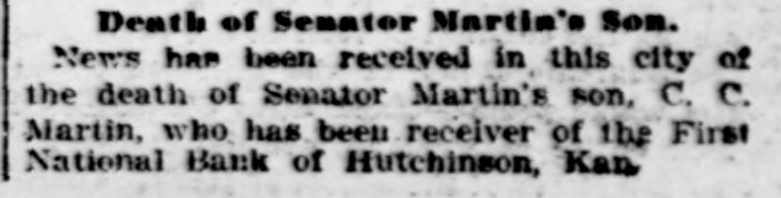 News has been received in this city of the death of Senator Martin's son, C. C. Martin, who has been receiver of the First National Bank of Hutchinson, Kan.