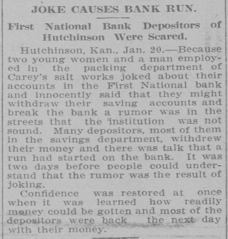 JOKE CAUSES BANK RUN. First National Bank Depositors of Hutchinson Were Scared. Hutchinson, Kan., Jan. 20. Because two young women and a man employed in the packing department of Carey's salt works joked about their accounts in the First National bank and innocently said that they might withdraw their saving accounts and break the bank a rumor was in the streets that the institution was not sound. Many depositors, most of them in the savings department, withdrew their money and there was talk that a run had started on the bank. It was two days before people could understand that the rumor was the result of joking. Confidence was restored at once when it was learned how readily money could be gotten and most of the the next day depositors were back with their money.