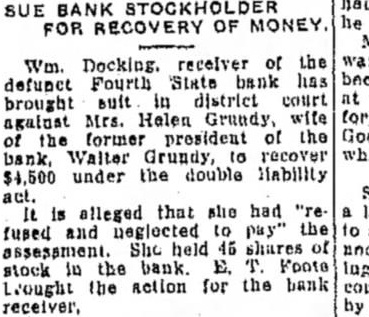 SUE BANK FOR RECOVERY OF MONEY. Wm. Docking. receiver of the defunct Fourth State bank has in district court brought against Mrs. Halen Grundy, wife the former president of the bank, Walter Grundy, recover $4,500 under the double liability act. is alleged that she had fused and neglected the She held shares stock in the bank. E. Foote L'ought the action for the bank