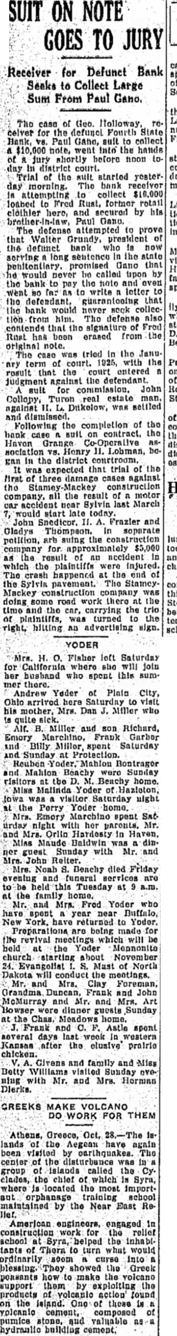 SUIT ON NOTE GOES TO JURY Receiver for Defunct Bank Seeks to Collect Large Sum From Paul Gano. The case of Geo. Holloway, re. celver for the defunct Fourth State $10,000 note, went into the hands of jury shortly before noon today district court. Trial of the suit started yester. day morning. The bank receiver attempting to collect $10,000 loabed to Fred Rust, former rotail clothier here, and secured by his The defense attempted to prove that Walter Grundy, president of the defunct bank who la now serving long sentence In the state penitentiary. promised Gano that he would never be called upon by the bank to pay the note and oven went so far ns to write n letter to the defendant, that the bank would hever seck collection from him. The defense also contends that the signature of Fred Rost has boon eraned from the original note. The caso was tried In the Janu. ary term of court. 1025, with the result that the court entered judgment against the defendant. sult for John Collopy, Turon real estate man, and dismissed. Following the completion of the bank case Buil on contract, the sociation vs. Henry 11. Lohman, be. gan In the district constroom. was expected that trial of the first of three damage cases against the company. all the result of motor car accident near Sylvin last March would start late today. John Snedicor. II. A. Frazier and potition, arb suing the construction company for $5,000 as the result of nn accident in which the plaintiffs were injured. The crash happened at the end of the pavement. The Stamey. Mackey construction company was doing some road work there nt the time and the car, carrying the trio of plaintiffs, turned to the right, hilting an advertising sign. YODER Mrs. H. O. Fisher loft Saturday for California where she will join her husband who spent this summer Andrew Yoder of Plain City, Ohio arrived here Saturday to visit his mother, Mrs. Dan J. Miller who to quite sick. Alf. B. Miller and son Richard, Emory Marchino, Frank Garber and Billy Miller, spent Saturday and Sunday at Protection. and Mahion Beachy were Sunday risitors nt the D. M. Beachy home. Miss Malinda Yoder of Hazleton, town was a visitor Saturday night at the Perry Yoder home. Mrs. Emory Marchino spent Saturday night with her parents. Mr. and Mrs. Orlin Hardesty In Haven. Miss Maude Baldwin was din. ner guest Sunday with Mr. and John Relter. Mrs. Noah S. Beachy died Friday ovening and funeral are to be held this Tuesday at 9 a.m. the family home. Mr. and Mrs. Frod Yoder who have spent year near Buffalo, York. have returned to Yoder. Preparations are being made for flre revival meetings which will be held at the Yoder Mennonite church starting about November 24. Evangellst S. Mast of North Dakota will conduct the meetings. Mr. and Mrs. Clay Foreman, Grandma Duncan, Frank and John McMurray and Mr. and Mrs. Art Bowser were dinner guests Sunday at the Chas. Meadows home. Frank and C. Astle spent several days Inst week In western Kansas after the clusive prairie chicken. Givens and family and Miss Betty Williams Sunday DVOning with Mr. and Mrs. Horman CREEKS MAKE VOLCANO DO WORK FOR THEM lands the Aegean have again been visited by oarthquakes. The center of the disturbance was in group of islands called the Cy. clades, the chief of which is Syra, where is located the most importaut orphanage training school maintained by the Near East Re- American engineers, engaged in construction work the relief school at Syra, helped the inhabitants of Thern to turn what would ordinarily soom curse into blessing. They showed the Greek poasants how to make the volcano support them by exploiting the products of volcanio action found on the island. One of these is volcanio cement, composed of purnice stone, and valuable hydraulic building cement.