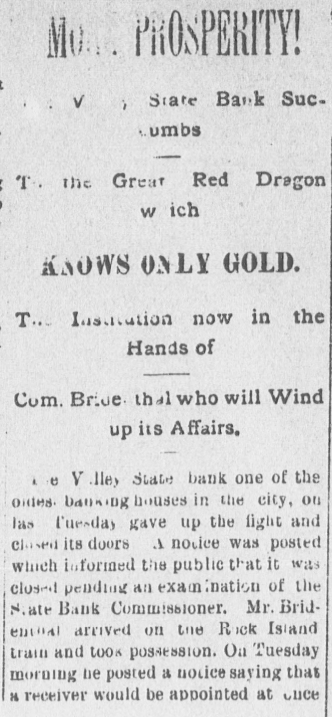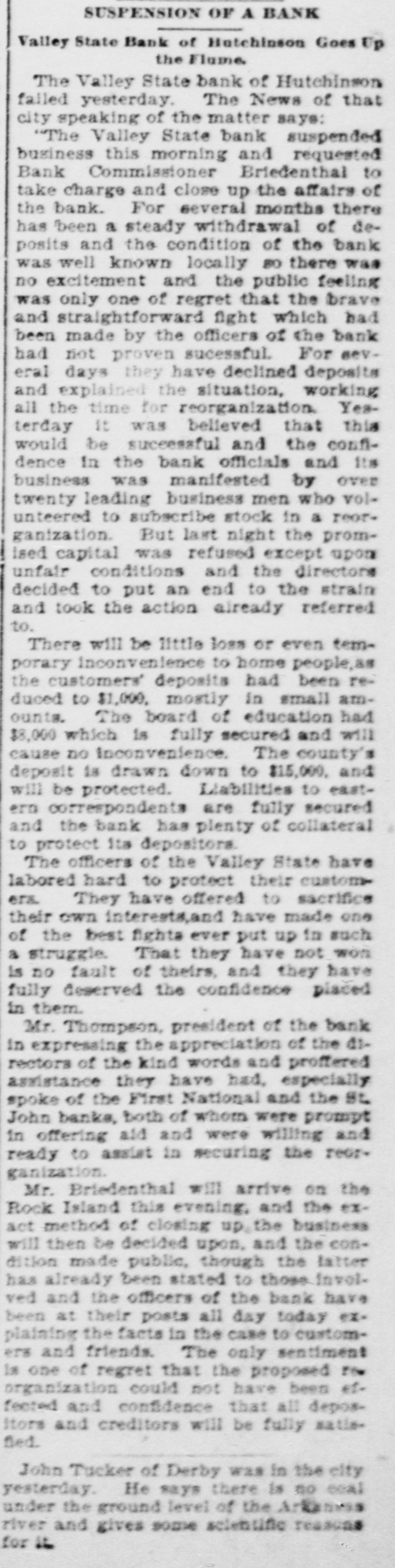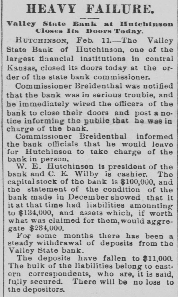 The bank commissioner has closed the Valley state bank at Hutchinson.