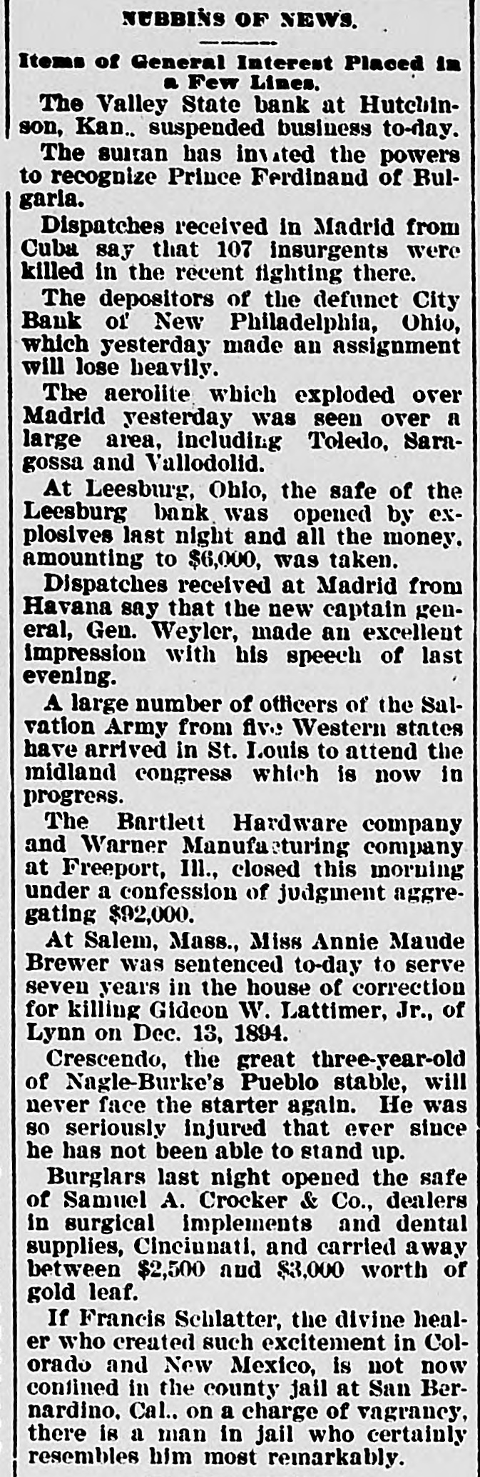 The supreme court has decided that "no court has the power to fix the time for the execution of a death sentence before the governor has named a day for carrying it into effect, when he refuses to issue a warrant for that purpose." This disposes of the much discussed Edwards county case, wherein it was sought to take Arnold and Harvey, the murderers of Mayor Marsh, of Kinsley, from the penitentiary and execute them without the warrant, which the governor refused to issue.