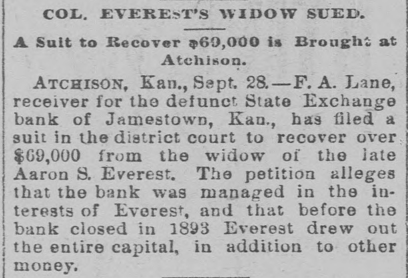 COL. EVERESTS WIDOW SUED. A Suit to Recover $69,000 is Brought at Atchison. ATCHISON, Kan., Sept. 28.-F. - A. Lane, receiver for the defunct State Exchange bank of Jamestown, Kan., has filed a suit in the district court to recover over $69,000 from the widow of the late Aaron S. Everest. The petition alleges that the bank was managed in the interests of Everest, and that before the bank closed in 1893 Everest drew out the entire capital, in addition to other money.
