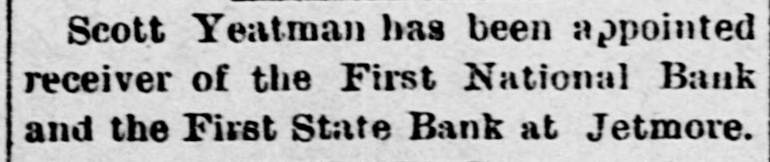 Article (May 7, 1897) states Scott Yeatman was appointed receiver of the First National Bank at Jetmore. No mention of a prior run; receiver appointment implies closure/receivership. No reopening reported.
