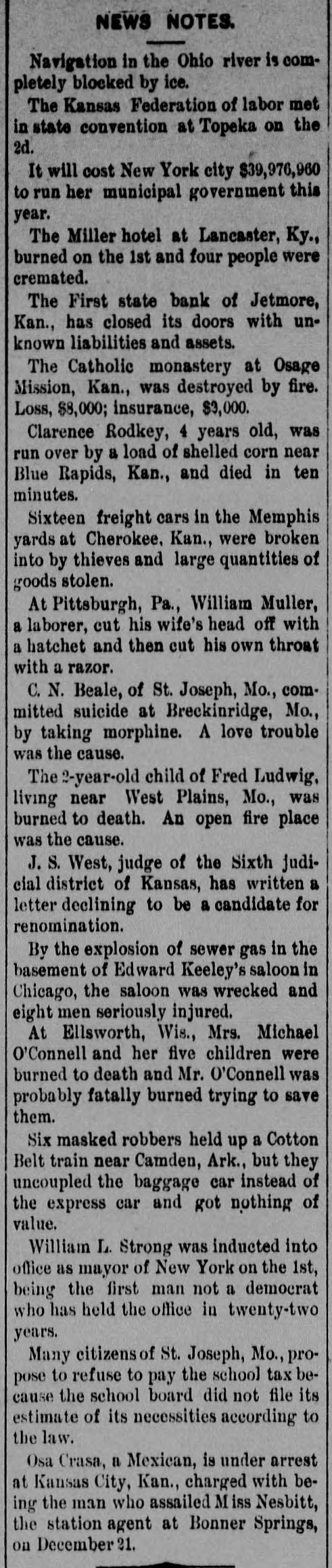 NEWS NOTES. Navigation in the Ohio river is completely blocked by ice. The Kansas Federation of labor met in state convention at Topeka on the 2d. It will cost New York city $39,976,960 to run her municipal government this year. The Miller hotel at Lancaster, Ky., burned on the 1st and four people were cremated. The First state bank of Jetmore, Kan., has closed its doors with unknown liabilities and assets. The Catholic monastery at Osage Mission, Kan., was destroyed by fire. Loss, $8,000; insurance, $3,000. Clarence Rodkey, 4 years old, was run over by a load of shelled corn near Blue Rapids, Kan., and died in ten minutes. Sixteen freight cars in the Memphis yards at Cherokee, Kan., were broken into by thieves and large quantities of goods stolen. At Pittsburgh, Pa., William Muller, a laborer, cut his wife's head off with a hatchet and then cut his own throat with a razor. C. N. Beale, of St. Joseph, Mo., committed suicide at Breckinridge, Mo., by taking morphine. A love trouble was the cause. The 2-year-old child of Fred Ludwig, living near West Plains, Mo., was burned to death. An open fire place was the cause. J. S. West, judge of the Sixth judicial district of Kansas, has written a letter declining to be a candidate for renomination. By the explosion of sewer gas in the basement of Edward Keeley's saloon in Chicago, the saloon was wrecked and eight men seriously injured. At Ellsworth, Wis., Mrs. Michael O'Connell and her five children were burned to death and Mr. O'Connell was probably fatally burned trying to save them. Six masked robbers held up a Cotton Belt train near Camden, Ark., but they uncoupled the baggage car instead of the express car and got nothing of value. William L. Strong was inducted into office as mayor of New York on the 1st, being the first man not a democrat who has held the office in twenty-two years. Many citizens of St. Joseph, Mo., propose to refuse to pay the school tax because the school board did not file its estimate of its necessities according to the law. Osa Crasa, a Mexican, is under arrest at Kansas City, Kan., charged with being the man who assailed M iss Nesbitt, the station agent at Bonner Springs, on December 21.