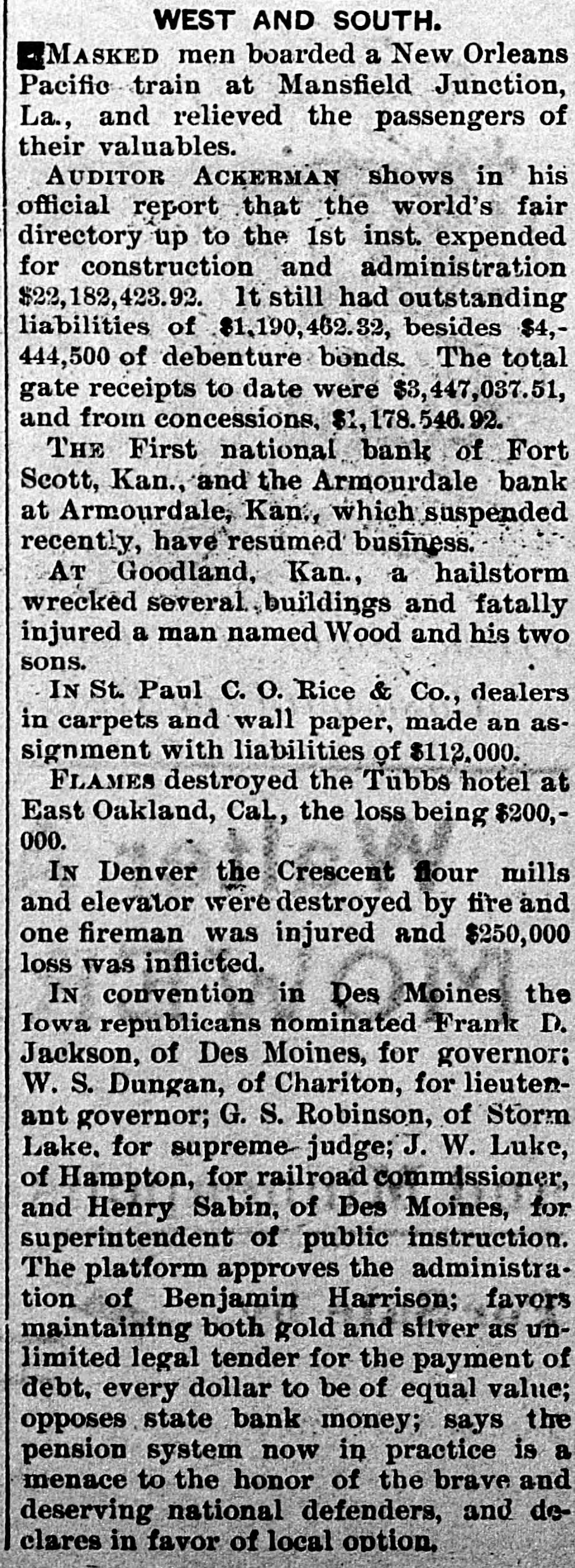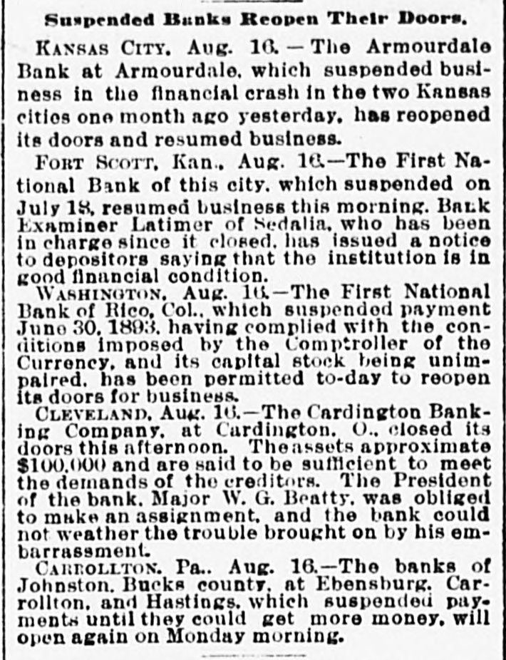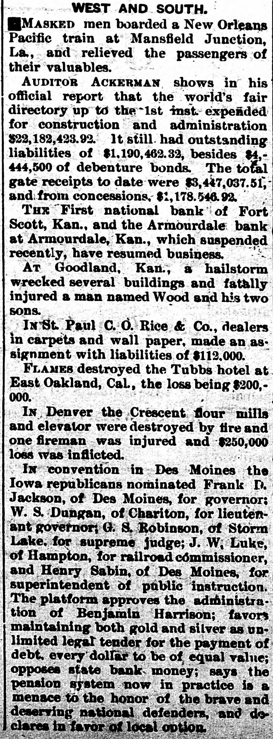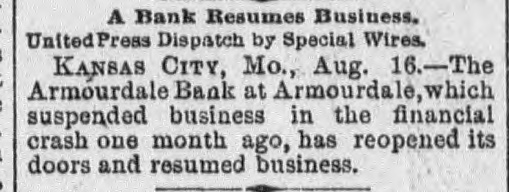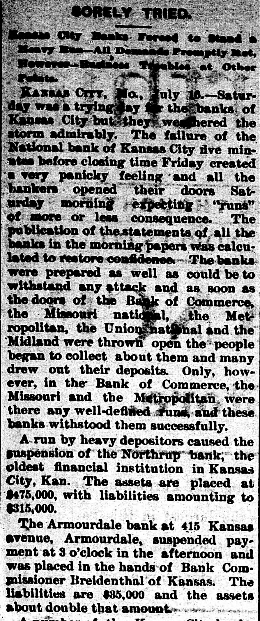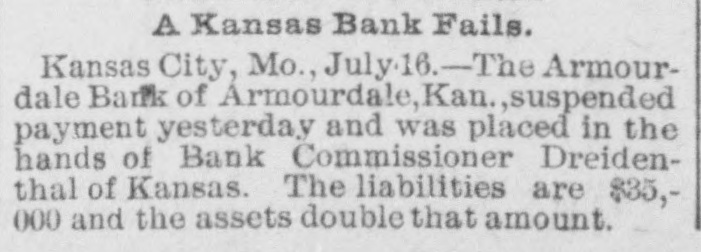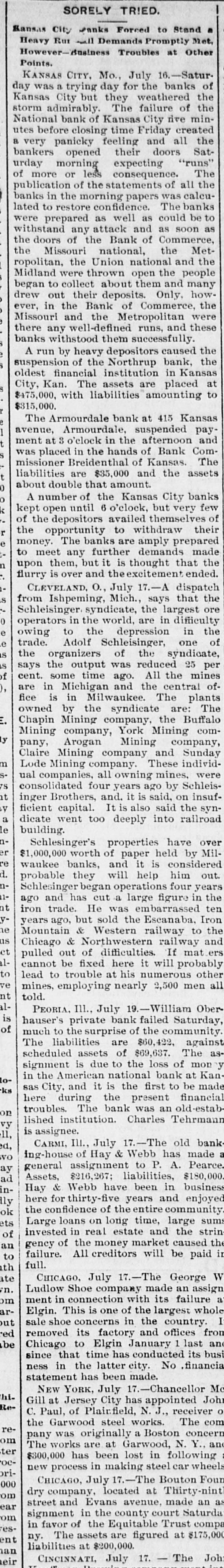 The Daily Record or nanea Failures. LONDON, July 15.-The failure is announced today of Ernest M. E. Fresson, stock and share broker of No. 2 Austin Friars. KANSAS CITY, July 15.-There was a quiet run on the National Bank of Commerce as soon as that concern opened for business this morning. In a statement made yesterday the condition of the bank was shown to be good, and the officers assert they will be able to withstand a long run, which, however, they think will not be necessary. Their statement sh JWS cash on hand $1,141.655, with deposits of $2,977,327, showing more than the 25 per cent reserve law. are talized required at by $2,000,000. They But thought little excite- capi- the ment and it is bank as the bank with the will ranks prevails, pull through strongest. all right, a The directors of the bank held meeting to consider the financial situation yesterday. After very carefully examining into the condition of the bank the members of the directorate signed an agreement individually pledging their entire estates for the security of depositors. There was not a member of who that made him enpaper the board hesitated liable held to for sign by the the the tire amount of deposits bank, SO great was their confidence in its stability. The directorate represents a combined wealth of 82,000,000. KANSAS CITY, July 15.--Bank ExG. W. Galbreath took of the aminer charge suspended which this suspended morning Kansas City National bank, yesterday. CARMI. III., July 15.-The private bank of Hay & Webb, of this place, has made an assignment. The assets are about $215,000 and liabilities about $180,000. At the meeting of the creditors of the insolvent bank held last night, a series of resolutions was adopted, placing the affairs of the bank in the hands of J. R. Webb and a committee of three creditors, Leonard Pyle, James MeClintock and George Clark, to wind up the business. The general opinion is that the creditors will be paid in full. NEW YORK, July 15.-Two hundred thousand ounces of silver were shipped to Europe today on the New York. KANSAS CITY, July 5.-The NorthBanking company closed its doors rup this morning and voluntarily placed itself in charge of State Bank Commissioner Breidenthal. J.S. Chick, president of the National Bank of Kansas City. which suspended yesterday, is also of the Northrup Banking and that fact a on bank this company. president the latter morning. caused run While the of the bank seems fairly officers of the not their assets good, condition to the jeopardize bank by did meetand at 10 The bank has a care ing bank's the doors. run, o'clock surplus closed paid-up the capital of $100,000, with a of Its assets are its liabilities $315,000. It is de$50,000. will $475,000 ultimately believed and be positors and creditors paid in full. The Armourdale (Kan.) bank at No. avenue. susat 3 416 pended Kansas payment Armourdale, o'clock the this hands of afternoon and was placed in Bank Commissioner Breidenthal, of Kansas. The liabilities are $35,000, and the about double consist largely of They assets Seneca, that real amount. estate Kan., security. J. E. Taylor, of was president. The bank had a capital stock of $30,000, and a surplus of $4,500. Thirty days ago it had $55,000 of deposits, but that amount ha4 been reduced one-half. The officers believe the depositors will be paid in full. CINCINNATI, July 15.-Two receivers were appointed for the John Kauffman brewery Saturday morning. The application was made by Mrs. Mary Kauffman, widow of the late John Kauffman, to Judge Wilson. She owned 16,000 shares of the stock. Notes amounting to $60,000 will fall due in August. Owing to the stringency of the money market the company could not realize money to meet them. They claim the assets amount to $600,000, and liabilities to $150,000. Attorney Frank Sheffer and Brewery Manager Emile Schmitt were appoiuted receivers. An effort will be made to effect a settlement, and continue business. CHICAGO, July 15. -The Ladlow Shoe company made an assignment this afternoon. CHICAGO, July 15.-The Boston Foundry company assigned today. Assets $175,000, liabilities $200,000. NEW YORK, July 15.-Will Abeles, manufacturing furrier, made an assignent-today to George Fragner without preference. PEORIA, III., July 15.-The private house of at 1 closed banking its doors William o'clock Oberhouser this afternoon. It was one of the oldest estab-