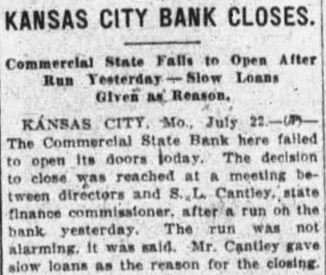 KANSAS CITY BANK CLOSES. State Falls to Open Run Given Reason. KANSAS July Commercial failed The its doors The meeting tween the was not bank as the for the closing