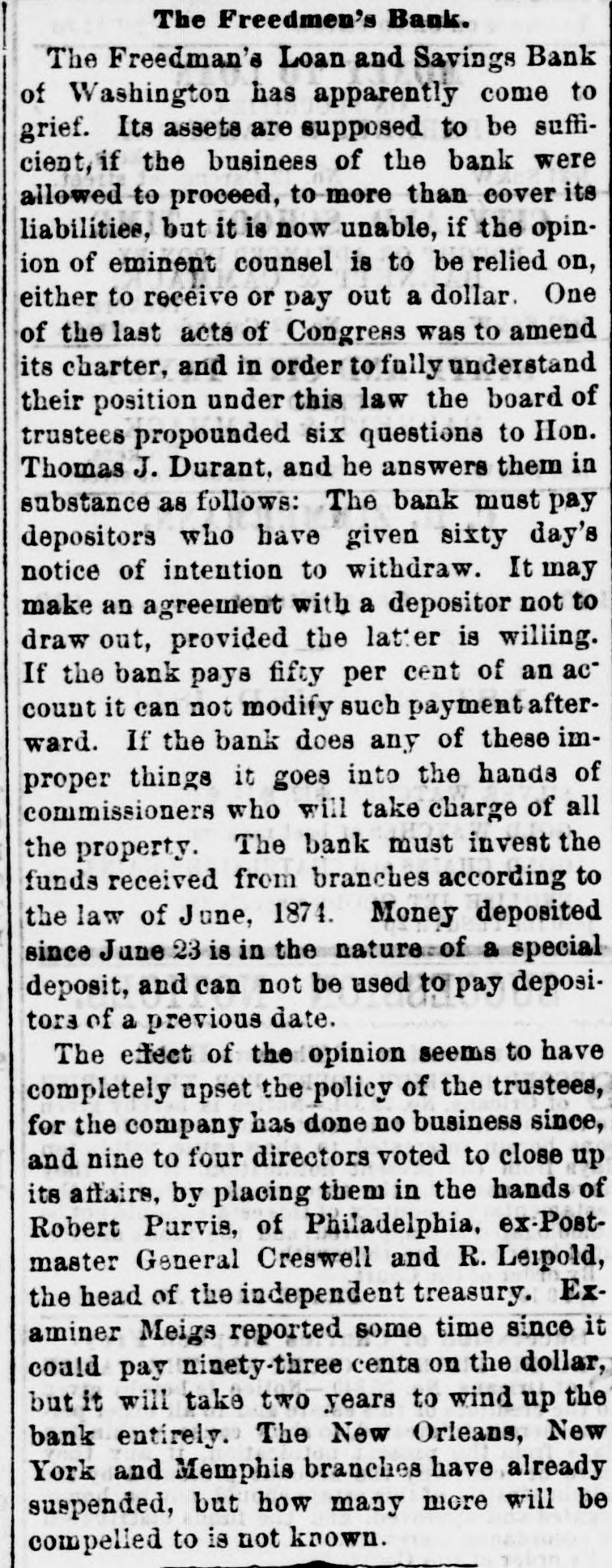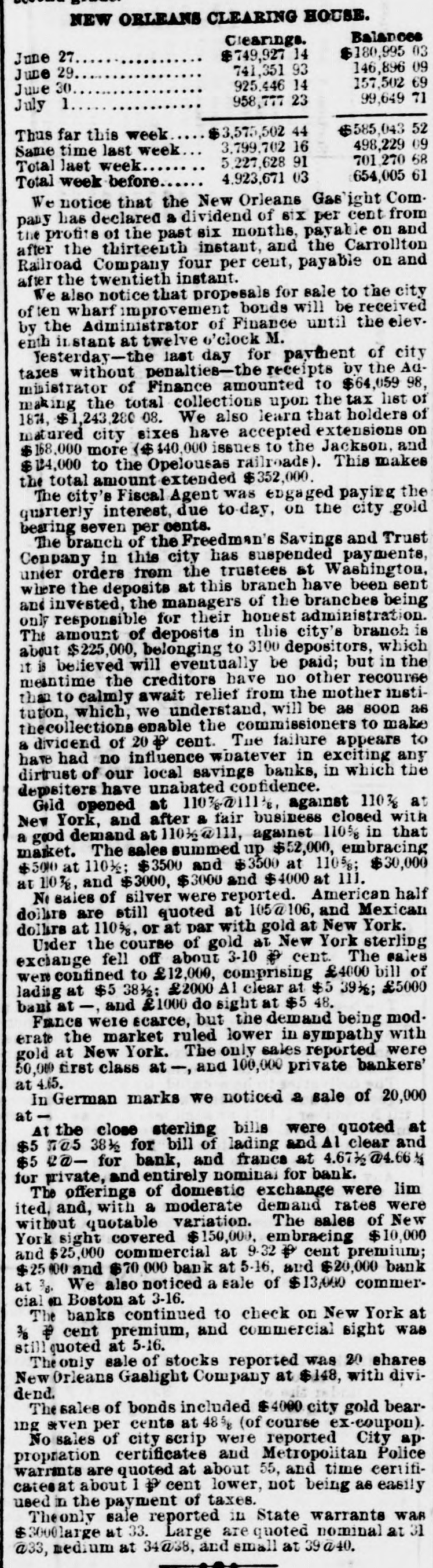 NEW ORLEANS CLEARING HOUSE. Balances Clearings. $180,995 03 $749,927 14 June 27 146,896 09 741,351 93 June 29 157,502 69 925.446 14 June 30 99,649 71 958,777 23 July 1 $585,043 52 $3,575,502 44 Thus far this week 498,229 09 3,799,702 16 Same time last week 701,270 68 5,227,628 91 Total last week 654,005 61 4,923,671 03 Total week before We notice that the New Orleans Gaslight Company has declared a dividend of six per cent from the profits of the past six months, payable on and after the thirteenth instant, and the Carrollton Railroad Company four per cent, payable on and after the twentieth instant. We also notice that propesals for sale to the city of ten wharf improvement bonds will be received by the Administrator of Finance until the elev. enth instant at twelve o'clock M. Testerday-the last day for payment of city taxes without penalties-the receipts by the Administrator of Finance amounted to $64,059 98, making the total collections upon the tax list of 1874, $1,243,280 08. We also learn that holders of matured city sixes have accepted extensions on $168,000 more ($ 440,000 issues to the Jackson. and $124,000 to the Opelousas railroads). This makes the total amount extended $352,000. The city's Fiscal Agent was engaged paying the quarterly interest, due to-day, on the city gold bearing seven per cents. The branch of the Freedman's Savings and Trust Conpany in this city has suspended payments, under orders from the trustees at Washington, where the deposits at this branch have been sent and invested, the managers of the branches being only responsible for their honest administration. The amount of deposits in this city's branch is about $225,000, belonging to 3100 depositors, which it is believed will eventually be paid; but in the meantime the creditors have no other recourse than to calmly await relief from the mother institution, which, we understand, will be as soon as thecollections enable the commissioners to make a dividend of 20 P cent. The failure appears to have had no influence whatever in exciting any dirtrust of our local savings banks, in which the depositers have unabated confidence. Gold opened at 110%@ill%, against 110 3/2 at New York, and after a fair business closed with a good demand at 110%@1111, against 110% in that maket. The sales summed up $52,000, embracing $5010 at 110½; $3500 and $3500 at 110%; $30,000 at 110%, and $3000, $3000 and $4000 at 111. No sales of silver were reported. American half dollars are still quoted at 105@106, and Mexican dollirs at 110%, or at par with gold at New York. Under the course of gold at New York sterling exchange fell off about 3-10 # cent. The sales were confined to £12,000, comprising £4000 bill of lading at $5 38½: £2000 Al clear at $5 39%; £5000 bank at -, and £1000 do sight at $5 48. Fancs were scarce, but the demand being moderate the market ruled lower in sympathy with gold at New York. The only sales reported were 50,000 first class at -, and 100,000 private bankers' at 4.65. In German marks we noticed a sale of 20,000 atAt the close sterling bills were quoted at $5 nas 38½ for bill of lading and Al clear and $5 R@- for bank, and france at 4.67½ for private, and entirely nominal for bank. The offerings of domestic exchange were lim ited, and, with a moderate demand rates were without quotable variation. The sales of New York sight covered $150,000, embracing $10,000 and $25,000 commercial at 9-32 ₱ cent premium; $25000 and $70,000 bank at 5-16, and $20,000 bank at 3. We also noticed a sale of $13,000 commercial on Boston at 3-16. The banks continued to check on New York at 3/8 # cent premium, and commercial sight was still quoted at 5-16. Theonly sale of stocks reported was 20 shares New Orleans Gaslight Company at $148, with dividend. The sales of bonds included $4000 city gold bearing seven per cents at 48% (of course ex-coupon). No sales of city scrip were reported City appropration certificates and Metropolitan Police warrints are quoted at about 55, and time certificatesat about 1 P cent lower, not being as easily used in the payment of taxes. Theonly sale reported in State warrants was $3000large at 33. Large are quoted nominal at 31 @33, medium at 34@38, and small at 39@40.