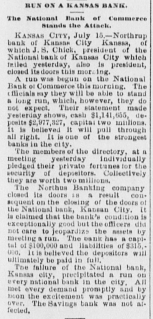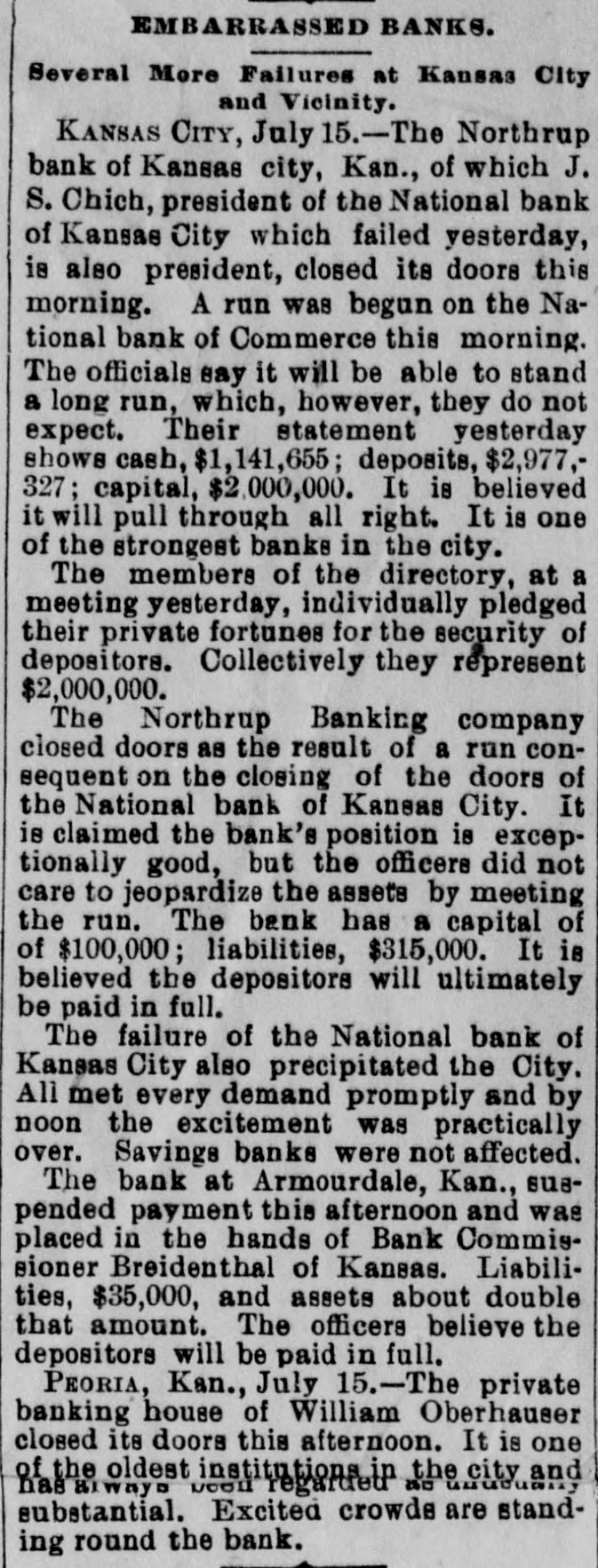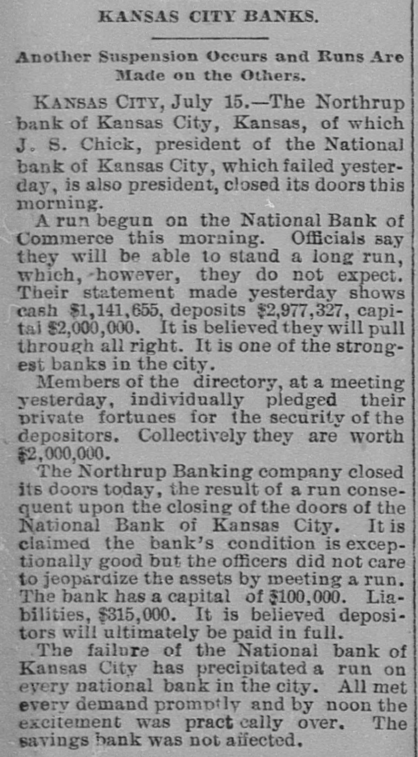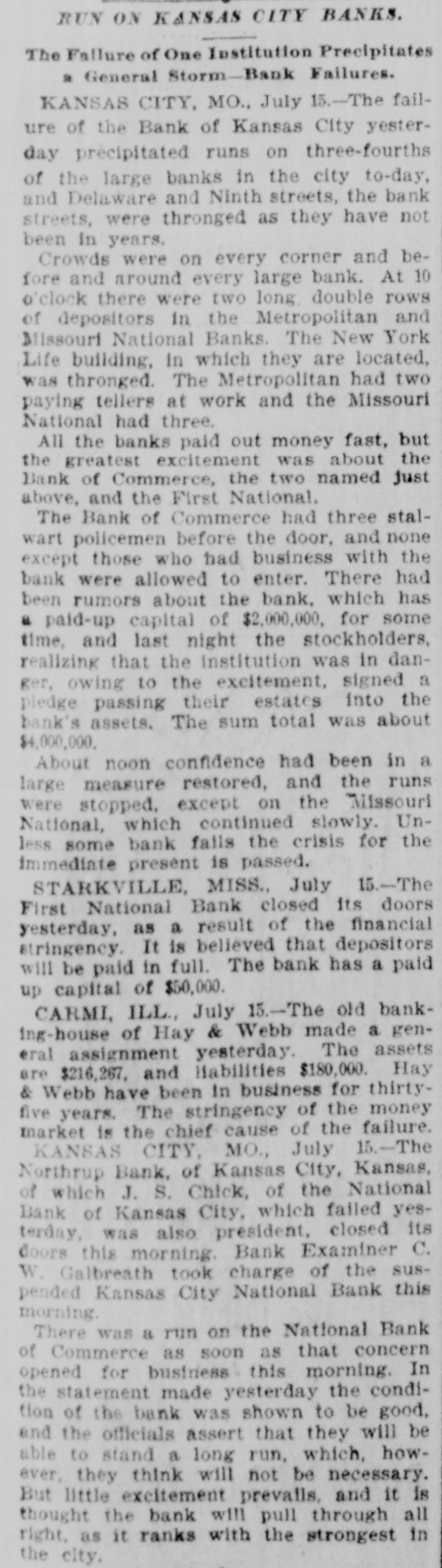 RUN ON KANSAS CITY BANKS. The Failure of One Institution Precipitates a General Storm-Bank Failures. KANSAS CITY, MO., July 15.-The failure of the Bank of Kansas City yesterday précipitated runs on three-fourths of the large banks in the city to-day, and Delaware and Ninth streets, the bank streets, were thronged as they have not been In years. Crowds were on every corner and before and around every large bank. At 10 o'clock there were two long double rows of depositors in the Metropolitan and Missouri National Banks. The New York Life building, In which they are located, was thronged. The Metropolitan had two paying tellers at work and the Missouri National had three. All the banks paid out money fast, but the greatest excitement was about the Bank of Commerce, the two named just above, and the First National. The Bank of Commerce had three stalwart policemen before the door, and none except those who had business with the bank were allowed to enter. There had been rumors about the bank, which has a paid-up capital of $2,000,000. for some time, and last night the stockholders, realizing that the institution was in danger, owing to the excitement, signed a pledge passing their estates into the bank's assets. The sum total was about $4,000,000. About noon confidence had been in a large measure restored, and the runs were stopped. except on the Missouri National, which continued slowly. Unless some bank falls the crisis for the Immediate present is passed. STARKVILLE, MISS., July 15.-The First National Bank closed its doors yesterday, as a result of the financial stringency. It is believed that depositors will be paid in full. The bank has a paid up capital of $50,000. CARMI, ILL., July 15.-The old banking-house of Hay & Webb made a general assignment yesterday. The assets are $216,267. and liabilities $180,000. Hay & Webb have been In business for thirtyfive years. The stringency of the money market is the chief cause of the failure. KANSAS CITY, MO., July 15.-The Northrup Bank, of Kansas City, Kansas, of which J. S. Chick, of the National Bank of Kansas City, which failed yesterday, was also president, closed its doors this morning. Bank Examiner C. W. Galbreath took charge of the suspended Kansas City National Bank this morning. There was a run on the National Bank of Commerce as soon as that concern opened for business this morning. In the statement made yesterday the condition of the bank was shown to be good, and the officials assert that they will be able to stand a long run, which, however, they think will not be necessary. But little excitement prevails, and it is thought the bank will pull through all right. as it ranks with the strongest in the city.