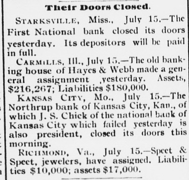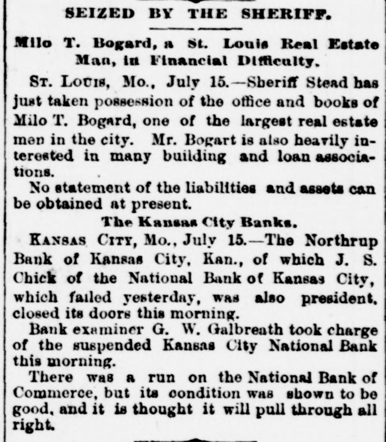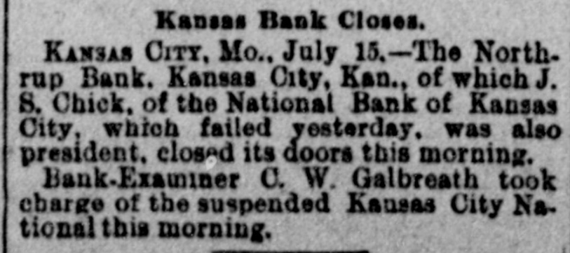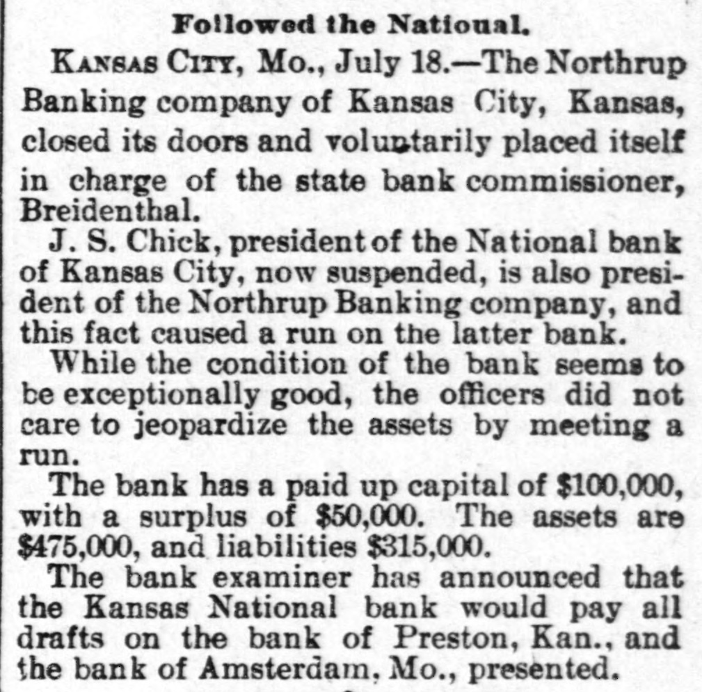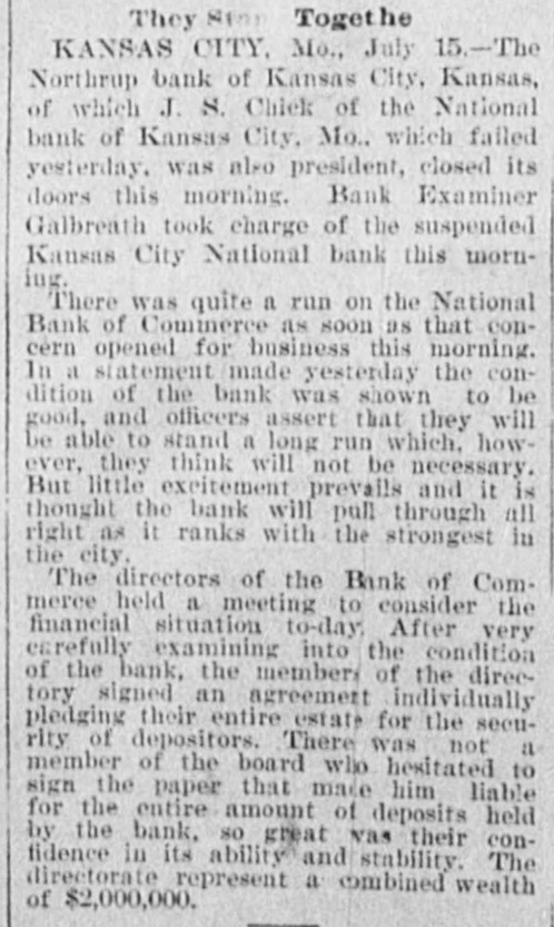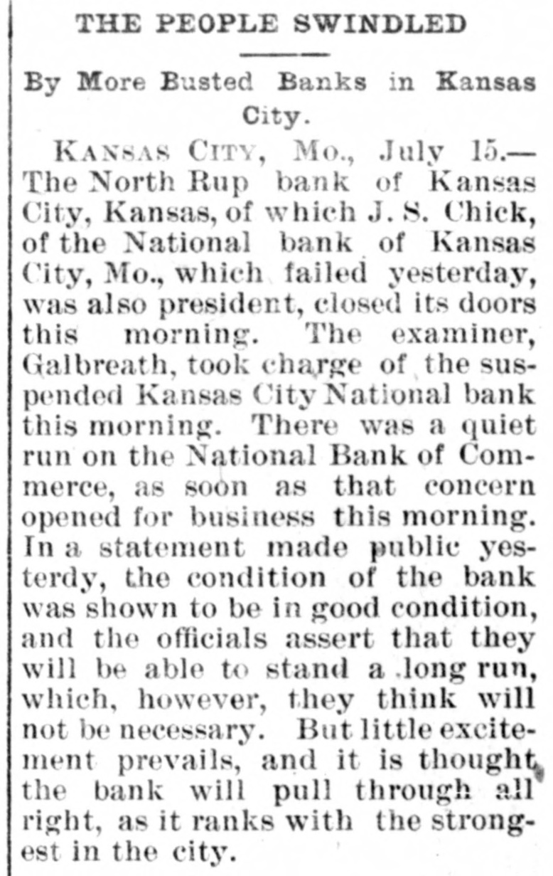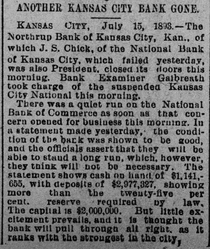 RUN ON KANSAS CITY BANKS. The Failure of One Institution Precipitates a General Storm-Bank Failures. KANSAS CITY, MO., July 15.-The failure of the Bank of Kansas City yesterday précipitated runs on three-fourths of the large banks in the city to-day, and Delaware and Ninth streets, the bank streets, were thronged as they have not been In years. Crowds were on every corner and before and around every large bank. At 10 o'clock there were two long double rows of depositors in the Metropolitan and Missouri National Banks. The New York Life building, In which they are located, was thronged. The Metropolitan had two paying tellers at work and the Missouri National had three. All the banks paid out money fast, but the greatest excitement was about the Bank of Commerce, the two named just above, and the First National. The Bank of Commerce had three stalwart policemen before the door, and none except those who had business with the bank were allowed to enter. There had been rumors about the bank, which has a paid-up capital of $2,000,000. for some time, and last night the stockholders, realizing that the institution was in danger, owing to the excitement, signed a pledge passing their estates into the bank's assets. The sum total was about $4,000,000. About noon confidence had been in a large measure restored, and the runs were stopped. except on the Missouri National, which continued slowly. Unless some bank falls the crisis for the Immediate present is passed. STARKVILLE, MISS., July 15.-The First National Bank closed its doors yesterday, as a result of the financial stringency. It is believed that depositors will be paid in full. The bank has a paid up capital of $50,000. CARMI, ILL., July 15.-The old banking-house of Hay & Webb made a general assignment yesterday. The assets are $216,267. and liabilities $180,000. Hay & Webb have been In business for thirtyfive years. The stringency of the money market is the chief cause of the failure. KANSAS CITY, MO., July 15.-The Northrup Bank, of Kansas City, Kansas, of which J. S. Chick, of the National Bank of Kansas City, which failed yesterday, was also president, closed its doors this morning. Bank Examiner C. W. Galbreath took charge of the suspended Kansas City National Bank this morning. There was a run on the National Bank of Commerce as soon as that concern opened for business this morning. In the statement made yesterday the condition of the bank was shown to be good, and the officials assert that they will be able to stand a long run, which, however, they think will not be necessary. But little excitement prevails, and it is thought the bank will pull through all right. as it ranks with the strongest in the city.