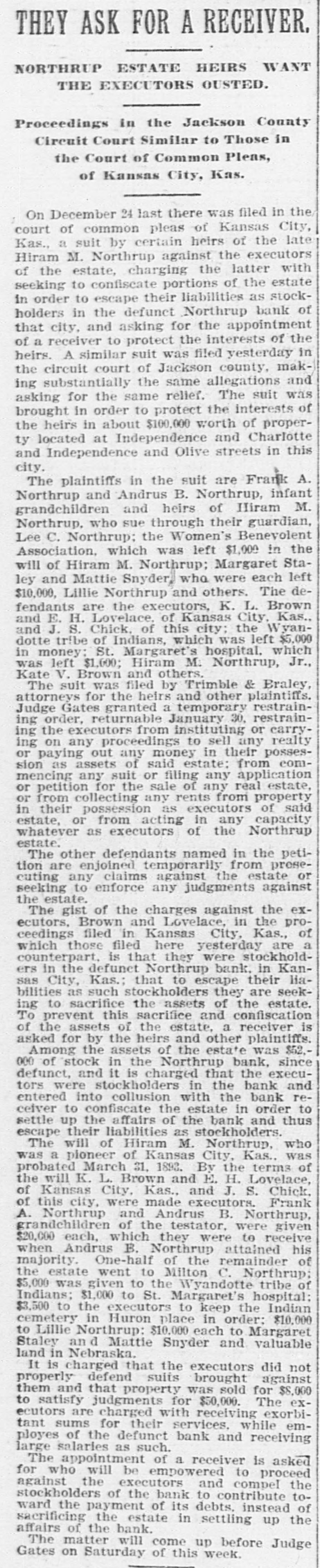 # THEY ASK FOR A RECEIVER. NORTHRUP ESTATE HEIRS WANT THE EXECUTORS OUSTED. Proceedings in the Jackson County Circuit Court Similar to Those in the Court of Common Pleas, of Kansas City, Kas. On December 24 last there was filed in the court of common pleas of Kansas City, Kas., a suit by certain heirs of the late Hiram M. Northrup against the executors of the estate, charging the latter with seeking to confiscate portions of the estate in order to escape their liabilities as stockholders in the defunct Northrup bank of that city, and asking for the appointment of a receiver to protect the interests of the heirs. A similar suit was filed yesterday in the circuit court of Jackson county, making substantially the same allegations and asking for the same relief. The suit was brought in order to protect the interests of the heirs in about $100,000 worth of property located at Independence and Charlotte and Independence and Olive streets in this city. The plaintiffs in the suit are Frank A. Northrup and Andrus B. Northrup, infant grandchildren and heirs of Hiram M. Northrup, who sue through their guardian, Lee C. Northrup; the Women's Benevolent Association, which was left $1,000 in the will of Hiram M. Northrup; Margaret Staley and Mattie Snyder who were each left $10,000, Lillie Northrup and others. The defendants are the executors, K. L. Brown and E. H. Lovelace, of Kansas City, Kas., and J. S. Chick, of this city; the Wyandotte tribe of Indians, which was left $5,000 in money: St. Margaret's hospital, which was left $1,600; Hiram M. Northrup, Jr., Kate V. Brown and others. The suit was filed by Trimble & Eraley, attorneys for the heirs and other plaintiffs. Judge Gates granted a temporary restraining order, returnable January 30, restraining the executors from instituting or carrying on any proceedings to sell any realty or paying out any money in their possession as assets of said estate; from commencing any suit or filing any application or petition for the sale of any real estate, or from collecting any rents from property in their possession as executors of said estate, or from acting in any capacity whatever as executors of the Northrup estate. The other defendants named in the petition are enjoined temporarily from prosecuting any claims against the estate or seeking to enforce any judgments against the estate. The gist of the charges against the executors, Brown and Lovelace, in the proceedings filed in Kansas City, Kas., of which those filed here yesterday are a counterpart, is that they were stockholders in the defunct Northrup bank, in Kansas City, Kas.; that to escape their liabilities as such stockholders they are seeking to sacrifice the assets of the estate. To prevent this sacrifice and confiscation of the assets of the estate, a receiver is asked for by the heirs and other plaintiffs. Among the assets of the estate was $52,000 of stock in the Northrup bank, since defunct, and it is charged that the executors were stockholders in the bank and entered into collusion with the bank receiver to confiscate the estate in order to settle up the affairs of the bank and thus escape their liabilities as stockholders. The will of Hiram M. Northrup, who was a pioneer of Kansas City, Kas., was probated March 31, 1893. By the terms of the will K. L. Brown and E. H. Lovelace, of Kansas City, Kas., and J. S. Chick, of this city, were made executors. Frank A. Northrup and Andrus B. Northrup, grandchildren of the testator, were given $20,000 each, which they were to receive when Andrus B. Northrup attained his majority. One-half of the remainder of the estate went to Milton C. Northrup; $5,000 was given to the Wyandotte tribe of Indians; $1,000 to St. Margaret's hospital; $3,500 to the executors to keep the Indian cemetery in Huron place in order; $10,000 to Lillie Northrup; $10,000 each to Margaret Staley and Mattie Snyder and valuable land in Nebraska. It is charged that the executors did not properly defend suits brought against them and that property was sold for $8,000 to satisfy judgments for $50,000. The executors are charged with receiving exorbitant sums for their services, while employes of the defunct bank and receiving large salaries as such. The appointment of a receiver is asked for who will be empowered to proceed against the executors and compel the stockholders of the bank to contribute toward the payment of its debts, instead of sacrificing the estate in settling up the affairs of the bank. The matter will come up before Judge Gates on Saturday of this week.