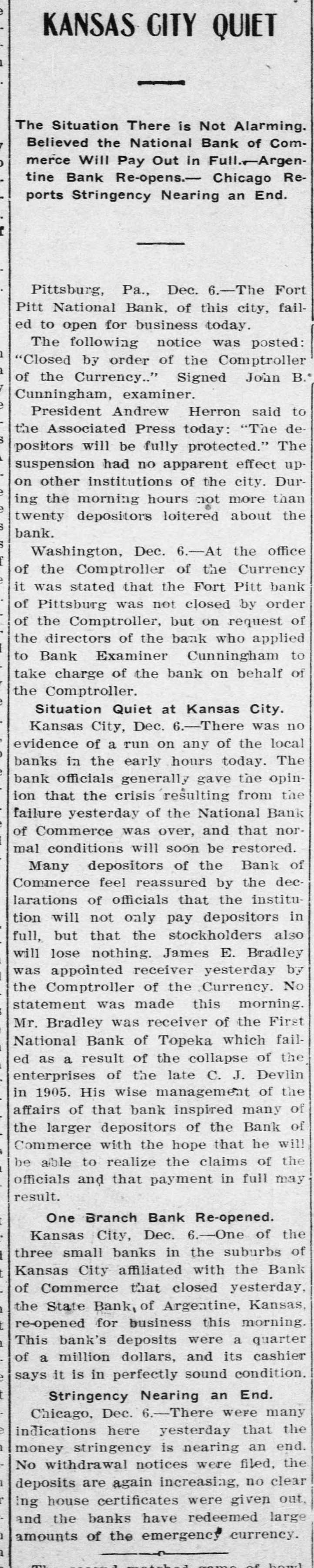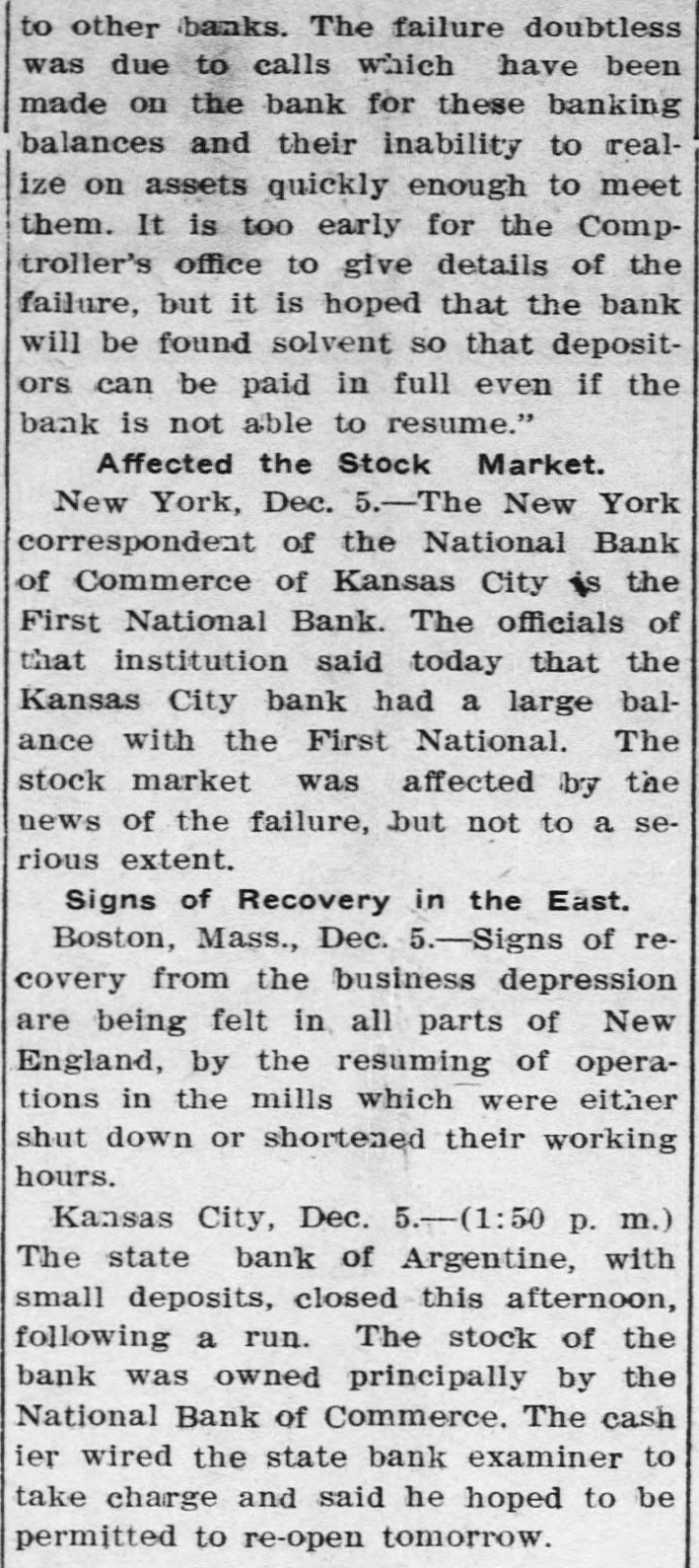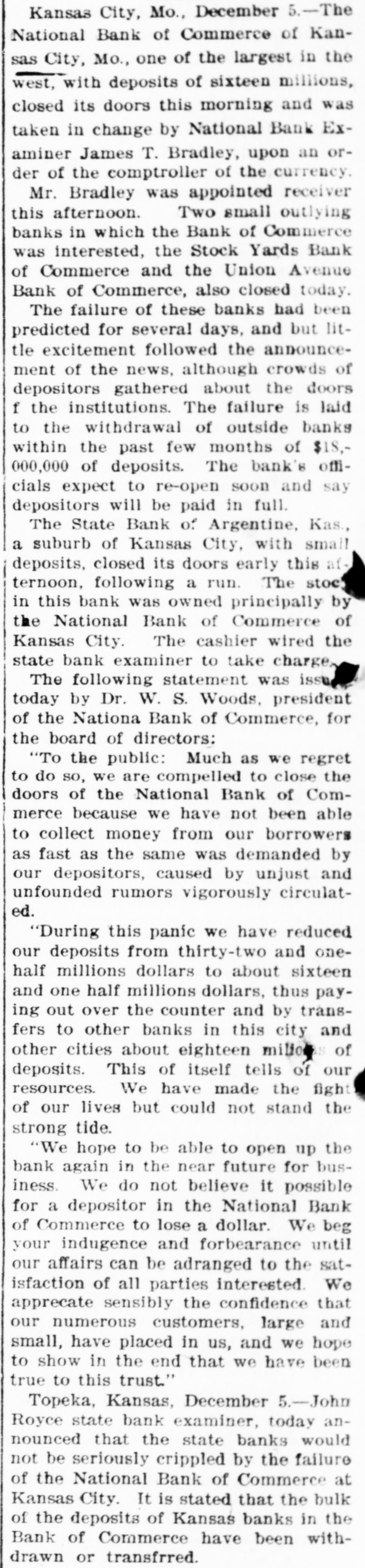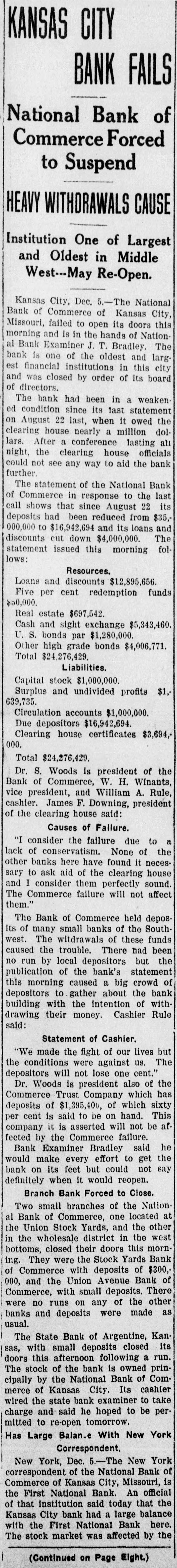 me National Bank or omneice appeared in the morning papers it showed since the statement of Aug. 22 last deposits had been reduced from close to $35,000,000 to $16,953,000. The statement showed also the item of loans and discounts had been cut down $4,000,000. Leading Men Interested. The principal officers of the National S. Bank of Commerce are: Dr. W. Woods, president; W. H. Winants, vice president, and William A. Rule, cashier, Its directors and stockholders include some of the most prominent men in the city. Woods is also president of the Commerce Trust company of Kansas City which nas a capital of $1.000,000 and deposits of $1,396,000. Since its last statement the deposits of the trust company have increased nearly $200,000, and that institution is believed to be in a sound condition. Others Not Affected. James F. Downing, head of the local clearing house association, expressed the belief the failure of the Commerce would not involve deeply any other Kansas City institution, and that the other local banks would be able to weather the storm, The Commerce held the deposits of numerous small banks in this part of the southwest. What effect this failure will have upon them is problematic Outside Banks Cause Trouble. There has been no run by local depositors, but many outside banks caused trouble by withdrawing their funds on deposit with the Commerce. The Commerce was a United States depository and was interested in many local enterprises. Its individual depositors were among the largest of any bank in the city. Its statement printed this morning showing a heavy falling off in deposits drew a big crowd of depositors to the bank early, evidently intent upon drawing their money. More or less excitement followed the news that the bank had Deen closed, and the crowd gradually grew in size until it stopped traffic. Cashier Makes Statement. William A. Rule, cashier of the bank, made the following statement this morning in the presence of President Woods and two directors: Name National Bank-ofCommerce thought it best to at least close temporarily We made the fight of our lives, but conditions were against us. Depositors will not lose a cent." Woods acquiesced in what the cash ier said, Statement as Published. The statement issued today follows: I Resources - Loans and discounts $12,899,000; real estate, $689,000; 5 per cent redemption fund, $50,000; cash, sight exchange, United States bonds, and other high grade bonds, $10,630, 000. Total, $24,277,000. D Liabilities-Capital stock. $1,000,000; surplus and undivided profits, $1,640, 000; circulation account, $1,000,000; d due depositors, $16,943,000; clearing house certificates, $3,694,000. Total $24,277,000. Two Branches Shut Doors. Two small branches of the National rBank of Commerce also closed their to doors this morning. They were the al Stock Yards Bank of Commerce, det. posits of $300,000, and the Union Avenue Bank of Commerce, with small n deposits. There was no especial exat citement around these institutions The failure of the banks failed to cause y a run on any of the other banks and on at most of the other institutions de SS posits were made as usual. Another Small One Caught. Kansas City, Mo., Dec. 5.-The State d Bank of Argentine, a Kansas City su eburb. with small deposits, closed its ordoors early this afternoon following run. The stock of the bank was to at owned principally by the Nationa Bank of Commerce of Kansas City. erChicago Banks Debtors. reChicago, Ill., Dec. 5.-President For ial gan, chairman of the Chicago clearing house committee, said the failure o es, re the no would Kansas have City effect Bank upon of Commerce Chicago banks for the reason Chicago bank: with which it has accounts are al 1ddebtors to the Kansas City institution nd th Has Deposits in New York. at New York, Dec. 5.-The New Yor am correspondent of the National Bank o beCommerce of Kansas City is the Firs National bank. An official of that in lly uld stitution said today the Kansas Cit bank had a large credit balance wit Ily the First National. The stock marke in was affected by news of the failure but not to a serious extent. as lue Does Not Change Rate. ayLondon, Dec. 5.-The rate of discour of of the Bank of England remained un of changed today at 7 per cent. New England Factories Reopen. Boston, Dec. 5.-Signs of recover the from the business depression whic en started several weeks ago are bein unin of New England b