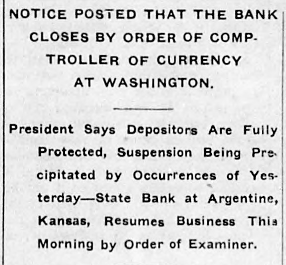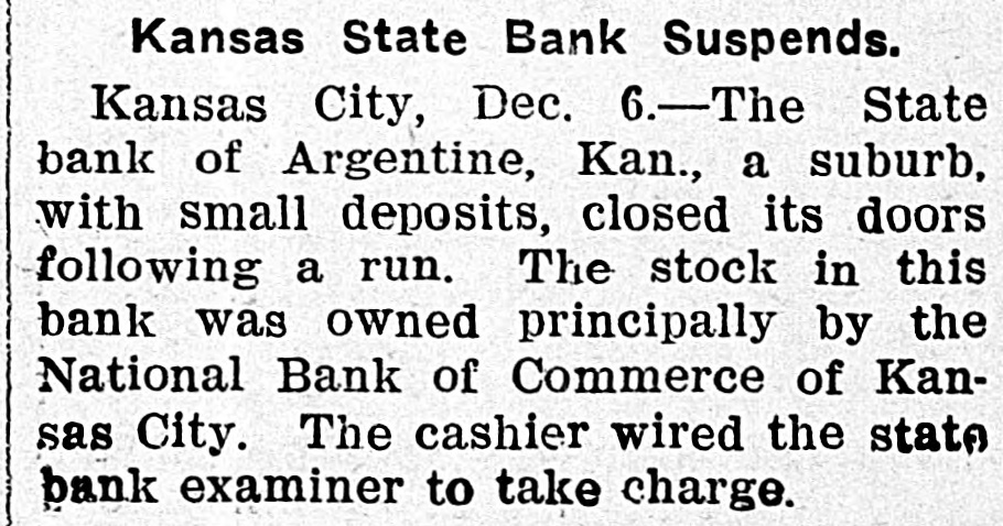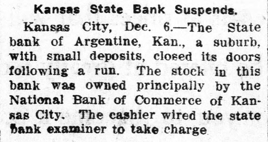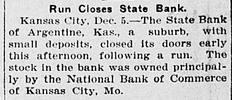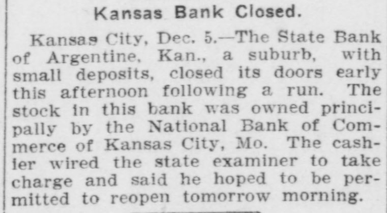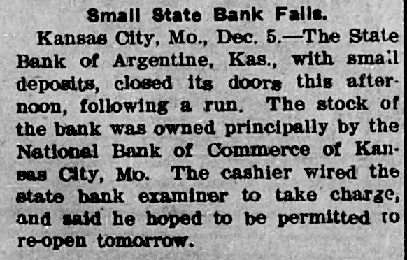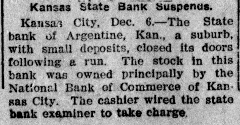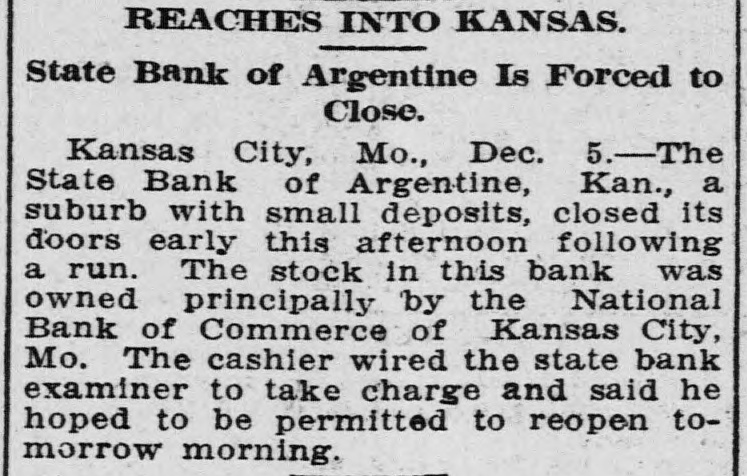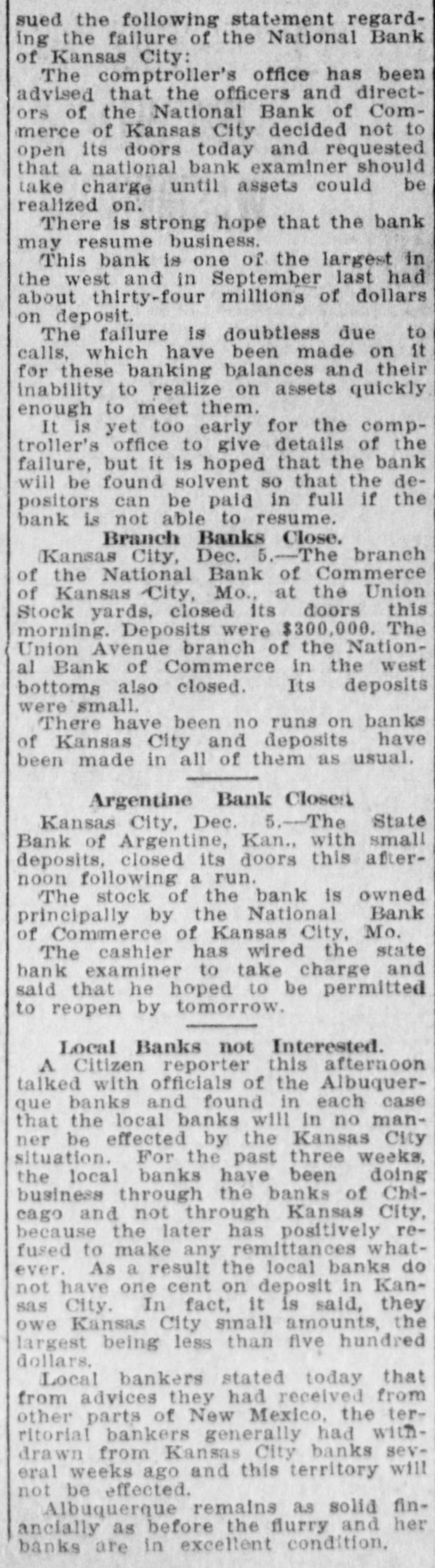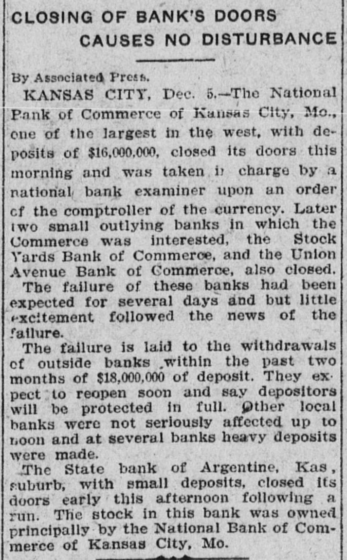 me National Bank or omneice appeared in the morning papers it showed since the statement of Aug. 22 last deposits had been reduced from close to $35,000,000 to $16,953,000. The statement showed also the item of loans and discounts had been cut down $4,000,000. Leading Men Interested. The principal officers of the National S. Bank of Commerce are: Dr. W. Woods, president; W. H. Winants, vice president, and William A. Rule, cashier, Its directors and stockholders include some of the most prominent men in the city. Woods is also president of the Commerce Trust company of Kansas City which nas a capital of $1.000,000 and deposits of $1,396,000. Since its last statement the deposits of the trust company have increased nearly $200,000, and that institution is believed to be in a sound condition. Others Not Affected. James F. Downing, head of the local clearing house association, expressed the belief the failure of the Commerce would not involve deeply any other Kansas City institution, and that the other local banks would be able to weather the storm, The Commerce held the deposits of numerous small banks in this part of the southwest. What effect this failure will have upon them is problematic Outside Banks Cause Trouble. There has been no run by local depositors, but many outside banks caused trouble by withdrawing their funds on deposit with the Commerce. The Commerce was a United States depository and was interested in many local enterprises. Its individual depositors were among the largest of any bank in the city. Its statement printed this morning showing a heavy falling off in deposits drew a big crowd of depositors to the bank early, evidently intent upon drawing their money. More or less excitement followed the news that the bank had Deen closed, and the crowd gradually grew in size until it stopped traffic. Cashier Makes Statement. William A. Rule, cashier of the bank, made the following statement this morning in the presence of President Woods and two directors: Name National Bank-ofCommerce thought it best to at least close temporarily We made the fight of our lives, but conditions were against us. Depositors will not lose a cent." Woods acquiesced in what the cash ier said, Statement as Published. The statement issued today follows: I Resources - Loans and discounts $12,899,000; real estate, $689,000; 5 per cent redemption fund, $50,000; cash, sight exchange, United States bonds, and other high grade bonds, $10,630, 000. Total, $24,277,000. D Liabilities-Capital stock. $1,000,000; surplus and undivided profits, $1,640, 000; circulation account, $1,000,000; d due depositors, $16,943,000; clearing house certificates, $3,694,000. Total $24,277,000. Two Branches Shut Doors. Two small branches of the National rBank of Commerce also closed their to doors this morning. They were the al Stock Yards Bank of Commerce, det. posits of $300,000, and the Union Avenue Bank of Commerce, with small n deposits. There was no especial exat citement around these institutions The failure of the banks failed to cause y a run on any of the other banks and on at most of the other institutions de SS posits were made as usual. Another Small One Caught. Kansas City, Mo., Dec. 5.-The State d Bank of Argentine, a Kansas City su eburb. with small deposits, closed its ordoors early this afternoon following run. The stock of the bank was to at owned principally by the Nationa Bank of Commerce of Kansas City. erChicago Banks Debtors. reChicago, Ill., Dec. 5.-President For ial gan, chairman of the Chicago clearing house committee, said the failure o es, re the no would Kansas have City effect Bank upon of Commerce Chicago banks for the reason Chicago bank: with which it has accounts are al 1ddebtors to the Kansas City institution nd th Has Deposits in New York. at New York, Dec. 5.-The New Yor am correspondent of the National Bank o beCommerce of Kansas City is the Firs National bank. An official of that in lly uld stitution said today the Kansas Cit bank had a large credit balance wit Ily the First National. The stock marke in was affected by news of the failure but not to a serious extent. as lue Does Not Change Rate. ayLondon, Dec. 5.-The rate of discour of of the Bank of England remained un of changed today at 7 per cent. New England Factories Reopen. Boston, Dec. 5.-Signs of recover the from the business depression whic en started several weeks ago are bein unin of New England b